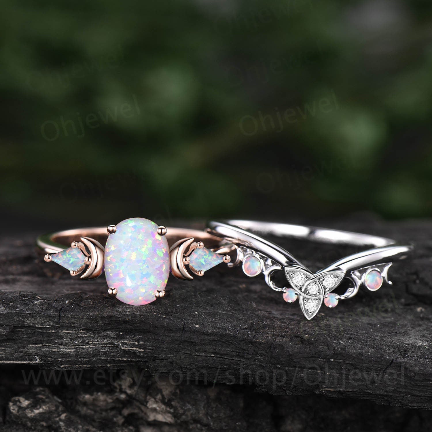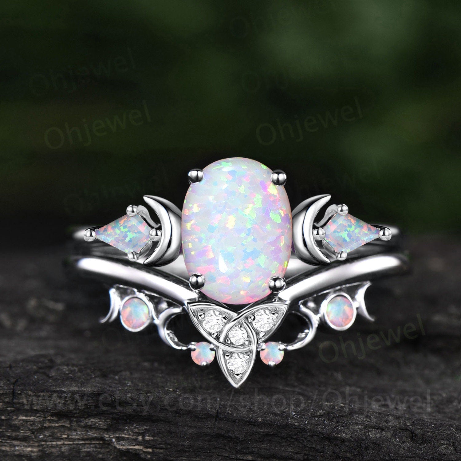 Oval white opal ring rose gold three stone moon unique engagement ring kite opal ring silver celtic knot wedding band women gift jewelry
