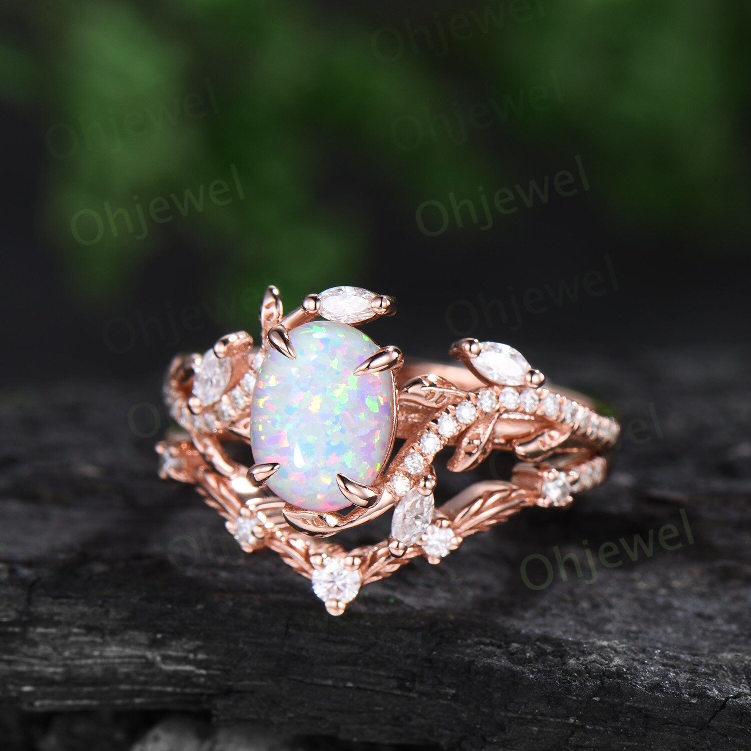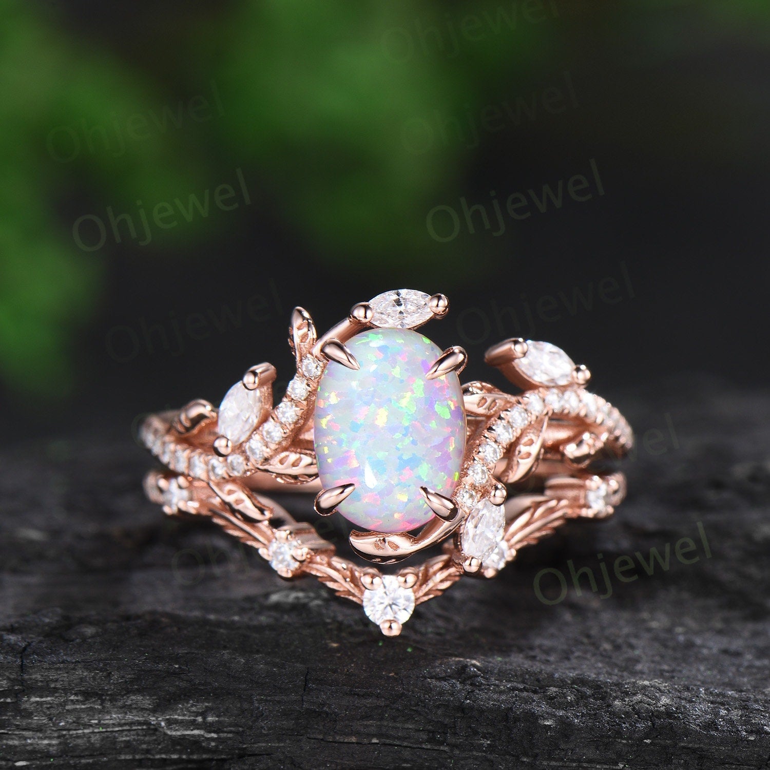 Oval white opal ring vintage rose gold leaf nature inspired unique engagement ring half eternity diamond anniversary ring set gift for women