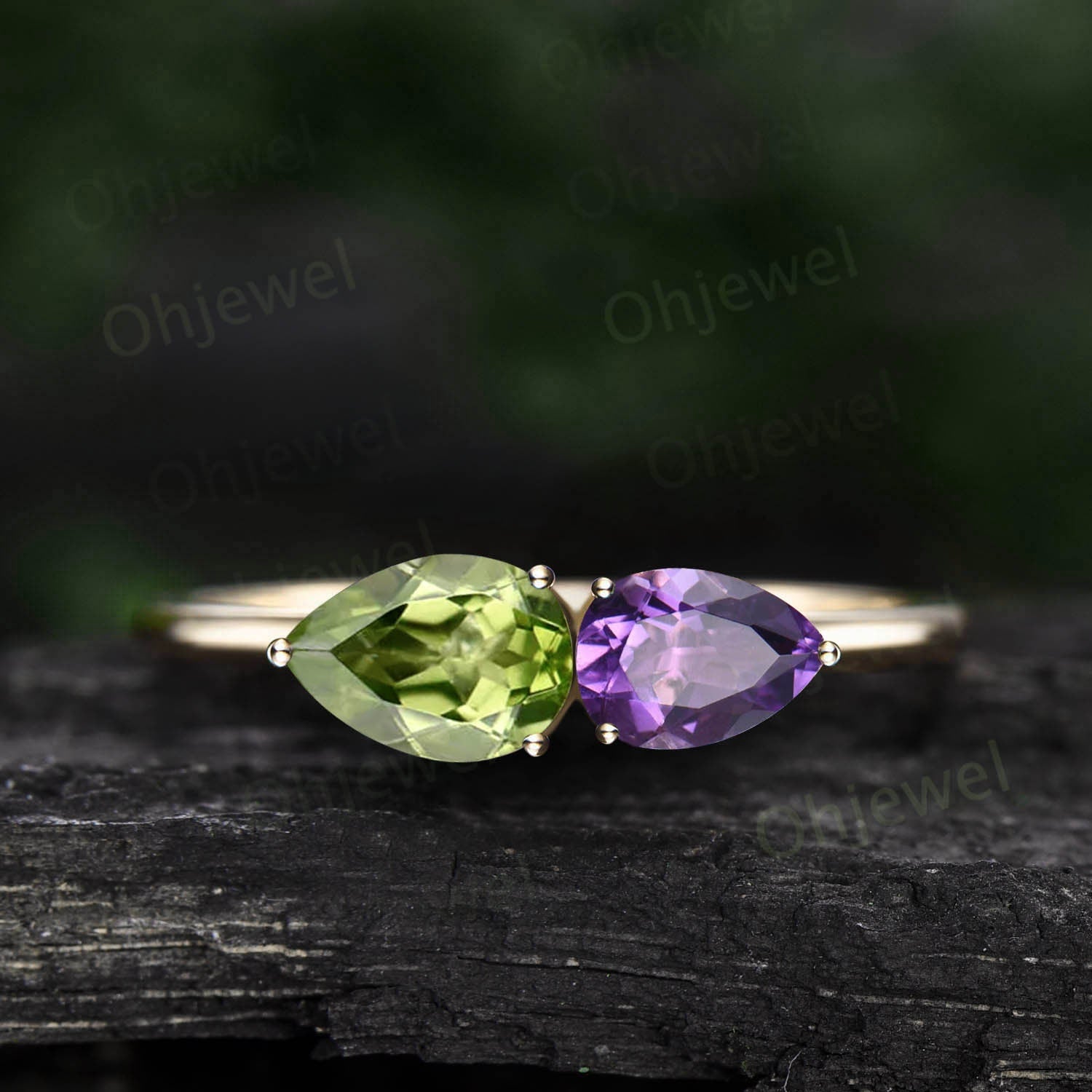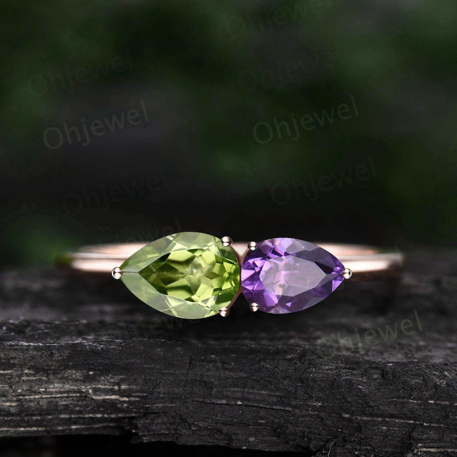 Pear amethyst ring dainty peridot ring rose gold two stone ring unique east to west engagement ring women gemstone ring 925 sterling silver