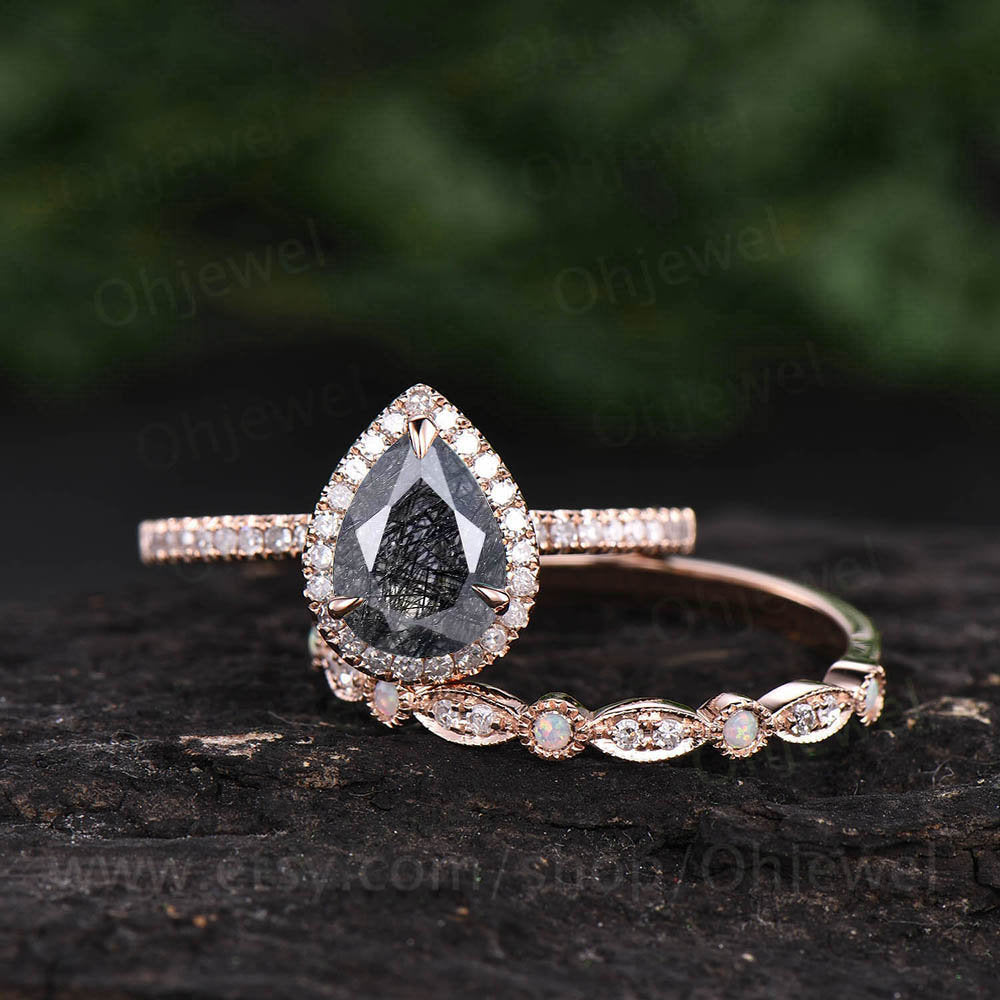 Pear black rutilated quartz engagement ring set vintage opal ring solid rose gold unique diamond ring wedding bridal set anniversary gift