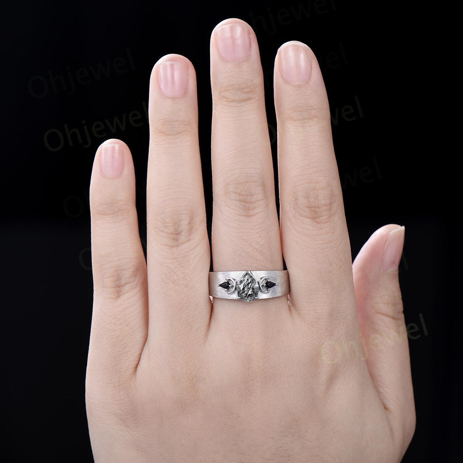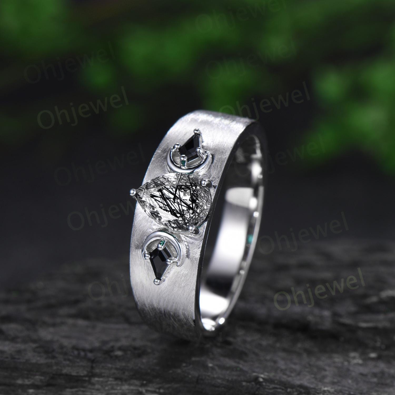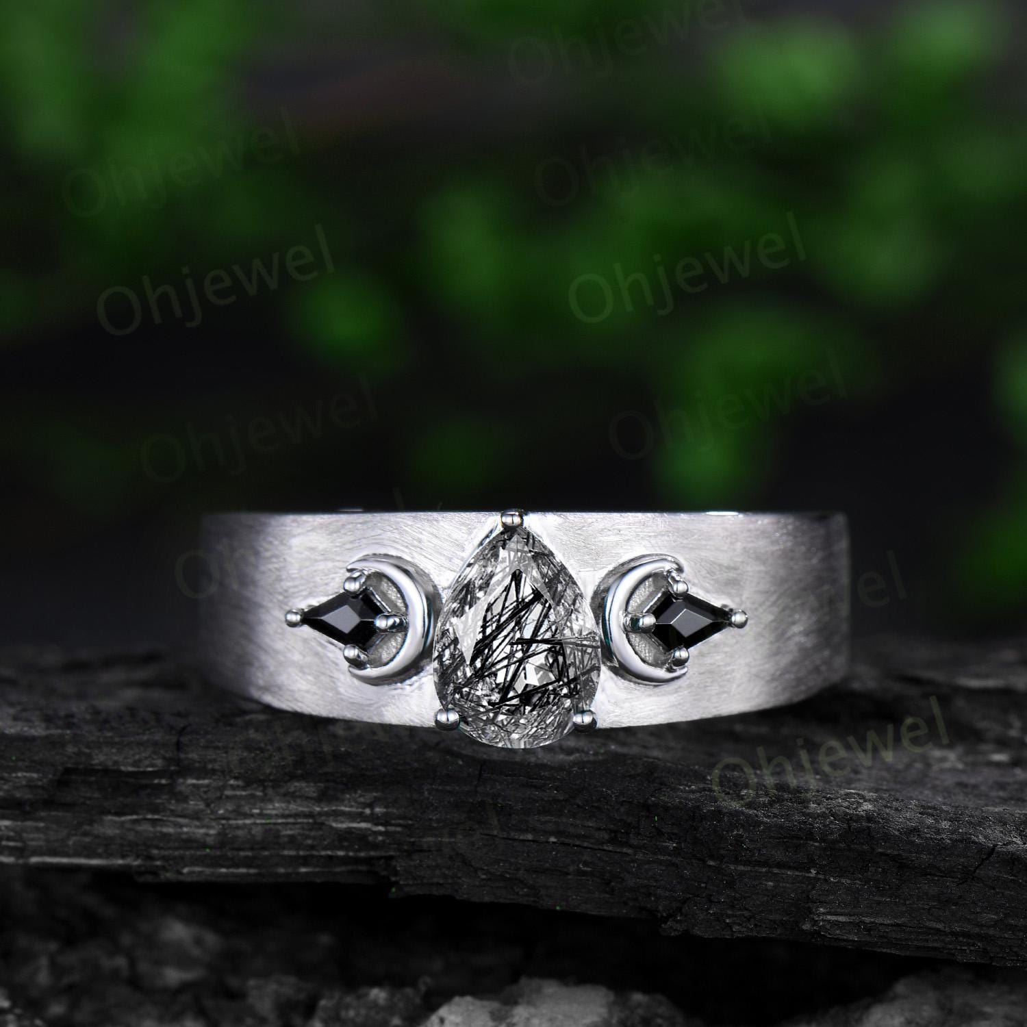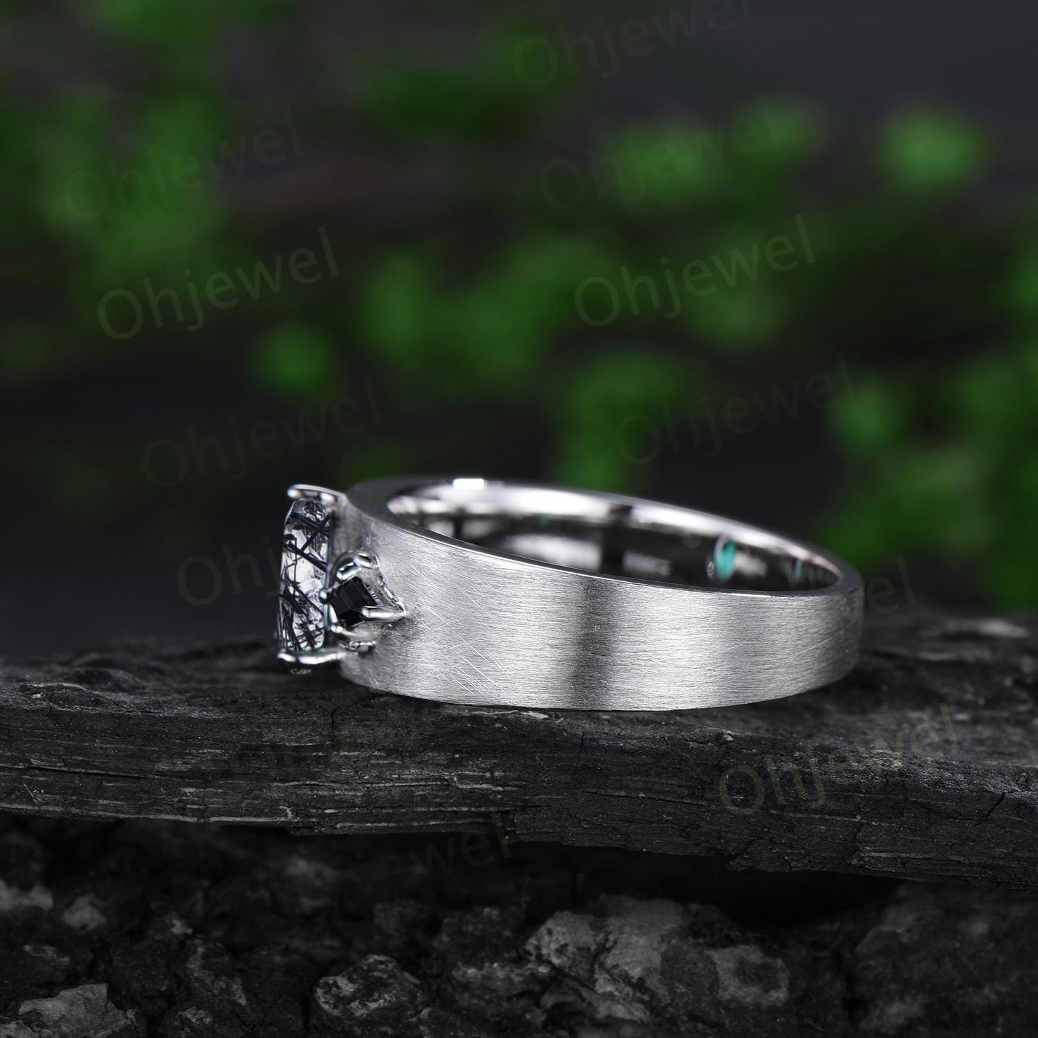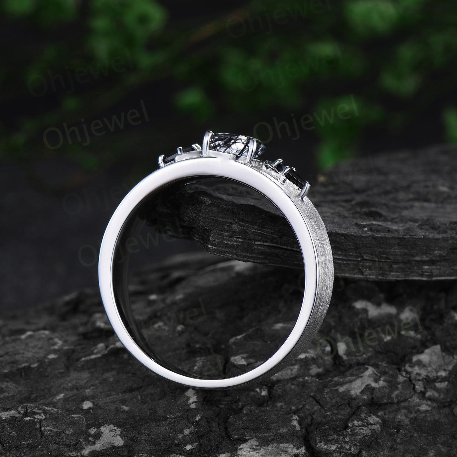 Pear black rutilated quartz mens wedding band three stone moon kite black spinel wedding ring 14k white gold anniversary gift for husband