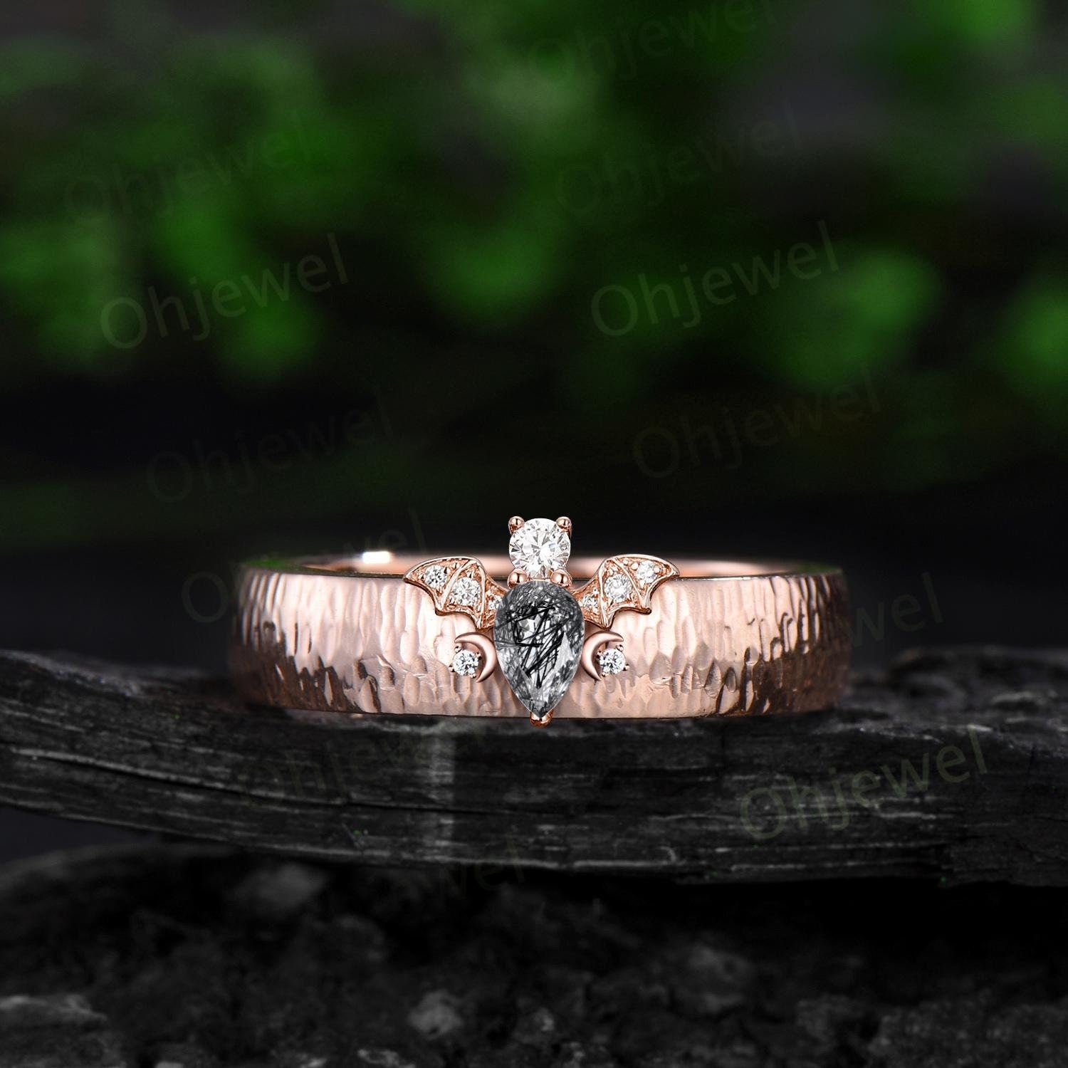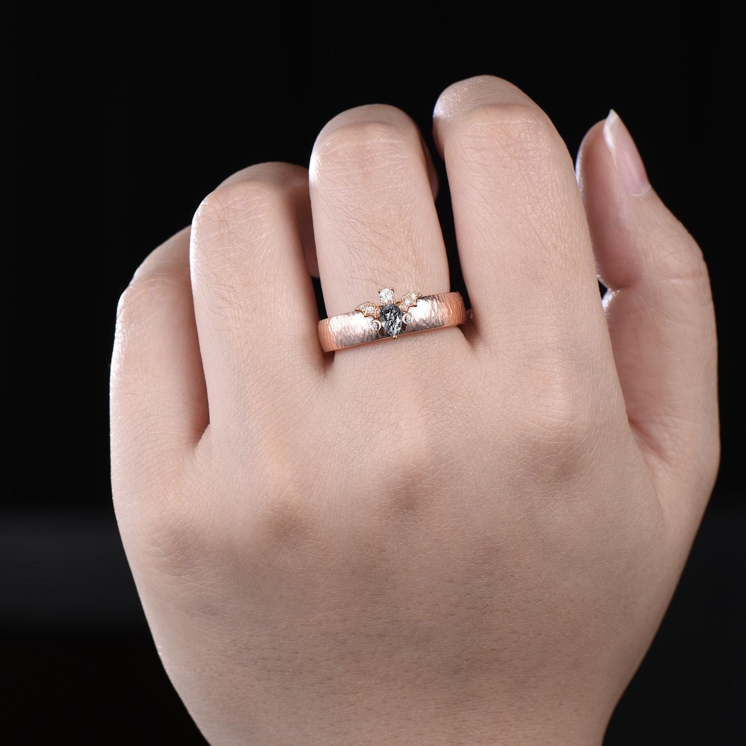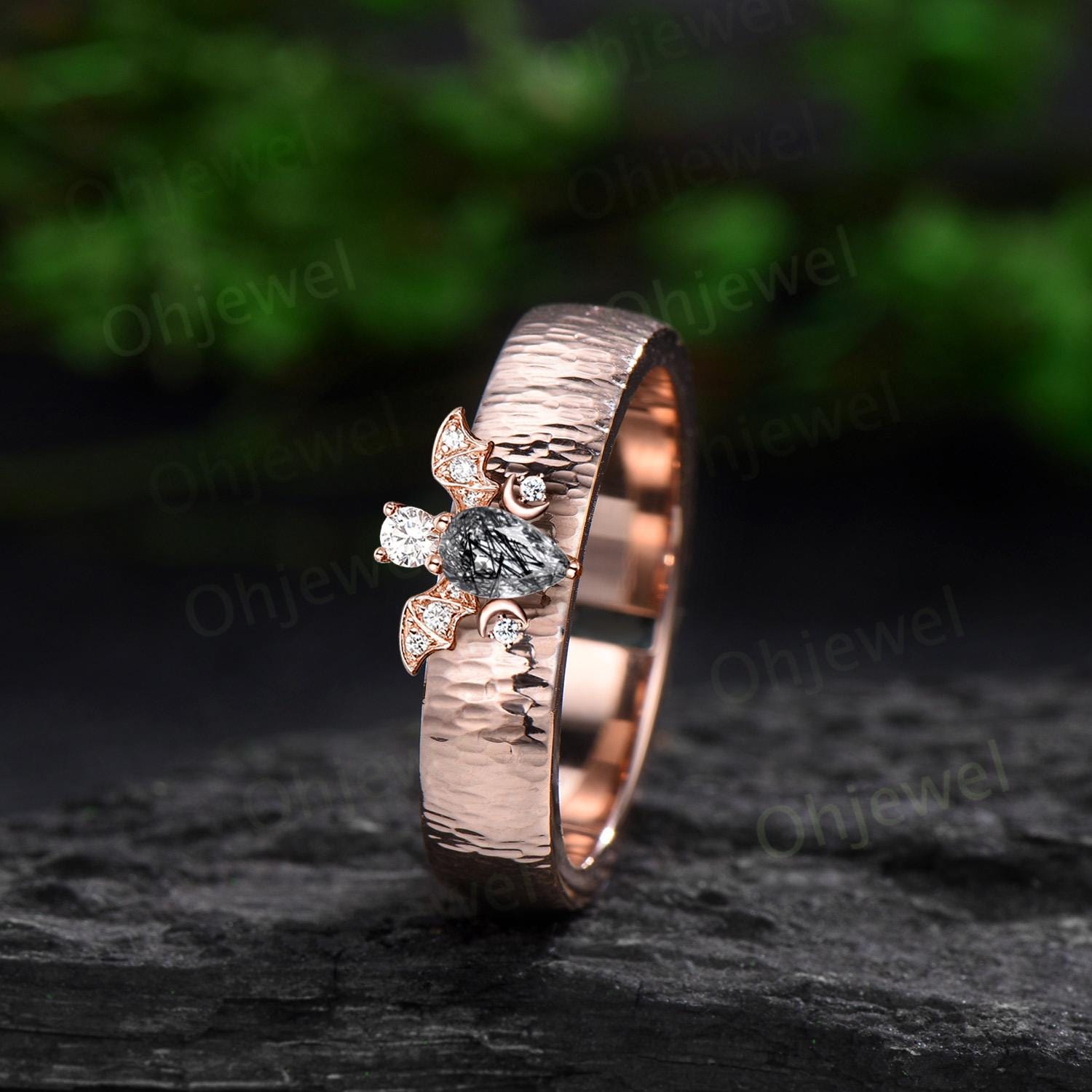 Pear black rutilated quartz mens wedding band vintage hammered bat moon diamond mens wedding ring stacking 14k rose gold gift for husband