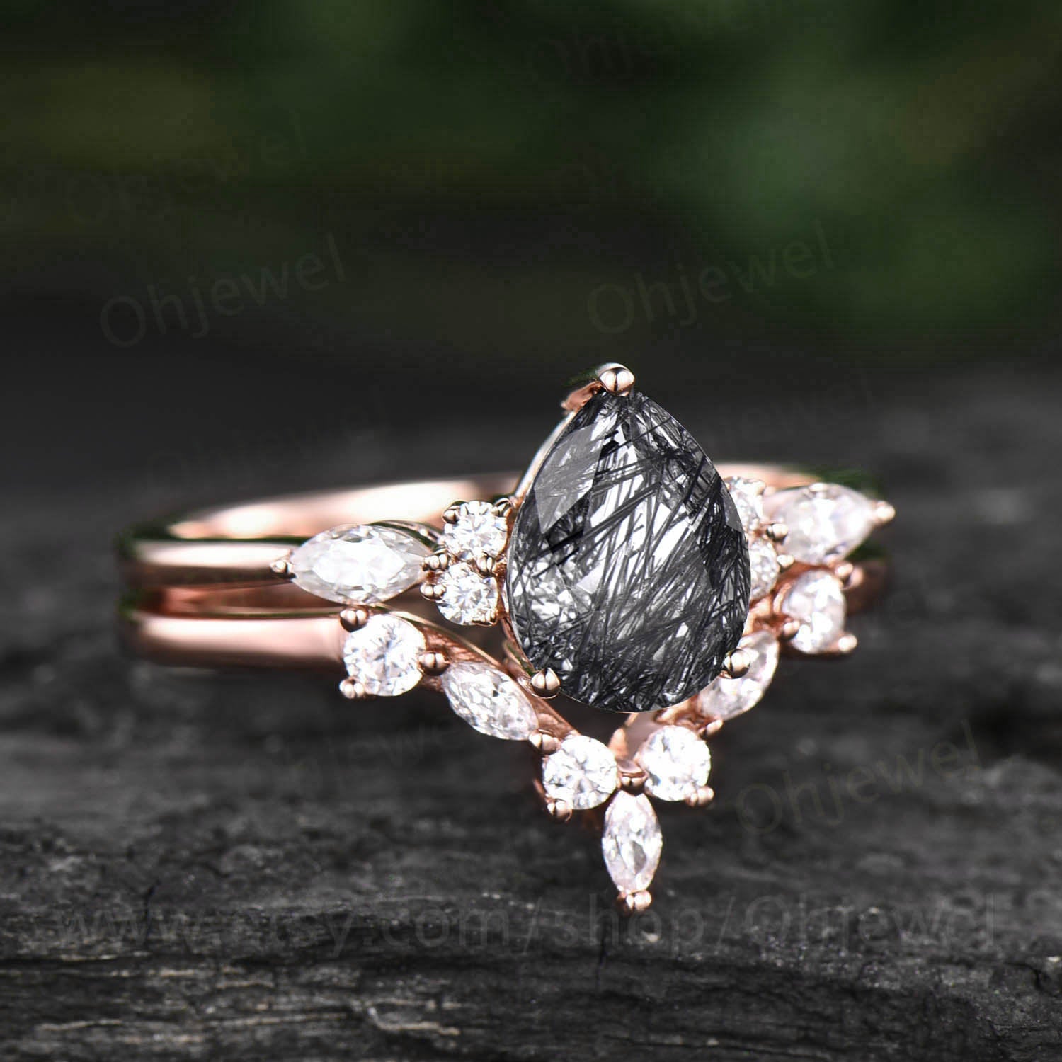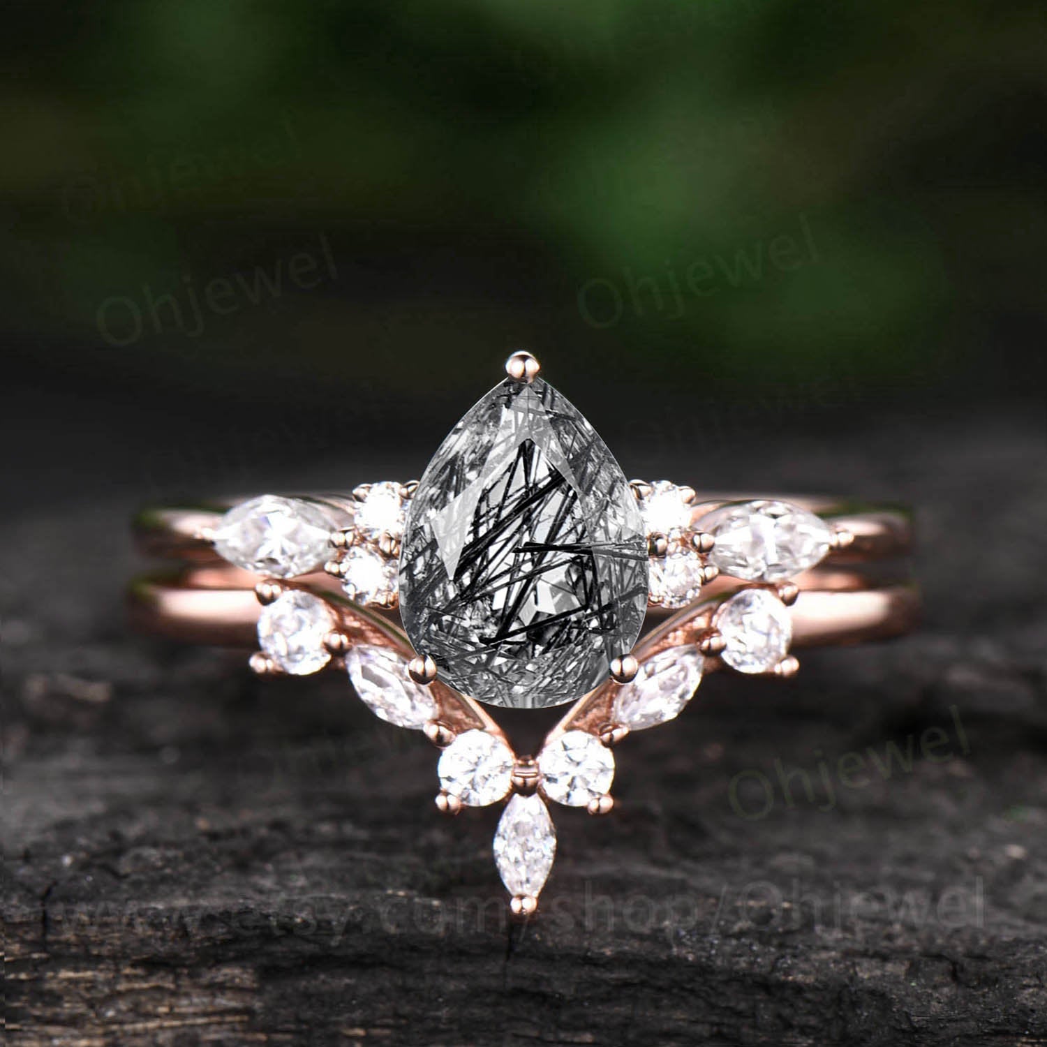 Pear cut black rutilated quartz engagement ring set art deco rose gold silver ring vintage dainty moissanite bridal wedding ring set women