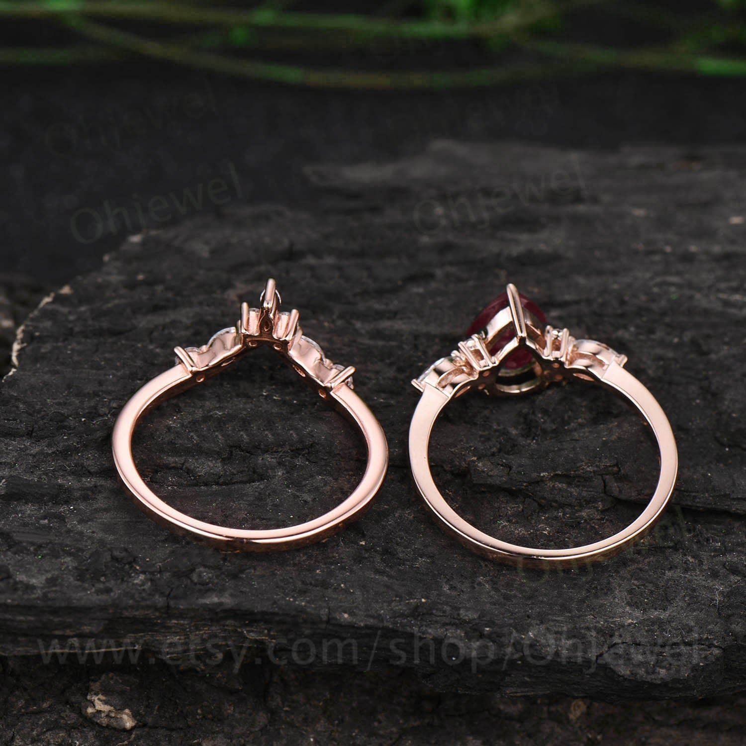 Pear cut garnet engagement ring set vintage garnet ring gold sterling silver for women marquise moissanite ring set 7 stone ring bridal set