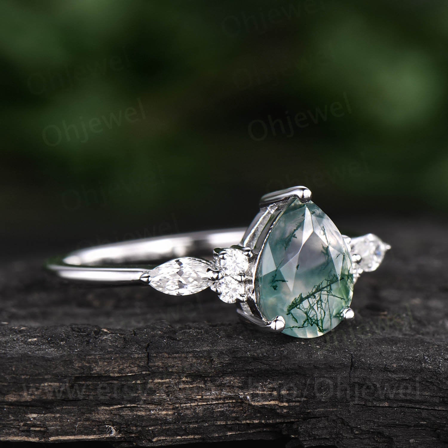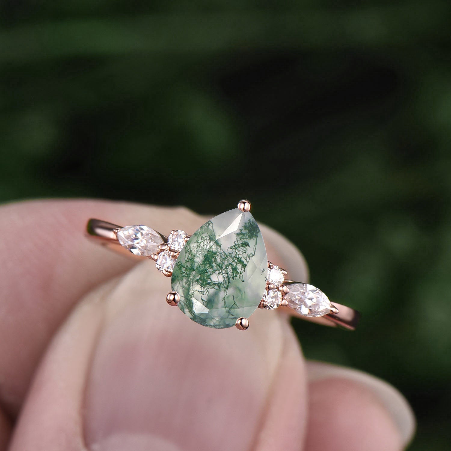 Pear moss agate ring vintage moss agate engagement ring 7 stone moissanite ring rose gold for women art deco dainty jewelry bridal ring gift