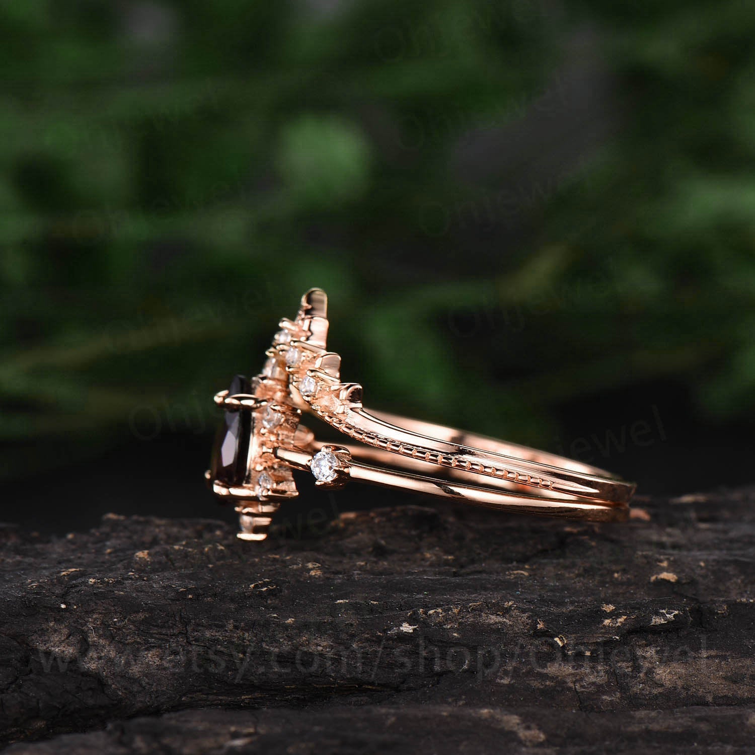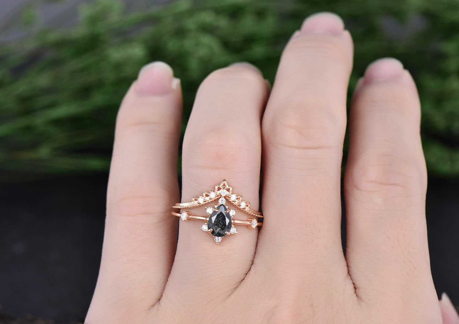 Pear Shaped Black Rutilated Quartz Engagement Ring Rose Gold Women Vintage Bridal Set Unique Moissanite Ring Wedding band Anniversary Gift