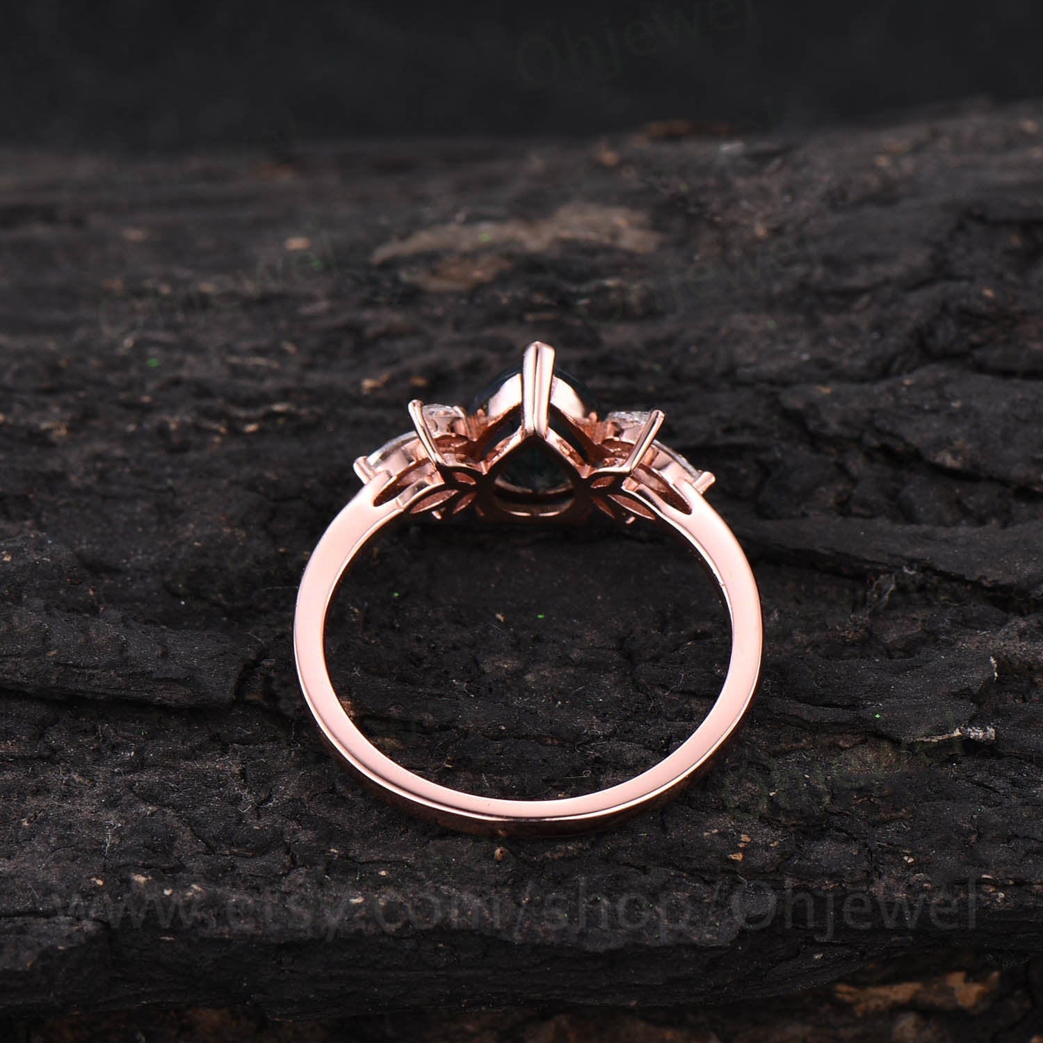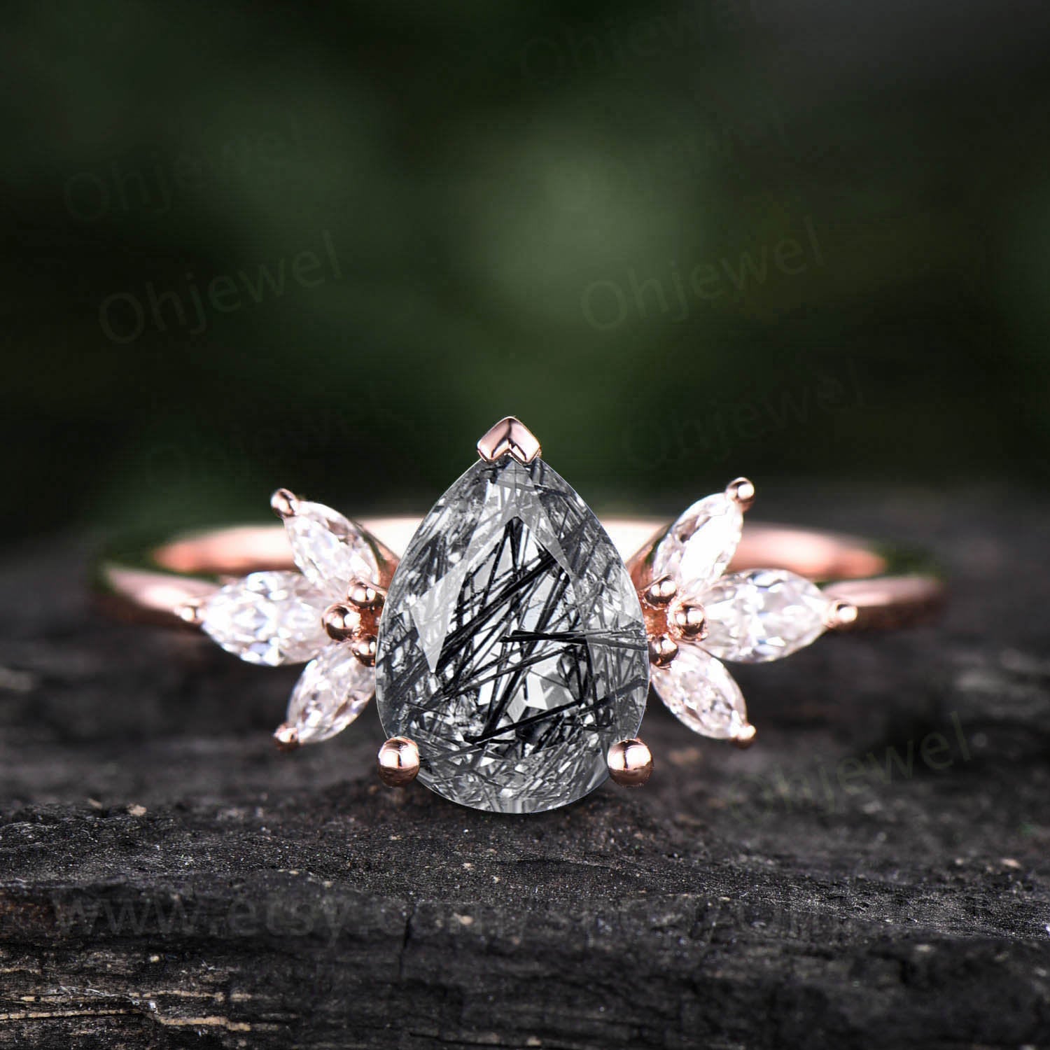 Pear shaped black rutilated quartz engagement ring vintage 7 stone rose gold ring art deco moissanite ring unique bridal ring for women gift