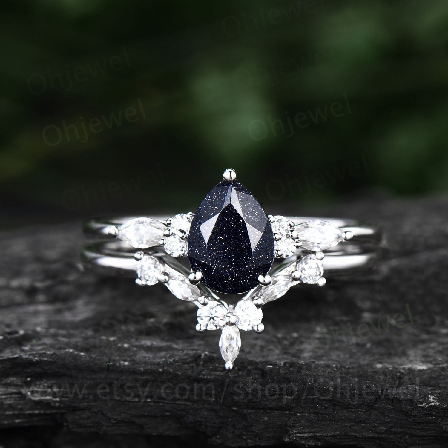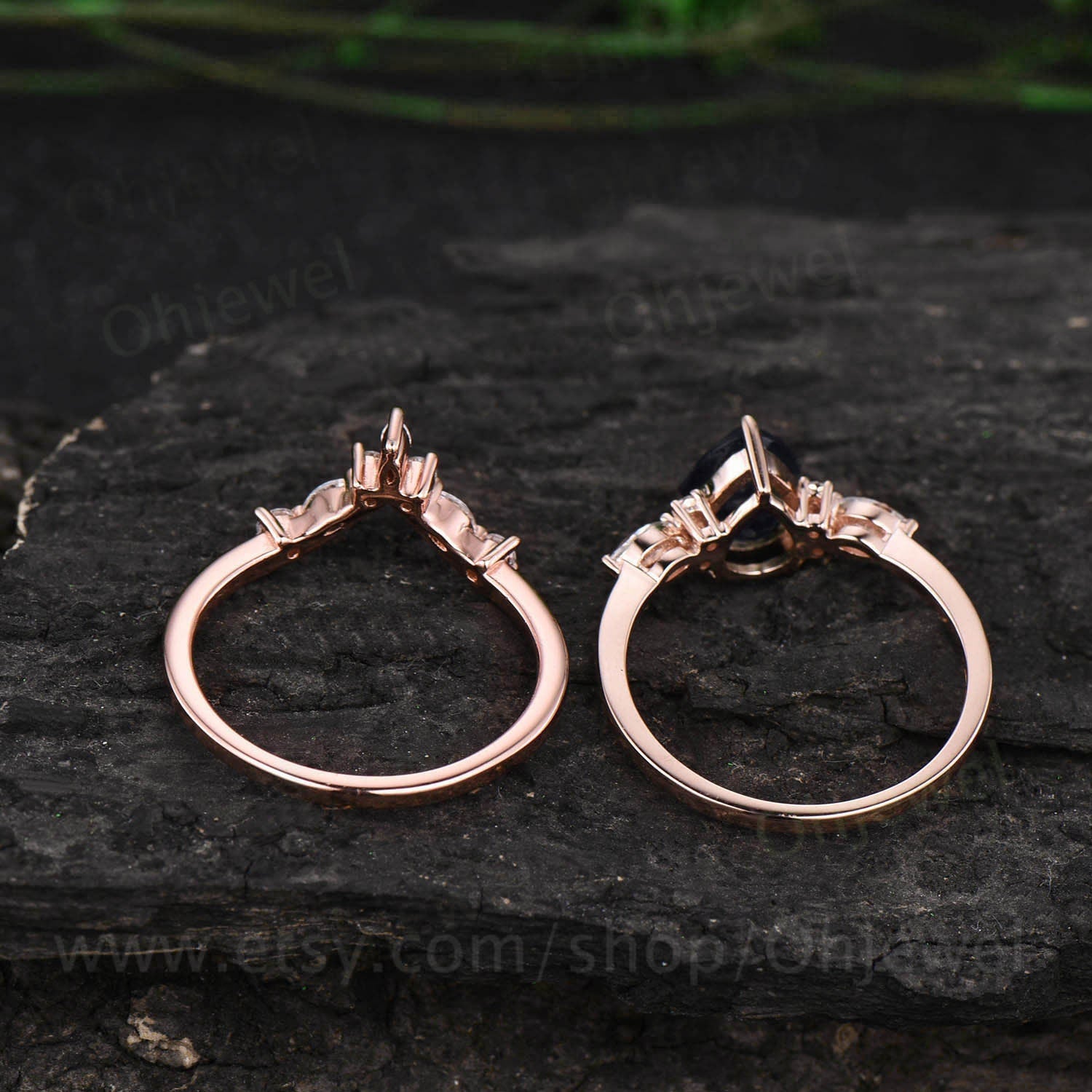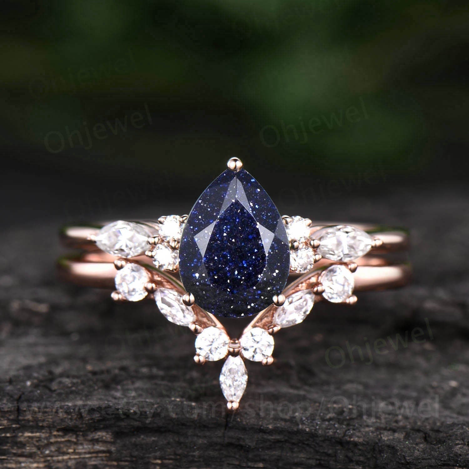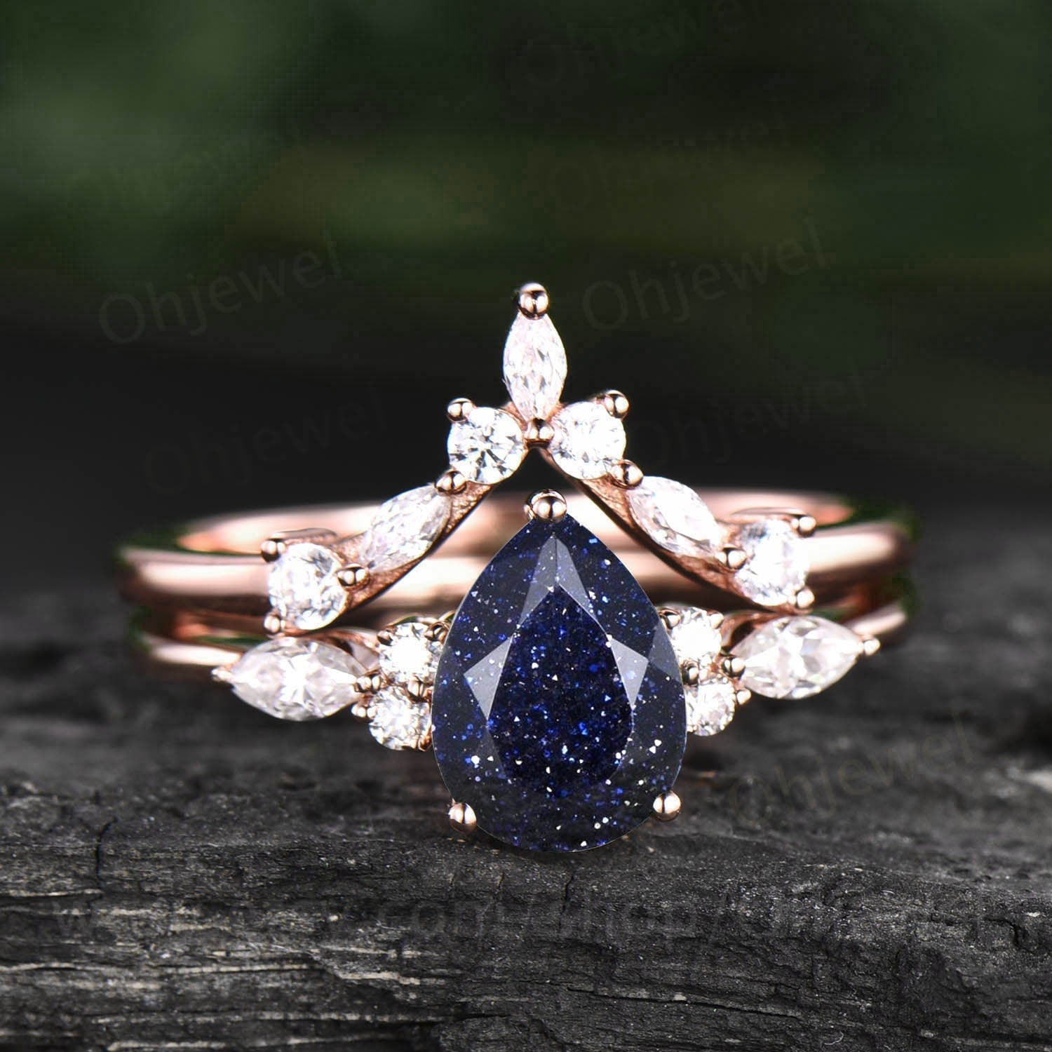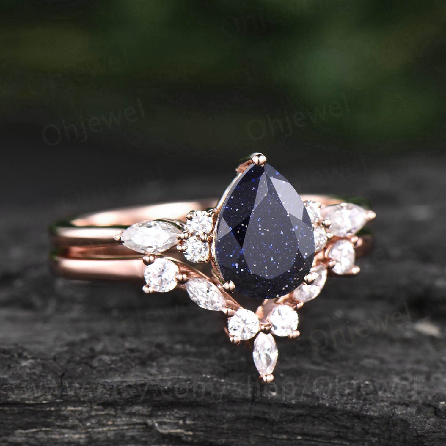 Pear shaped blue sandstone engagement ring set 14k rose gold vintage unique engagement ring moissanite ring set for women wedding ring set