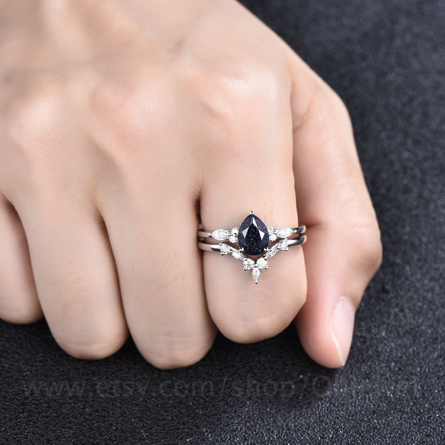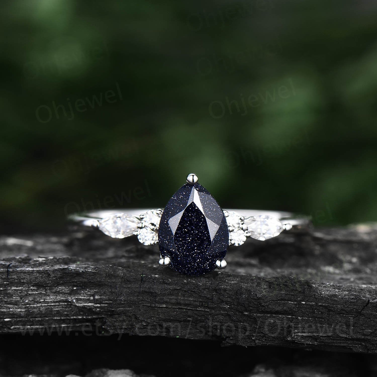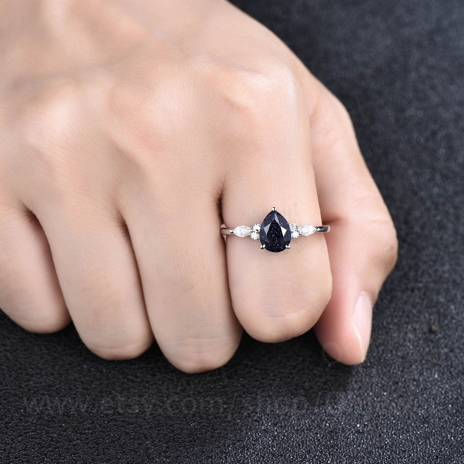 This is a blue sandstone engagement ring in solid gold,about 6x8mm pear cut. The accent stones are round 1.5mm and marqueise 2x4mm moissanites.