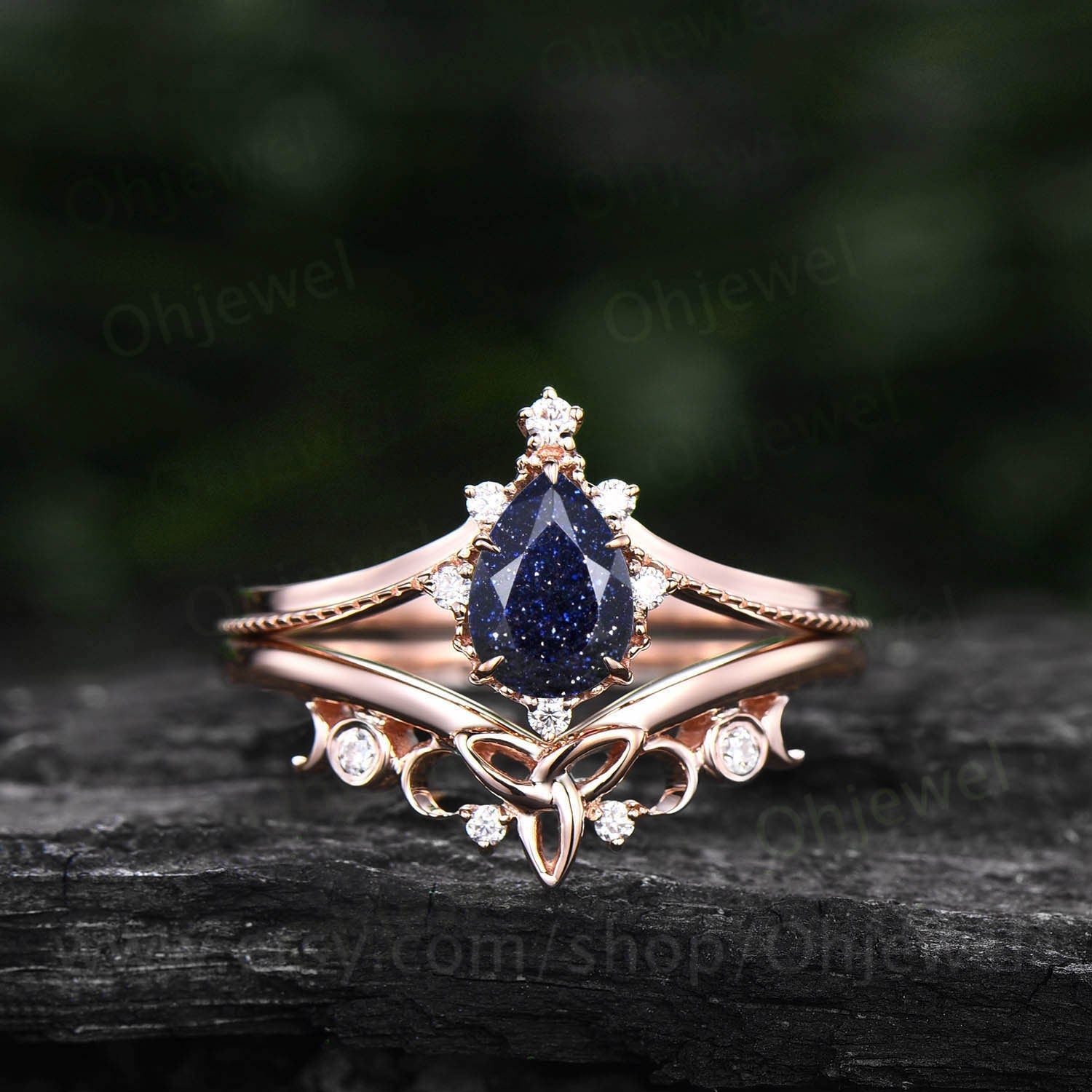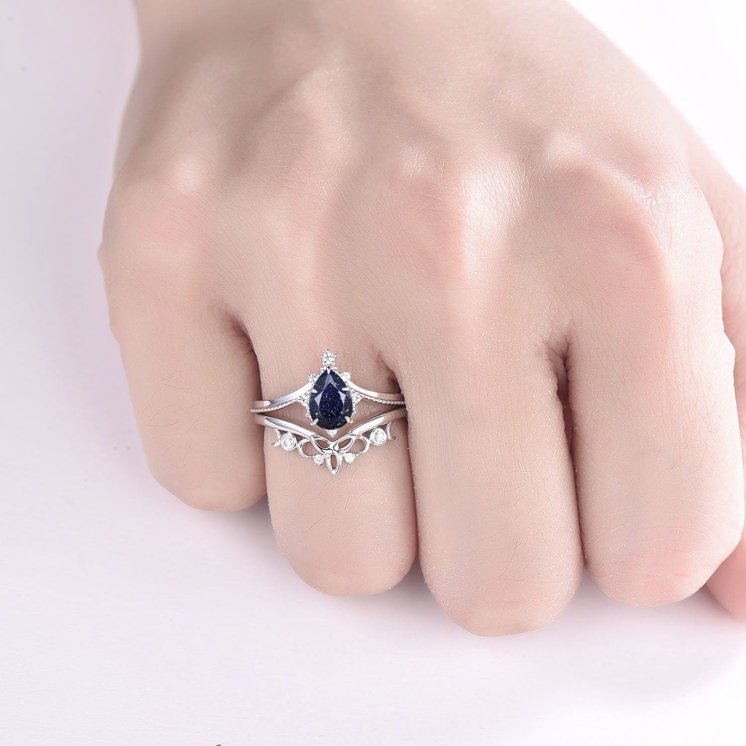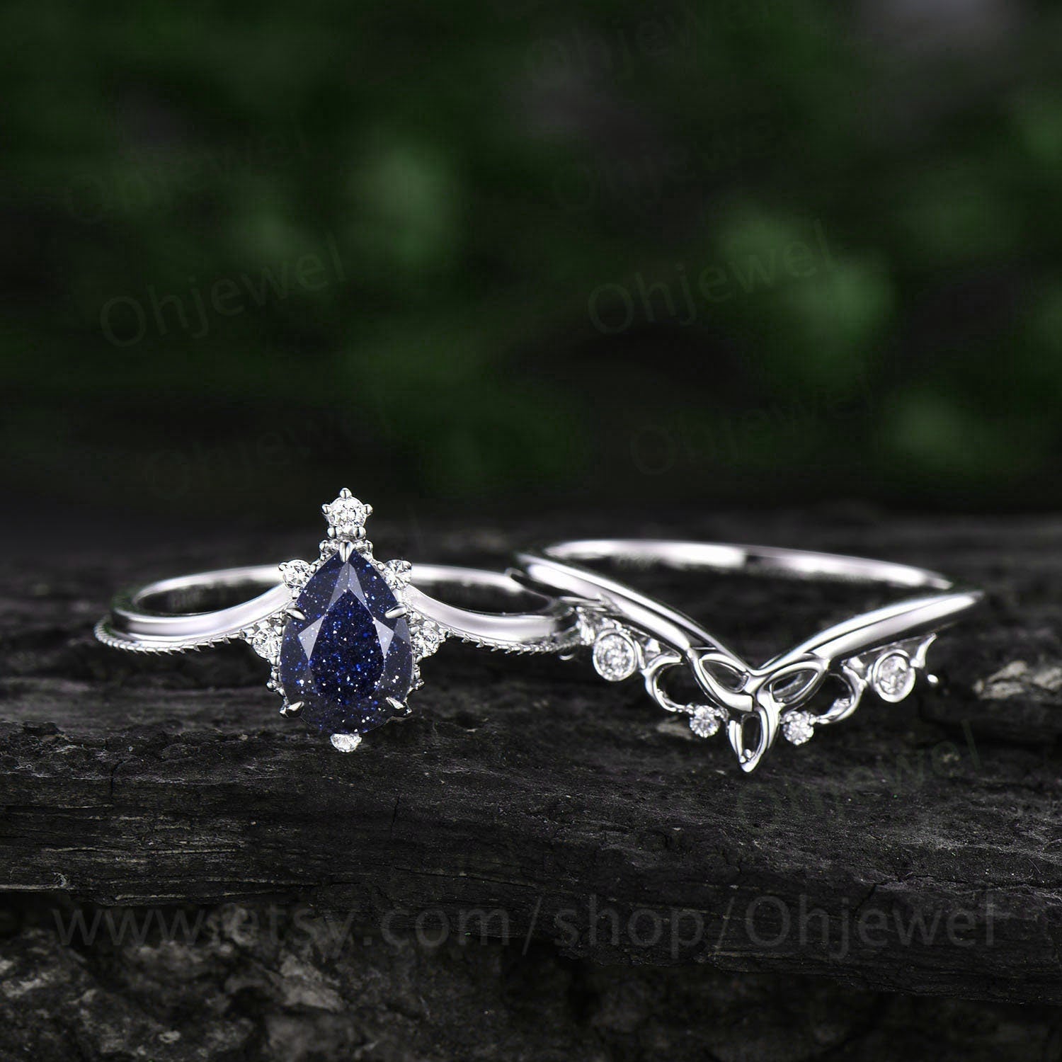 Pear shaped blue sandstone engagement ring set 14k white gold vintage unique engagement ring dainty moissanite wedding ring set for women