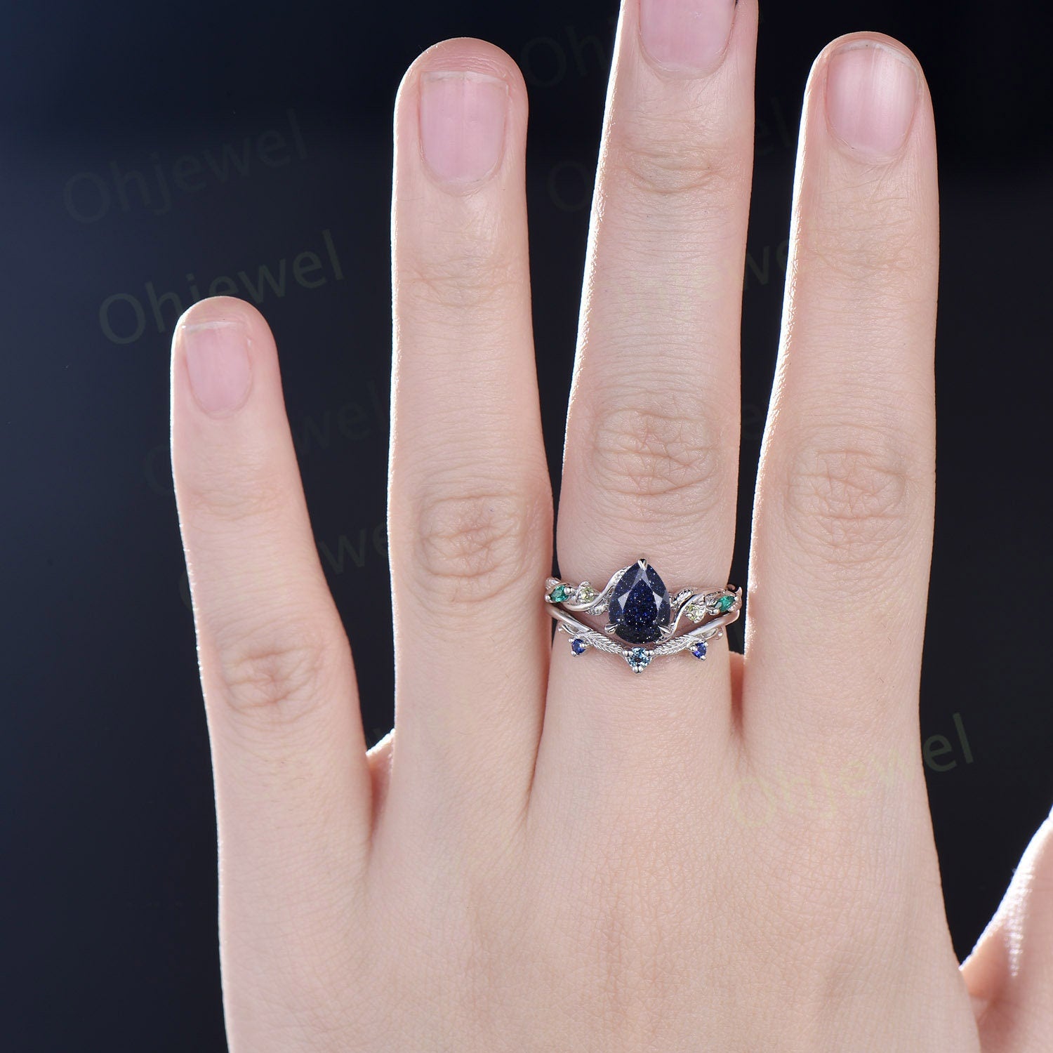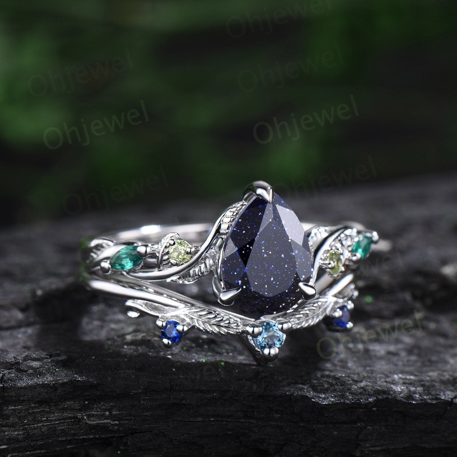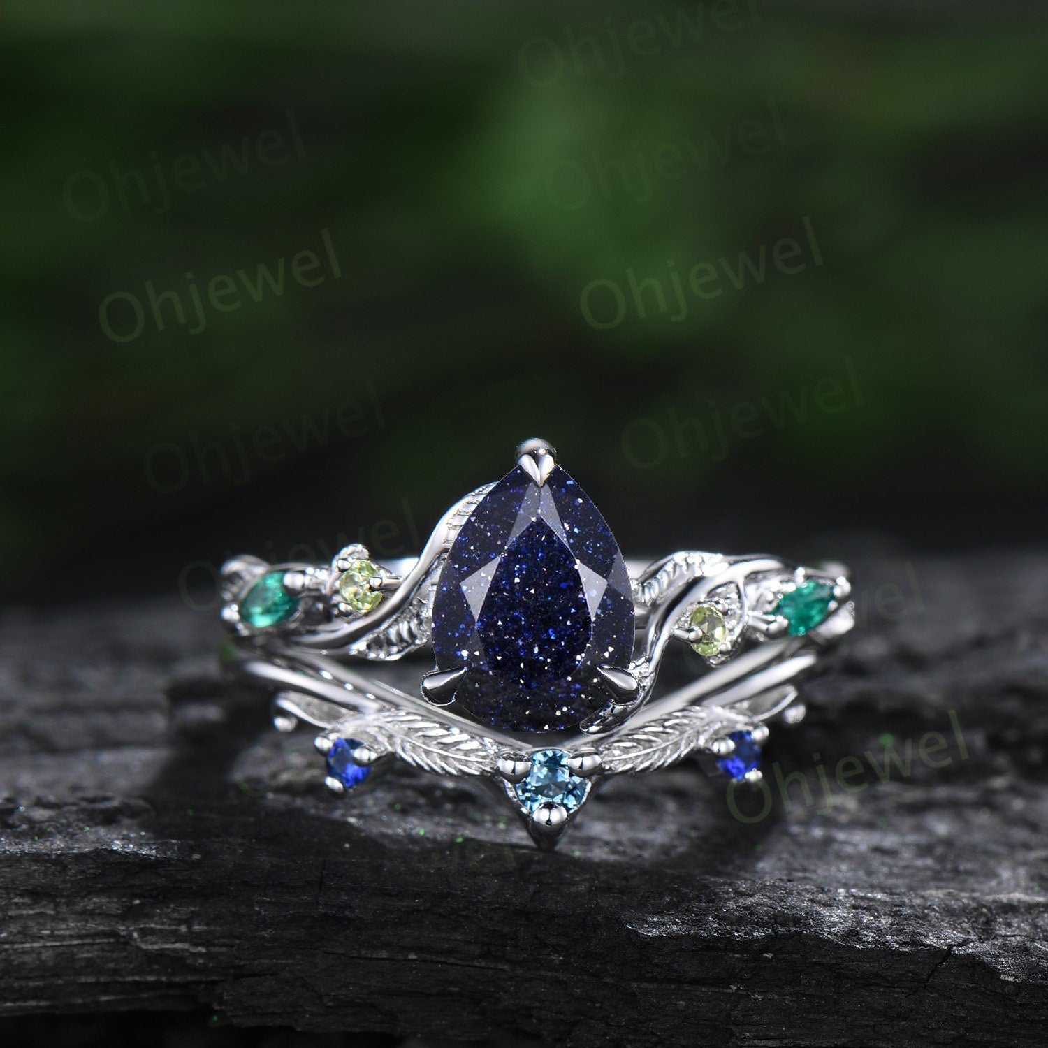 Pear shaped blue sandstone ring vintage art deco sapphire peridot emerald ring white gold twig nature inspired engagement ring women gift
