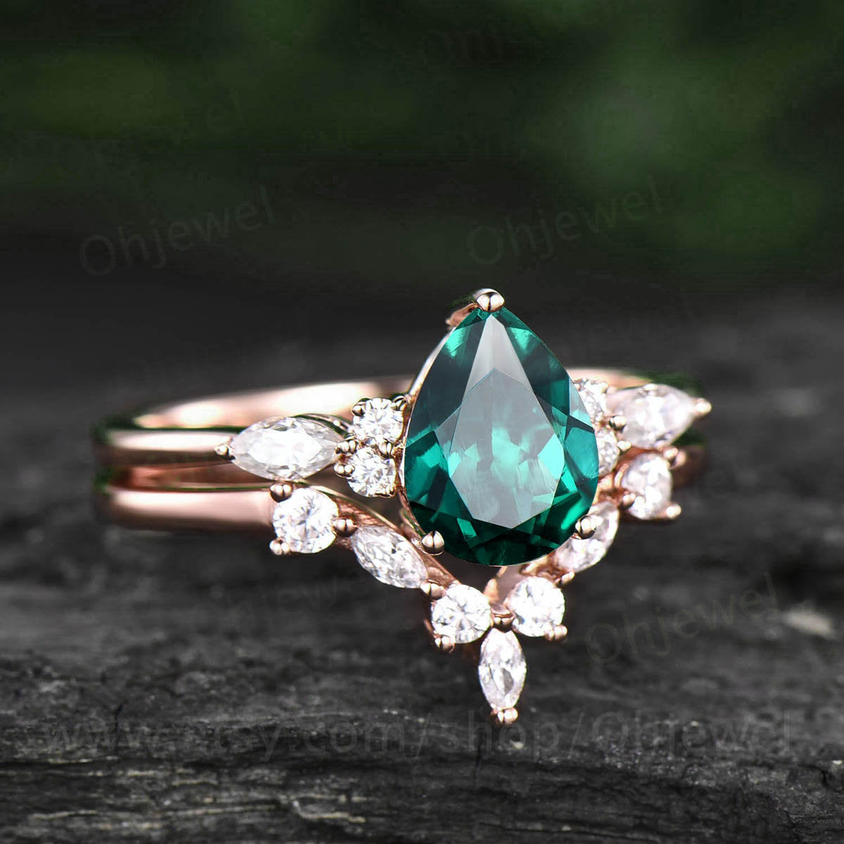 Pear shaped emerald ring gold silver vintage emerald engagement ring set art deco rose gold ring women unique moissanite promise ring set