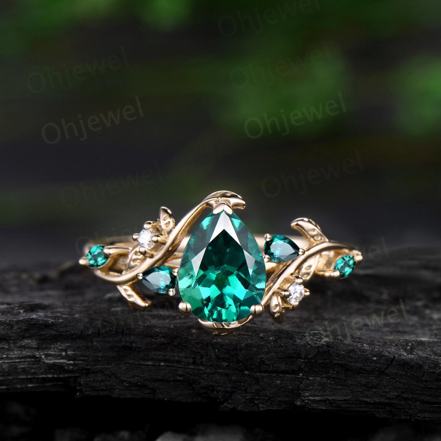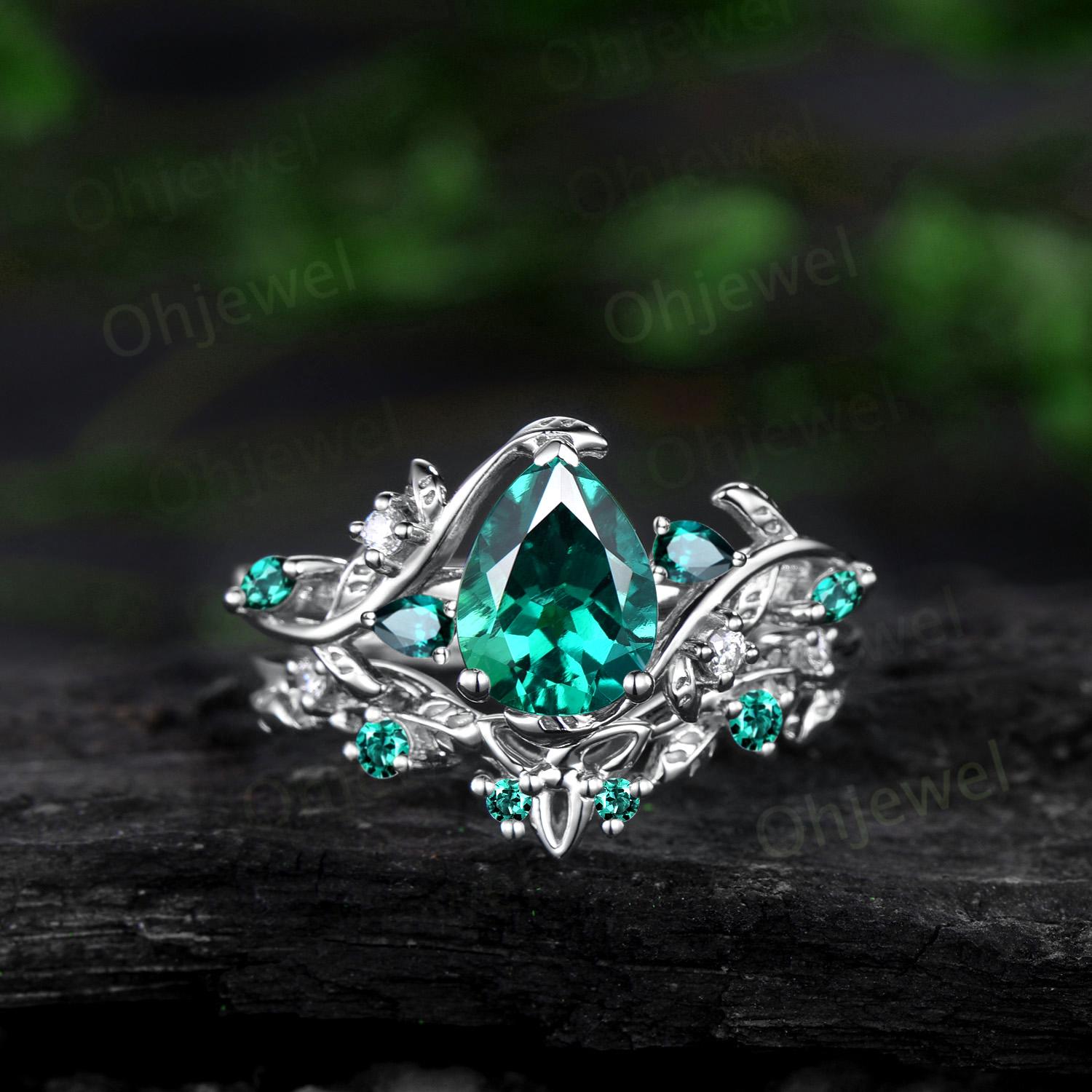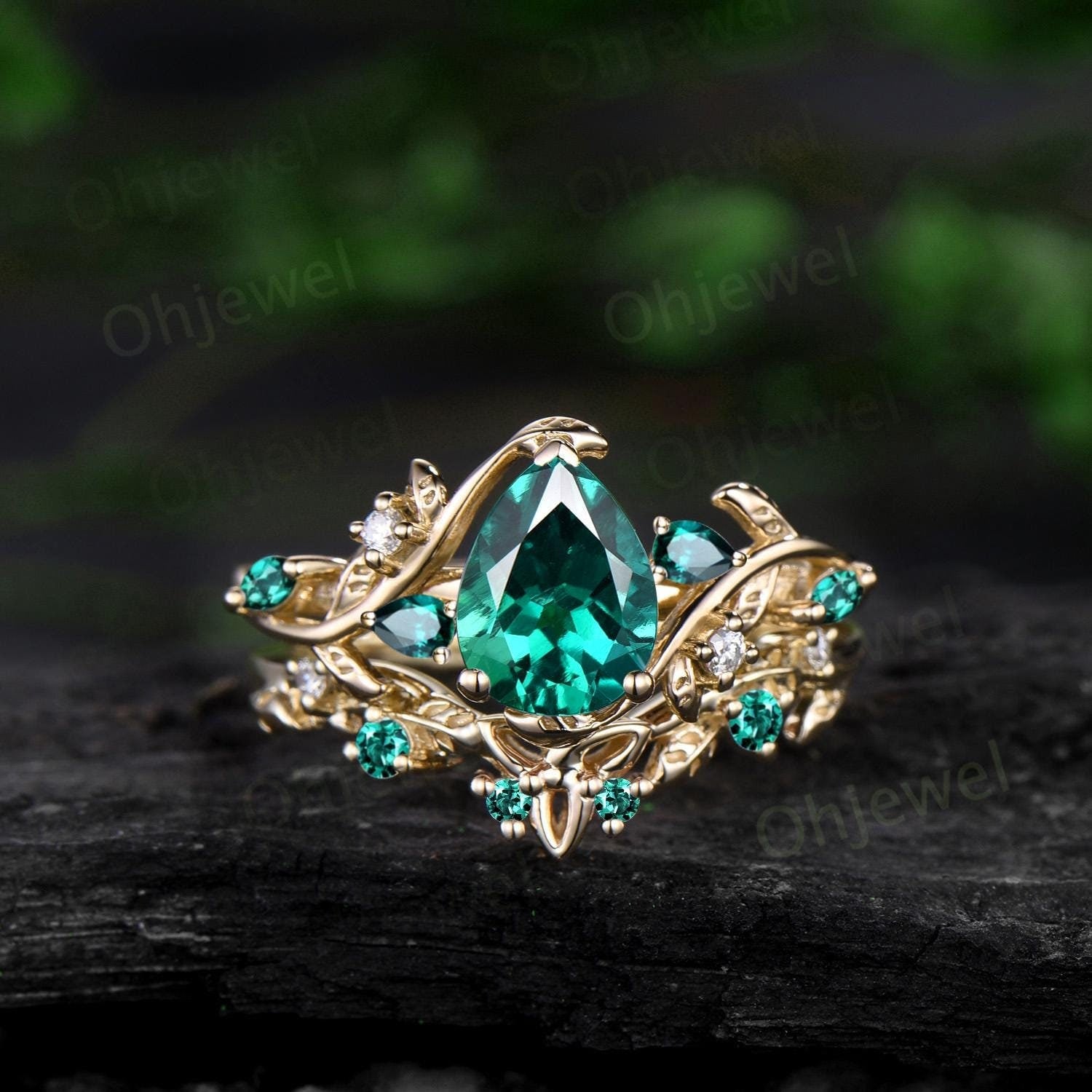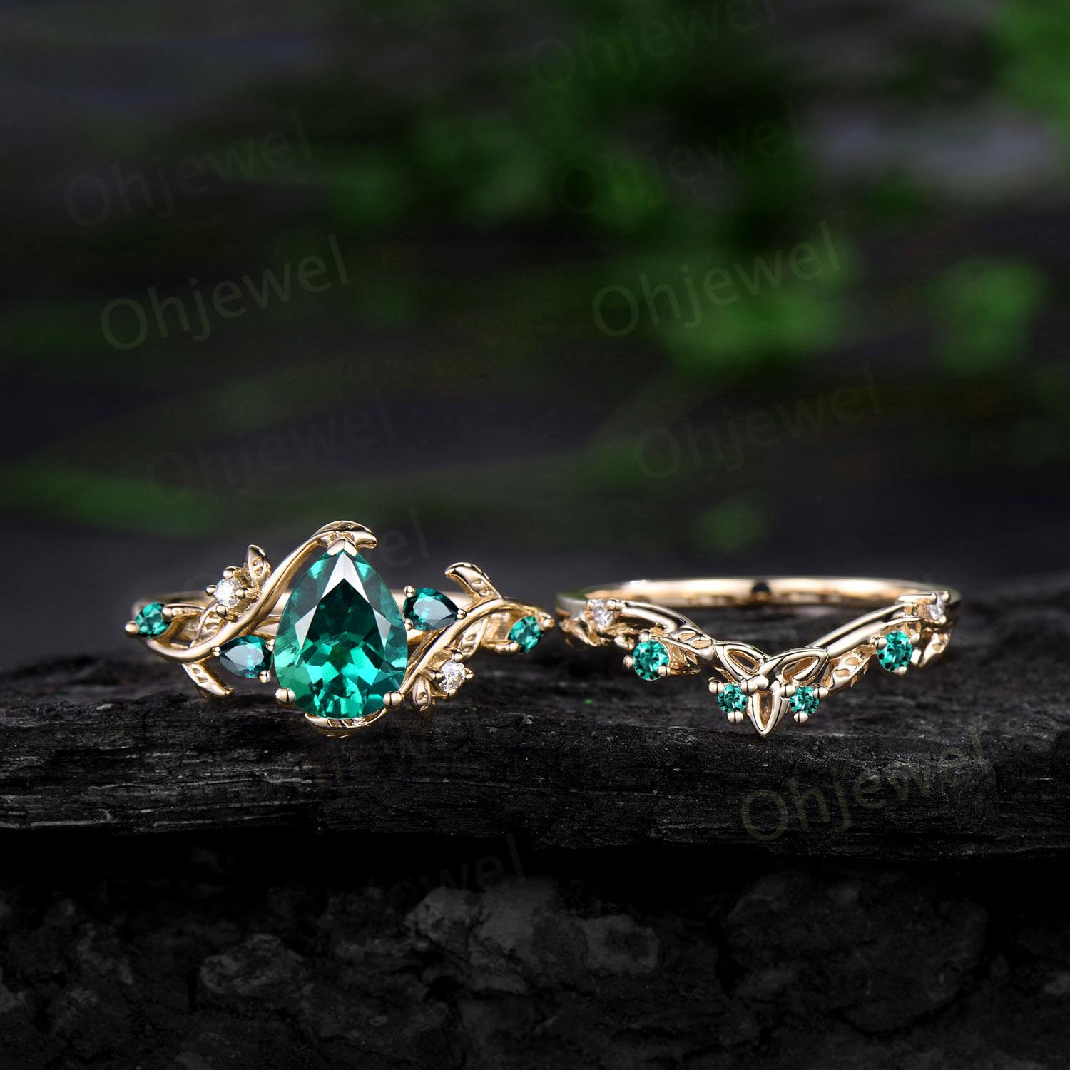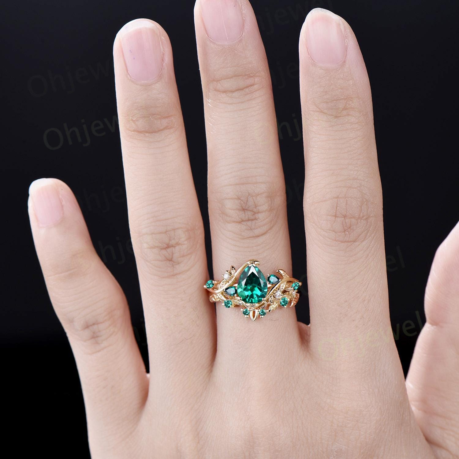 Pear shaped green emerald engagement ring set solid 14k yellow gold leaf branch bridal set vintage Celtic Knot wedding ring band women