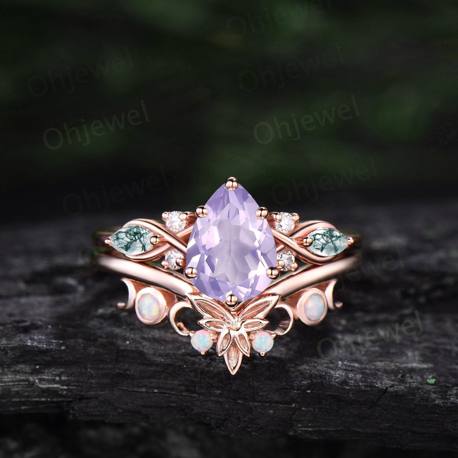 Pear shaped Lavender Amethyst ring vintage unique engagement ring art deco rose gold leaf moon opal ring women twisted promise ring set gift