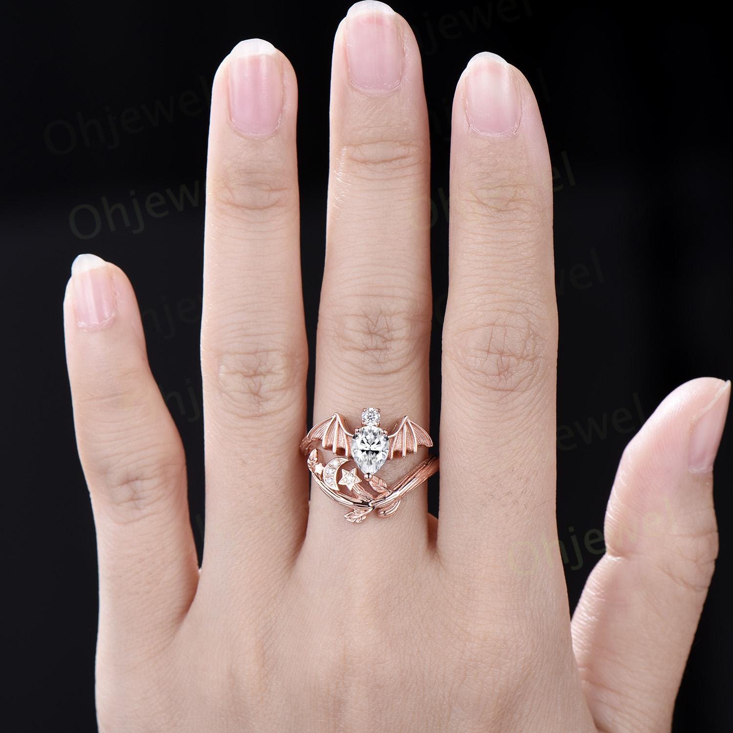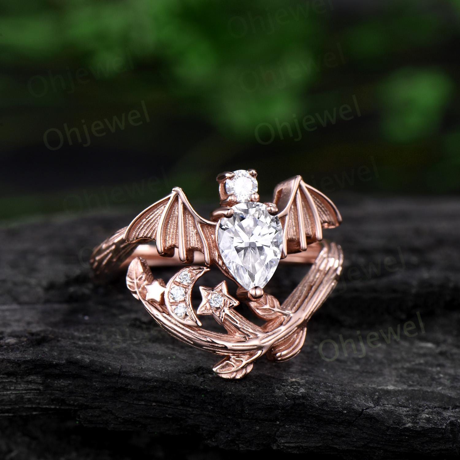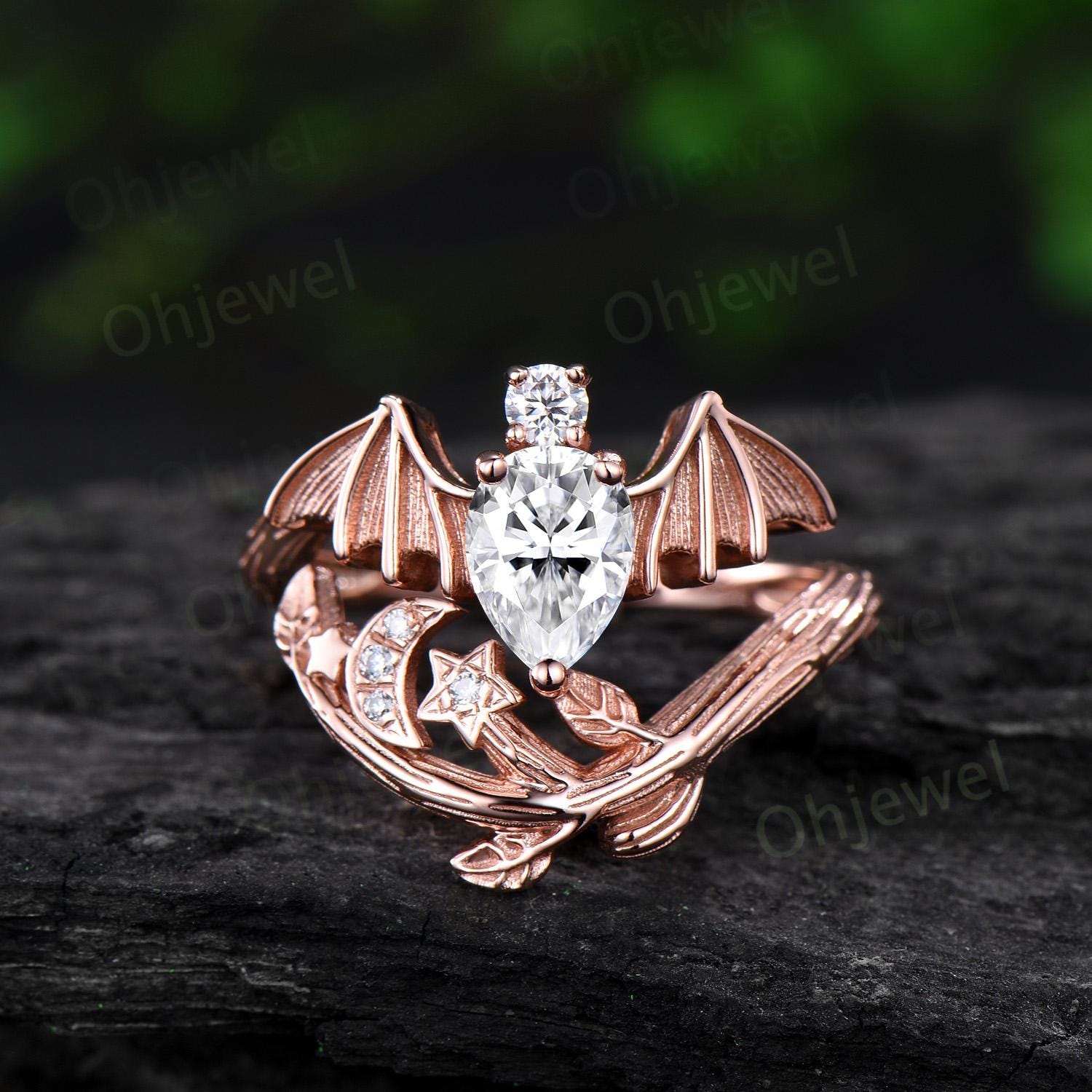 Pear shaped moissanite ring vintage rose gold moon bat engagement ring 14k rose gold retro leaf star diamond promise wedding ring women