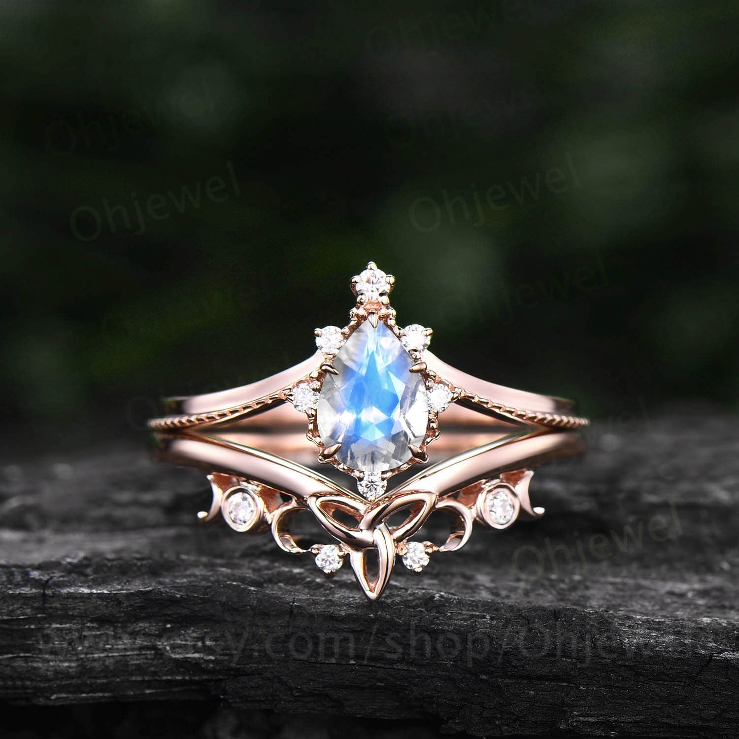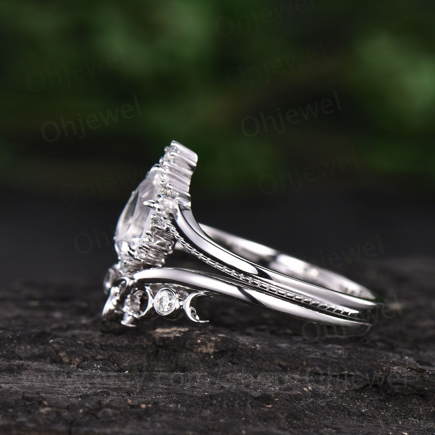 Pear shaped moonstone engagement ring set 14k white gold unique vintage engagement ring moissanite ring for women Norse Viking ring jewelry