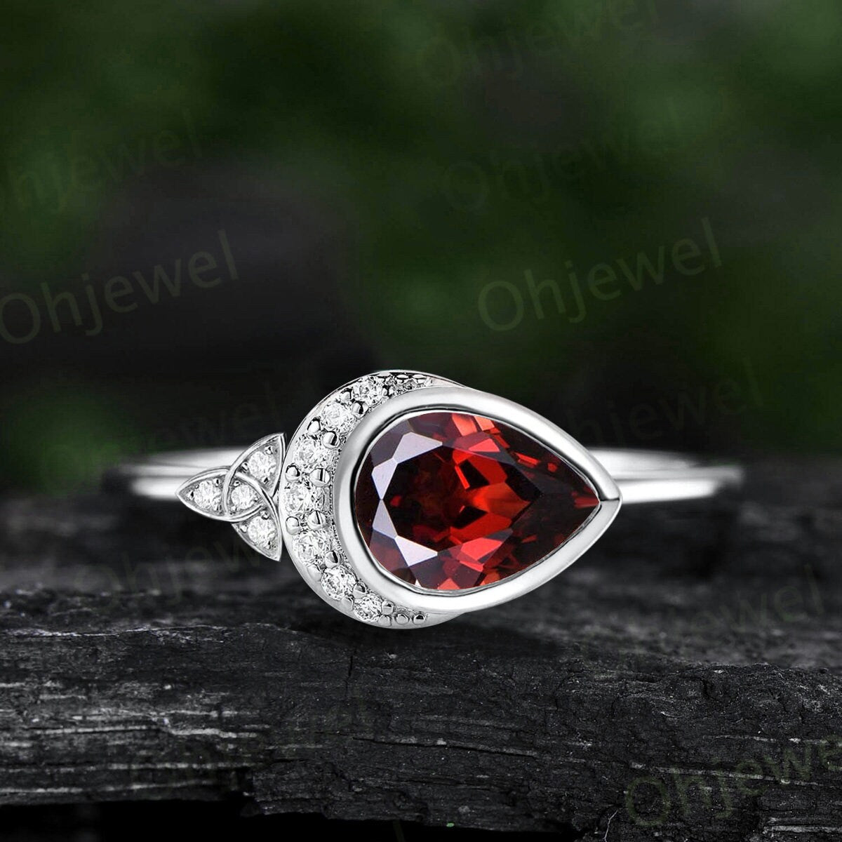 Pear shaped red garnet ring vintage moon bezel unique engagement ring women solid 14k rose gold celtic knot diamond anniversary ring gift