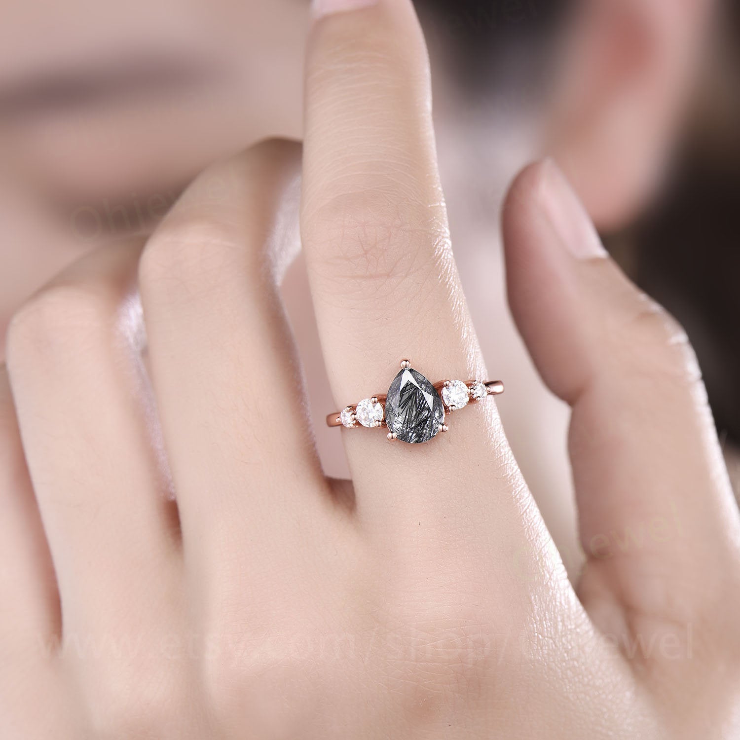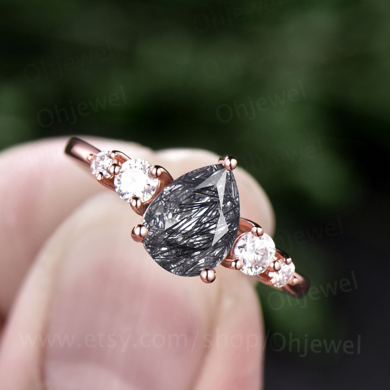 This is a black rutilated quartz engagement ring in solid gold,about 6x8mm pear cut. The accent stones are round 3mm and 2mm moissanites.