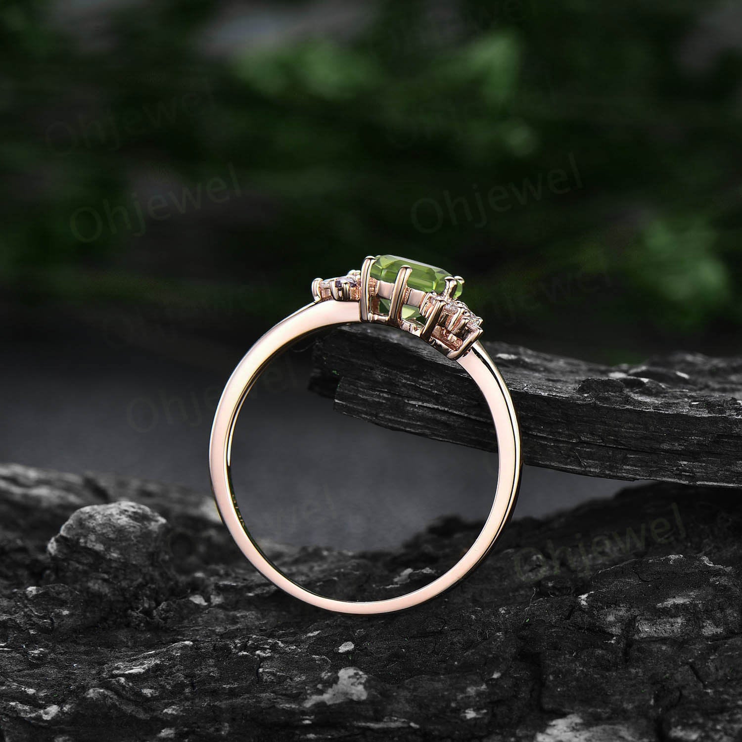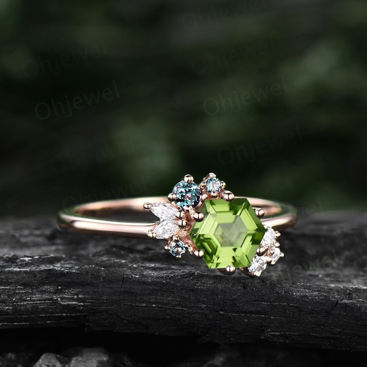 Peridot ring vintage Hexagon cut peridot engagement ring rose gold unique cluster engagement ring women marquise cut diamond promise ring
