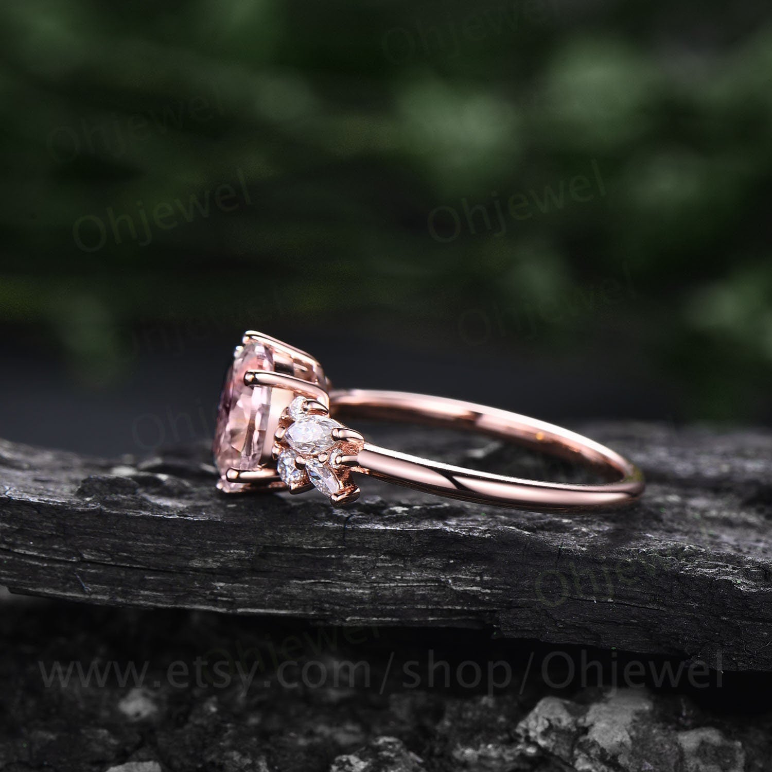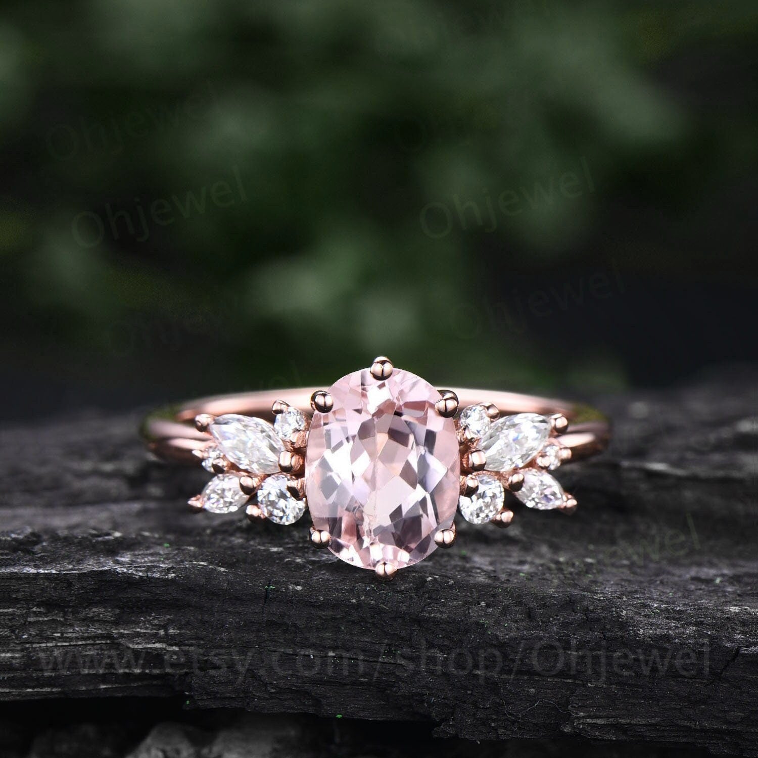 This is a pink morganite engagement ring in solid gold,about 6x8mm oval cut. The accent stones are round cut and marquise cut diamonds or moissanites,The band width is about 1.4mm.