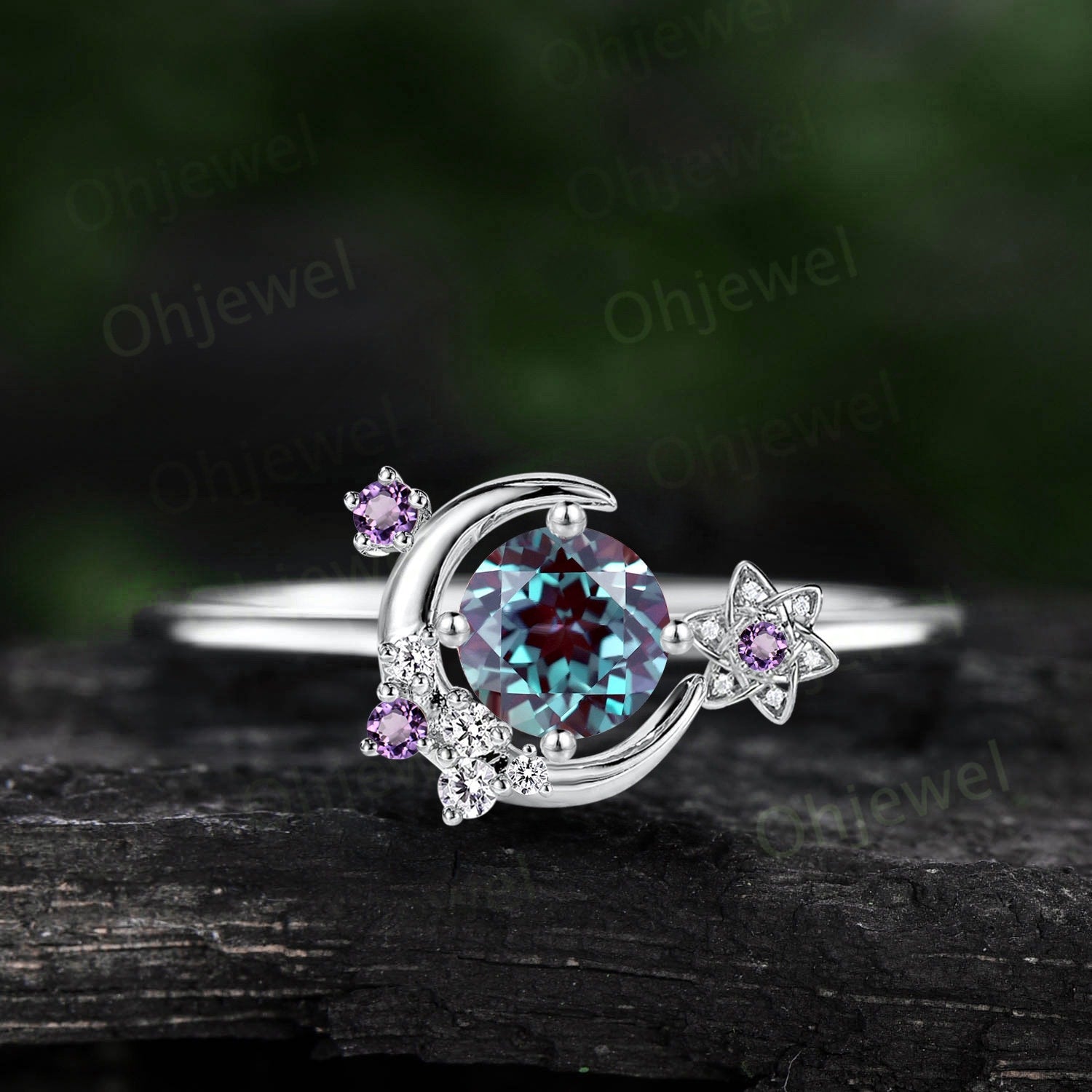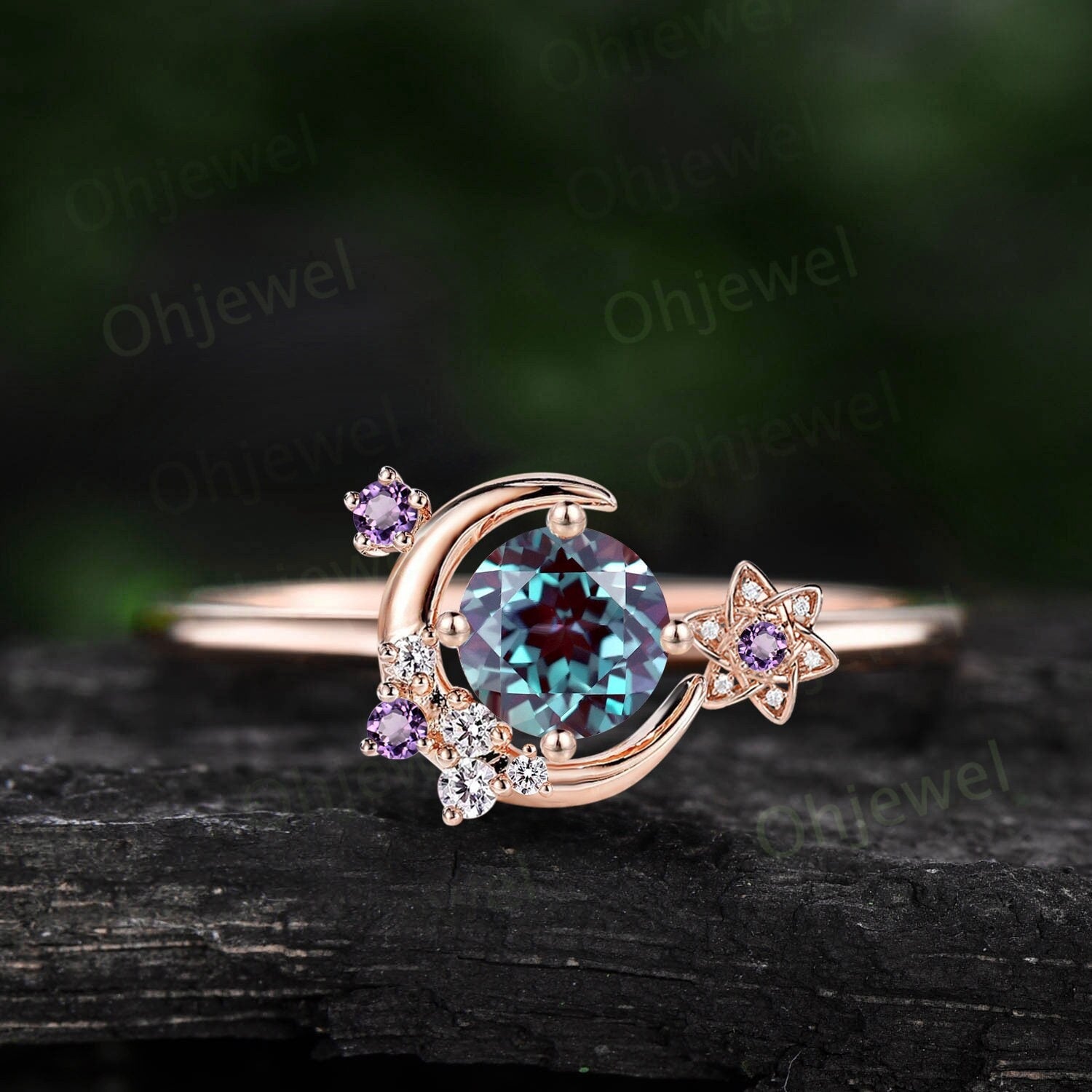 Round Alexandrite ring vintage cluster amethyst ring rose gold unique moon engagement ring retro star flower moissanite wedding ring women