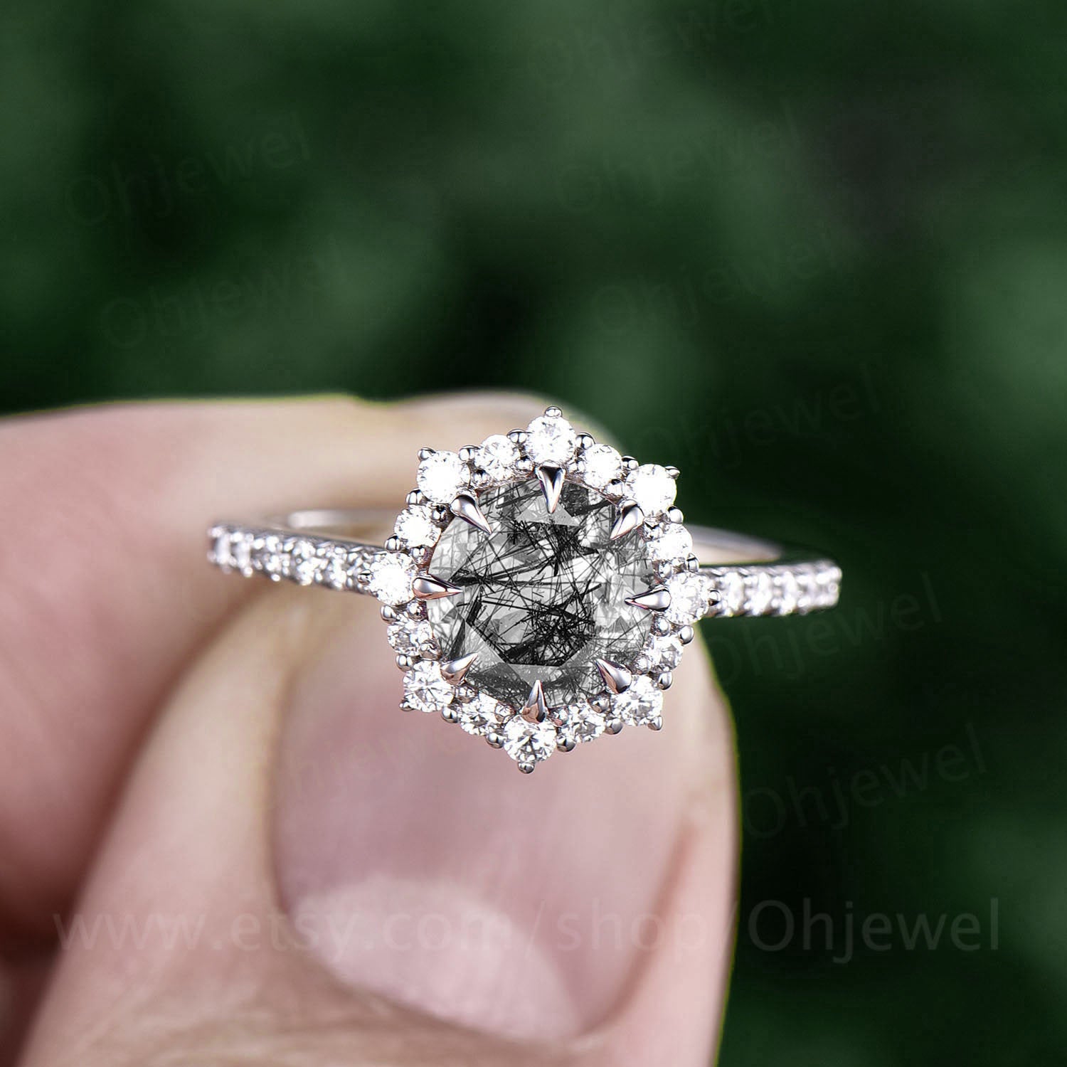 Round black rutilated quartz engagement ring rose gold vintage cluster halo moissanite ring women jewelry unique wedding bridal ring gift