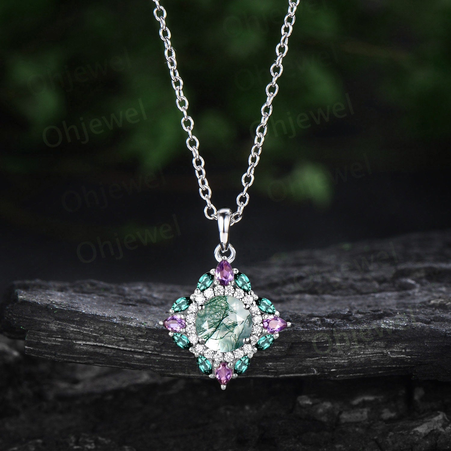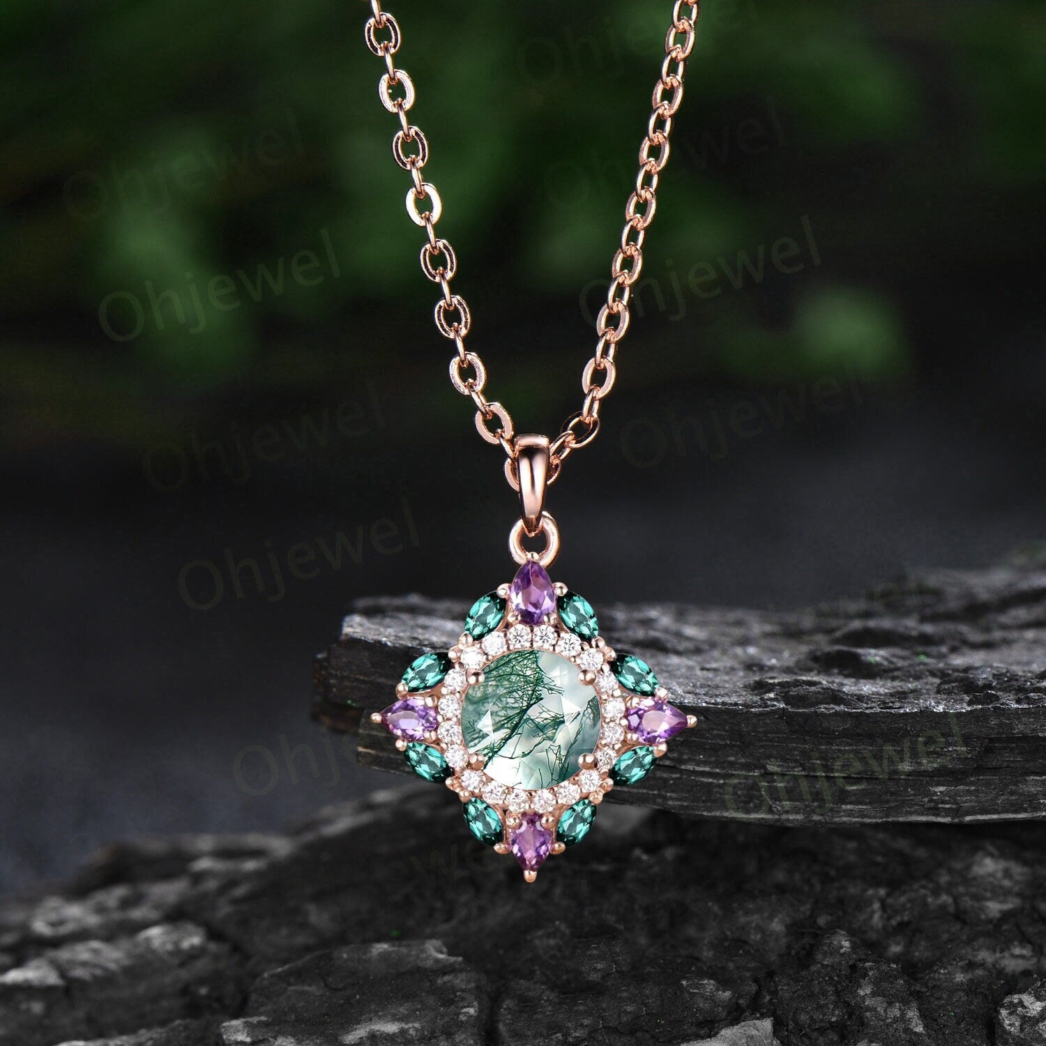 Round cut green moss agate necklace vintage double halo moissanite amethyst emerald necklace Pendant women 14k rose gold anniversary gift