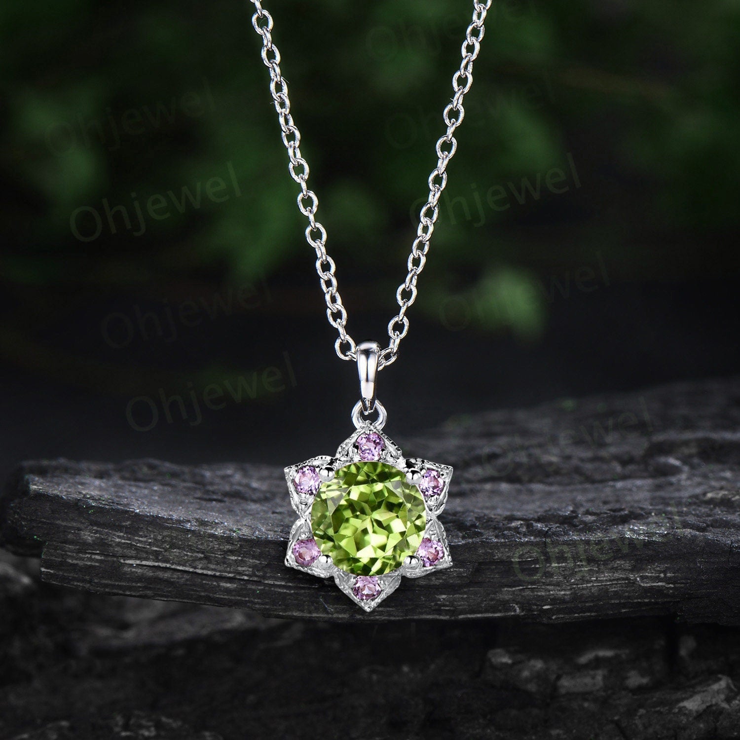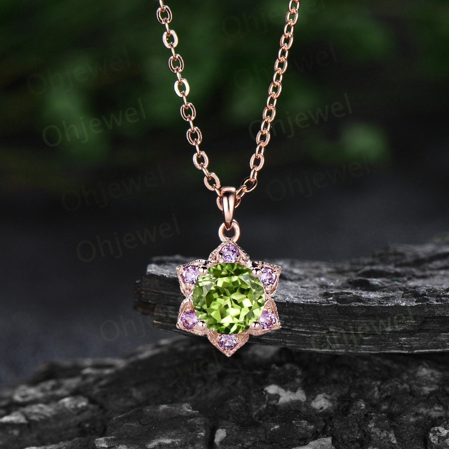 Round peridot necklace vintage milgrain floral purple amethyst Pendant women solid 14k rose gold August birthstone anniversary gift her