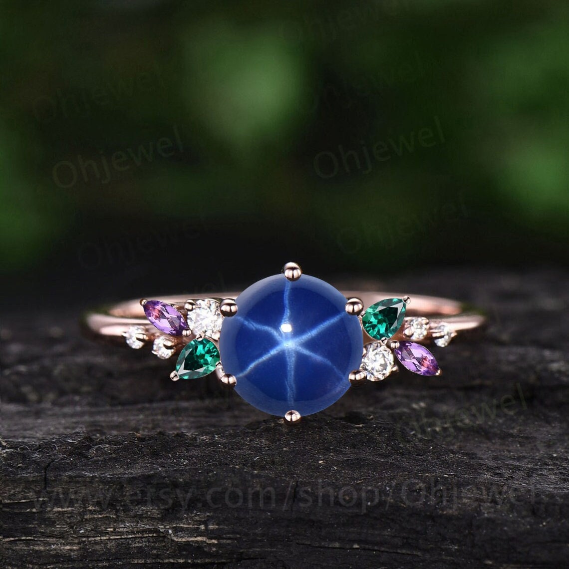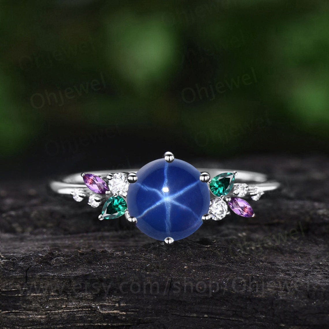 This is a lab star blue sapphire engagement ring in solid gold,about 6.5mm round cut,The accent stones are pear lab emeralds,marquise natural amethyst and moissanites or diamonds (G-H,SI-VS).