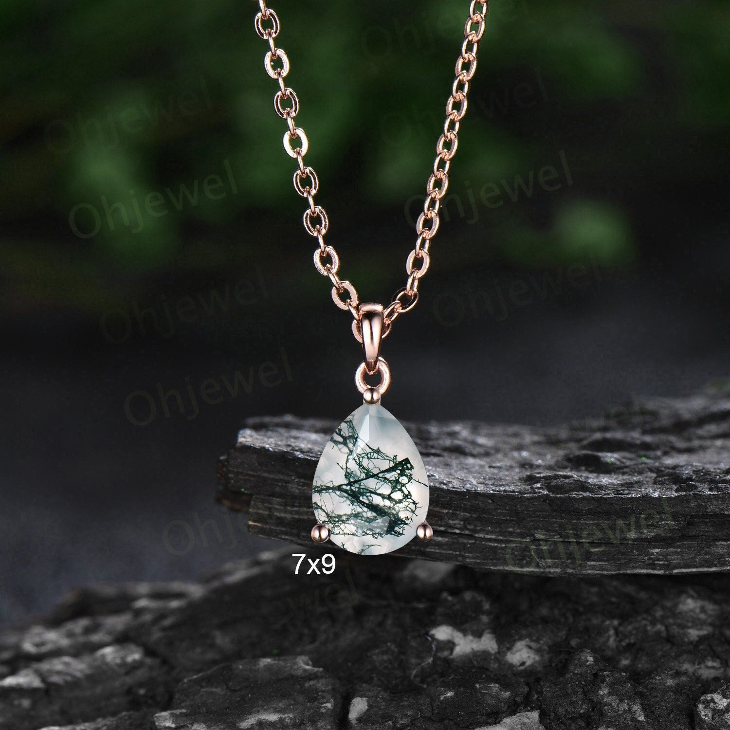 Solitaire pear shaped green moss agate necklace 14k rose gold dainty Pendant women anniversary gift for her
