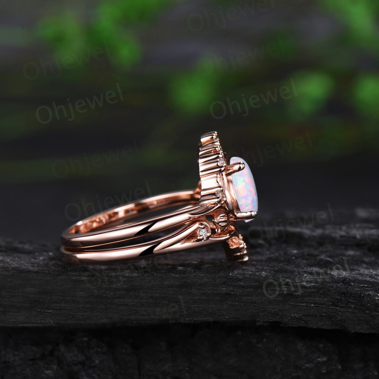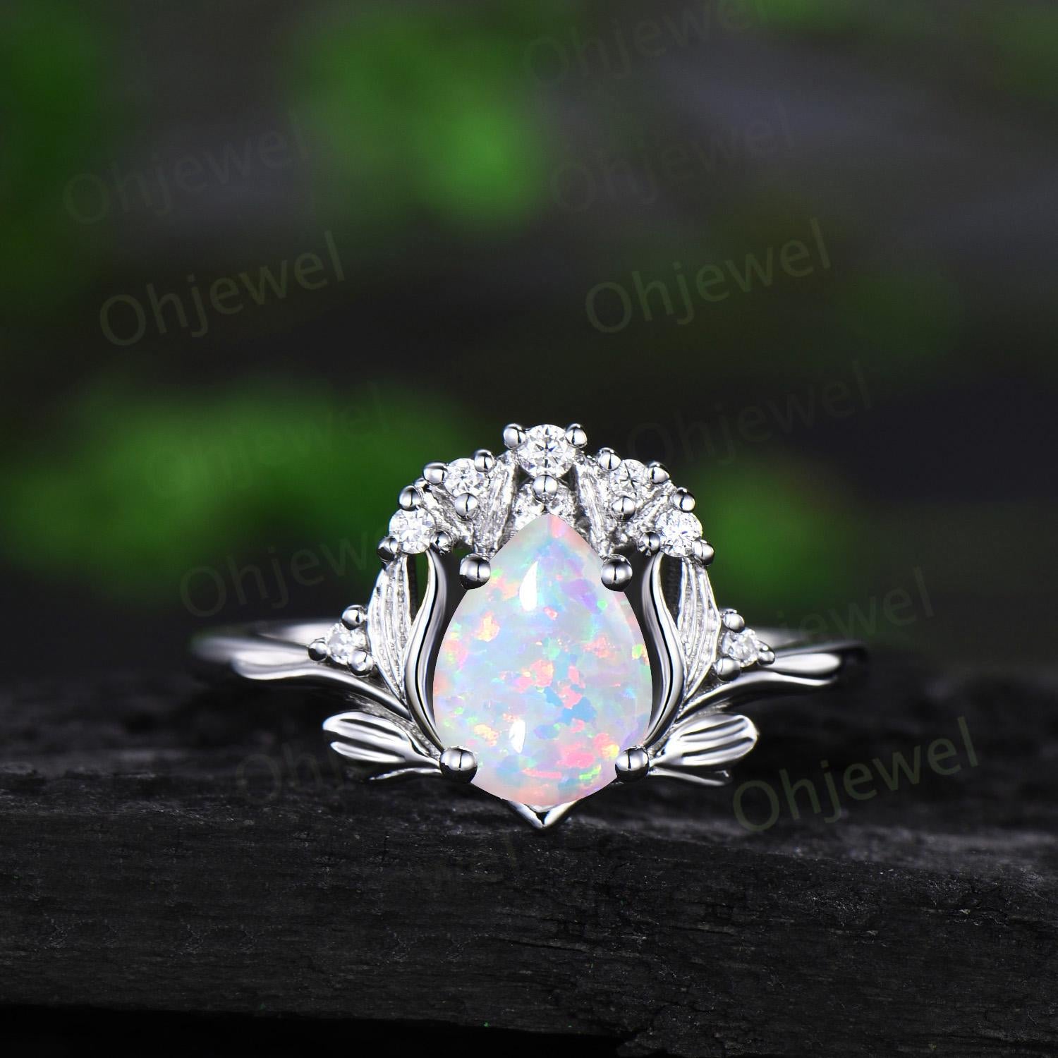 Teardrop white opal leaf engagement ring set solid 14k rose gold stacking cluster nature inspired diamond unique anniversary gift