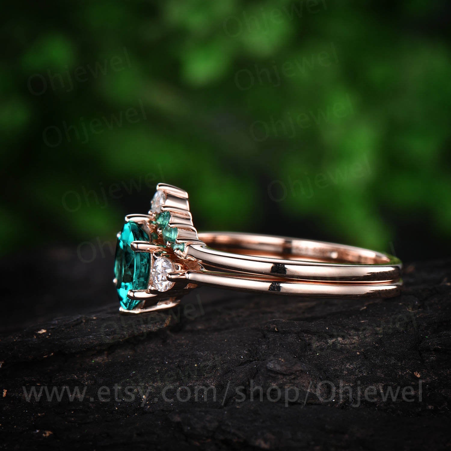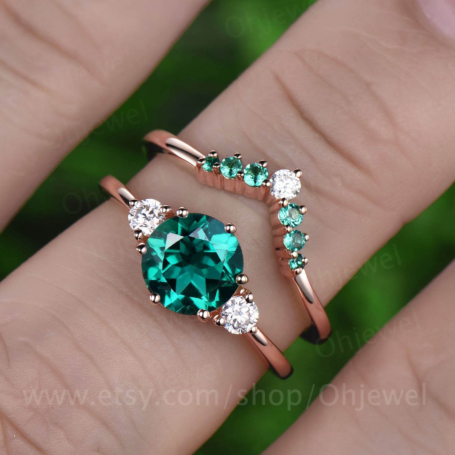 Three stone engagement ring emerald engagement ring set rose gold May birthstone ring moissanite natural emerald wedding band bridal set