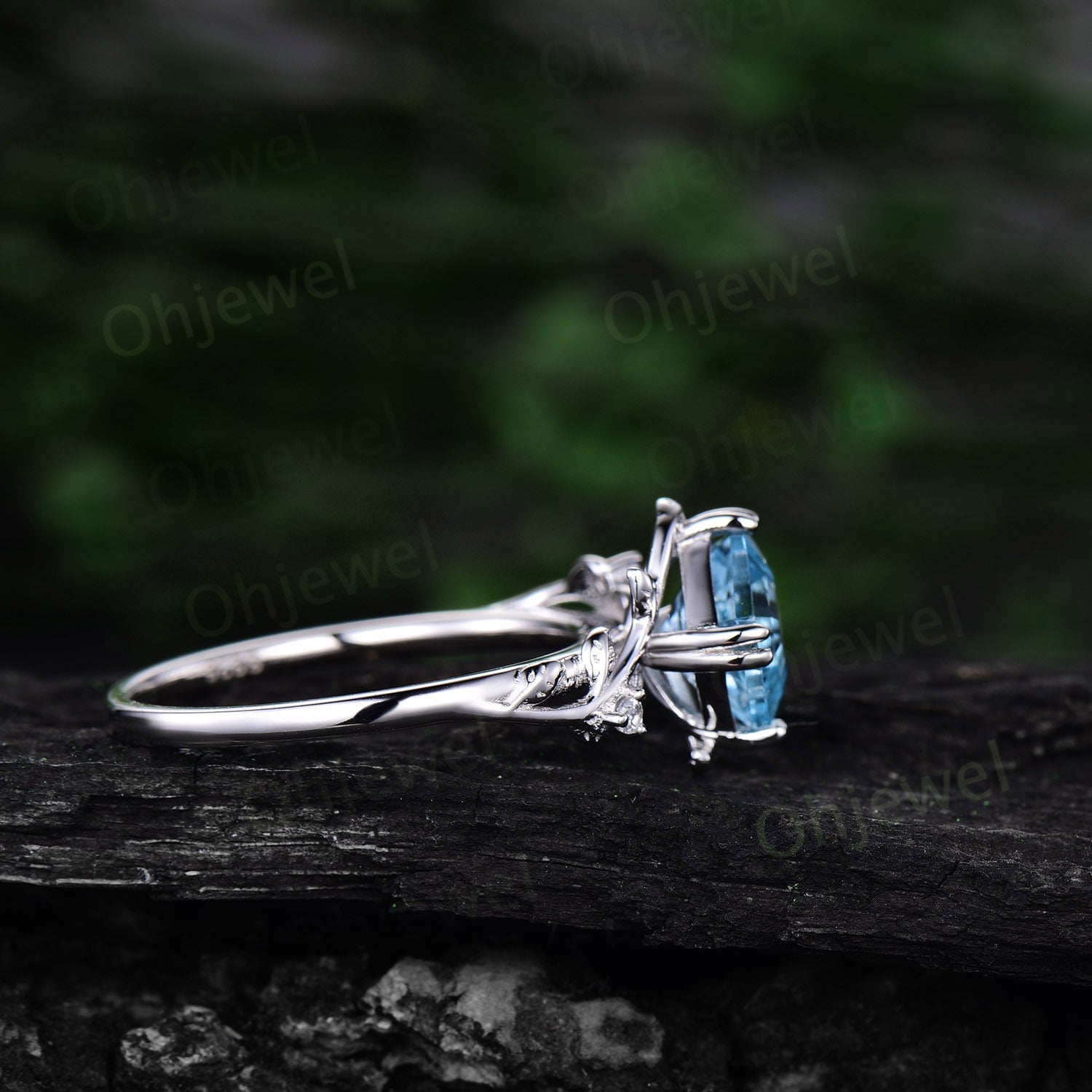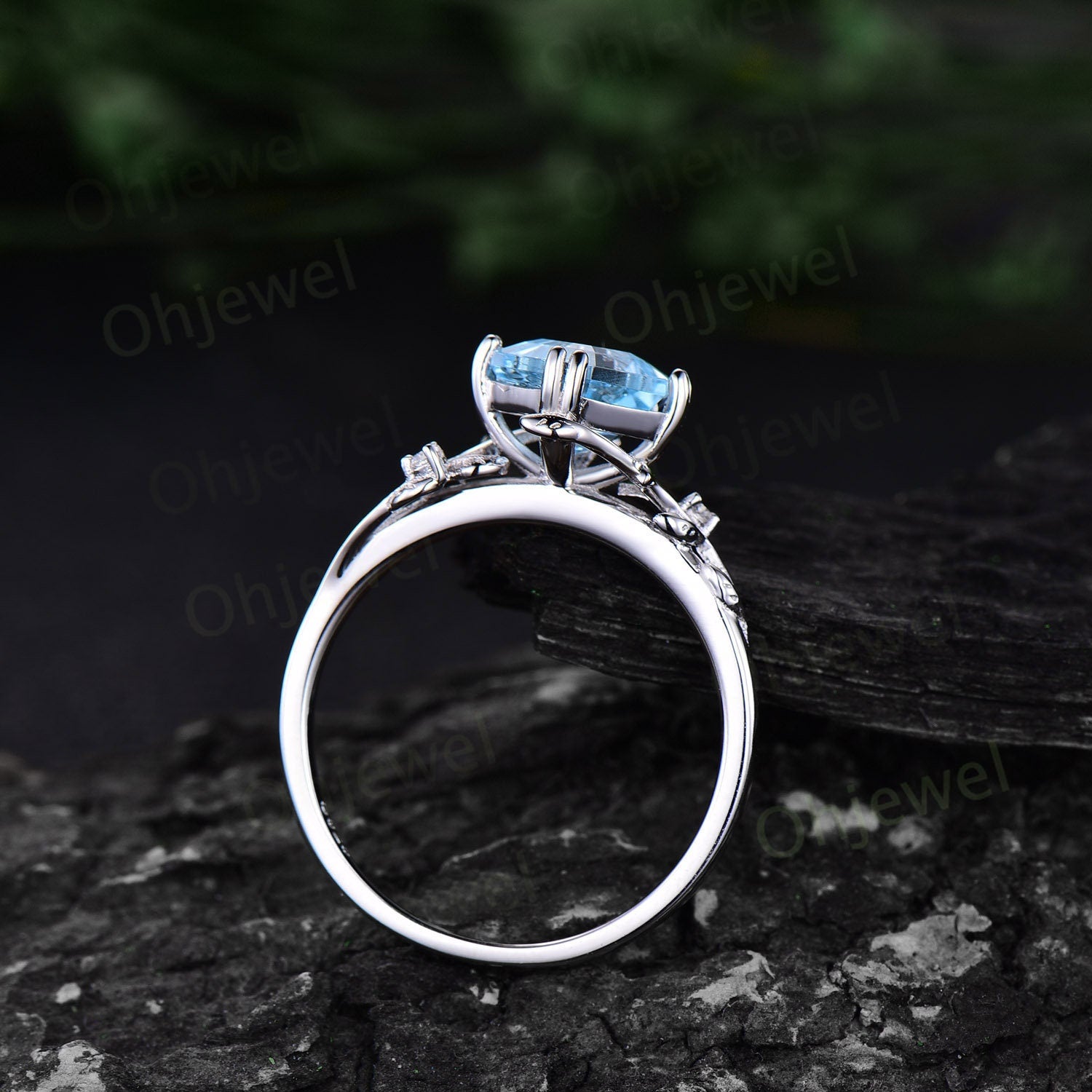 Twig Asscher cut Sky blue topaz engagement ring 14k rose gold leaf branch three stone diamond ring unique promise wedding ring women gift