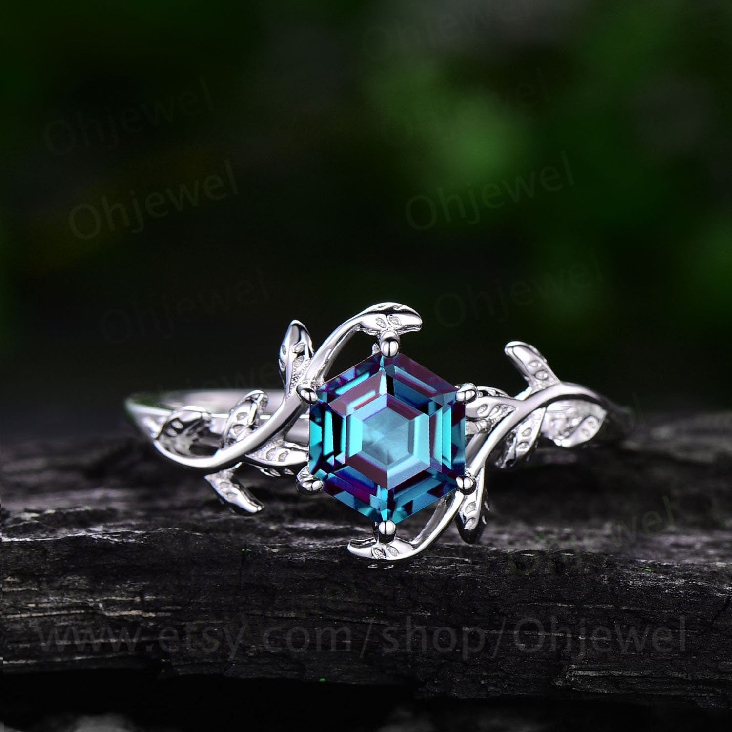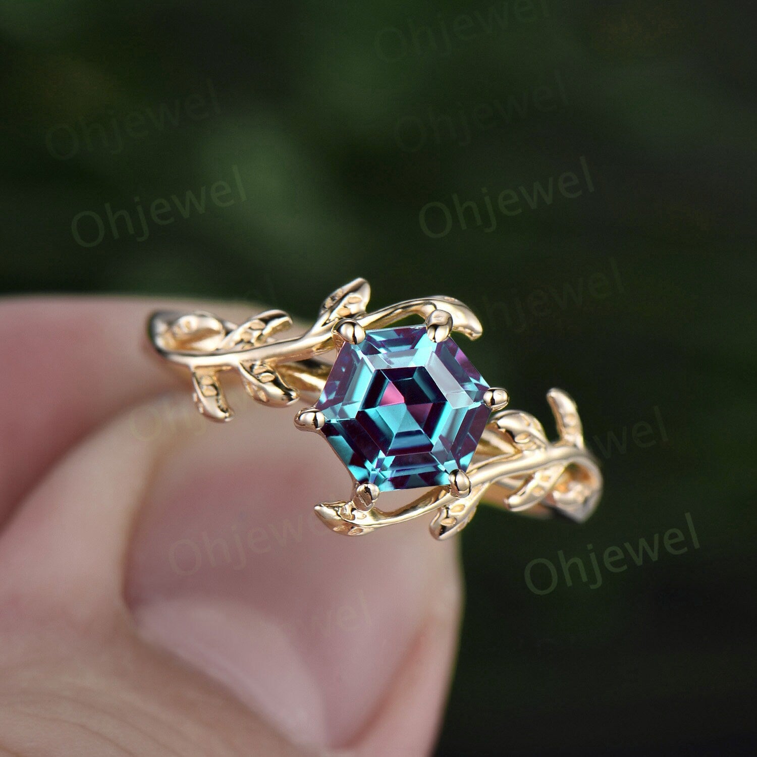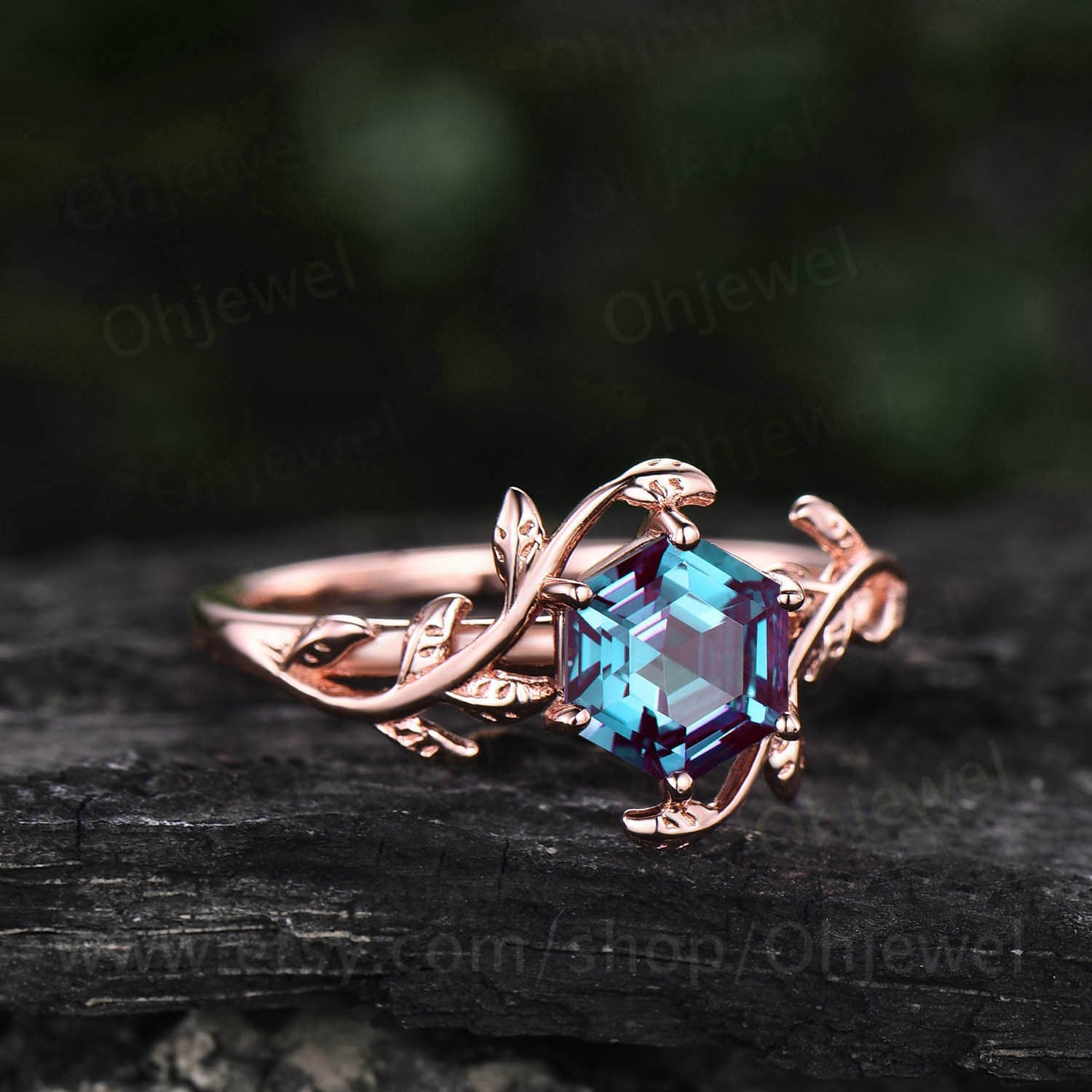 Twig Hexagon Alexandrite engagement ring leaf art deco branches unique vintage solitaire 14k rose gold engagement ring for women wedding