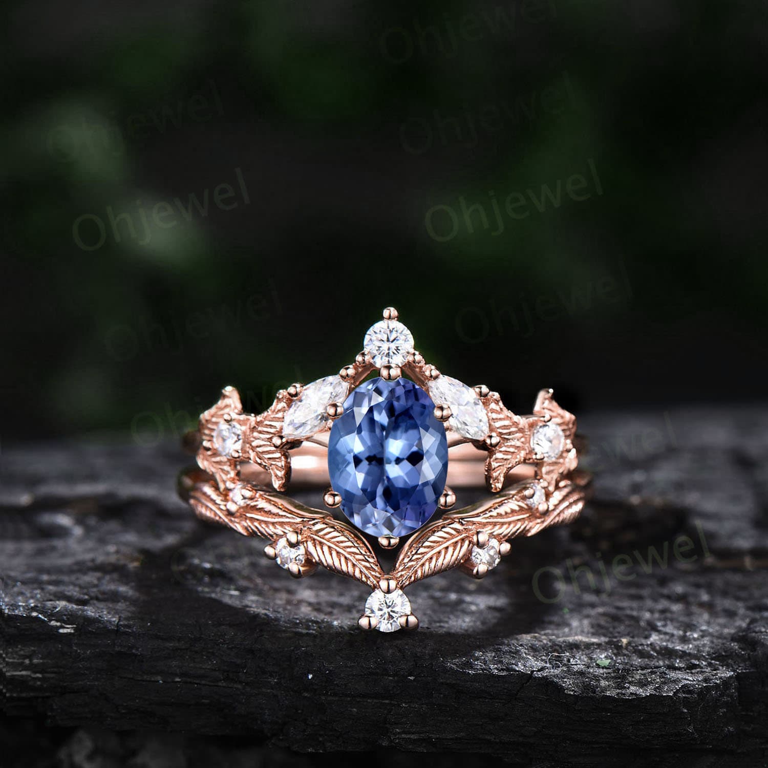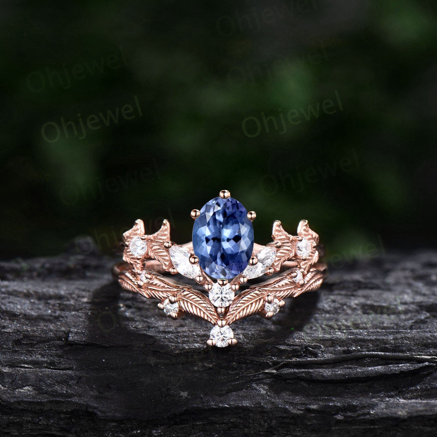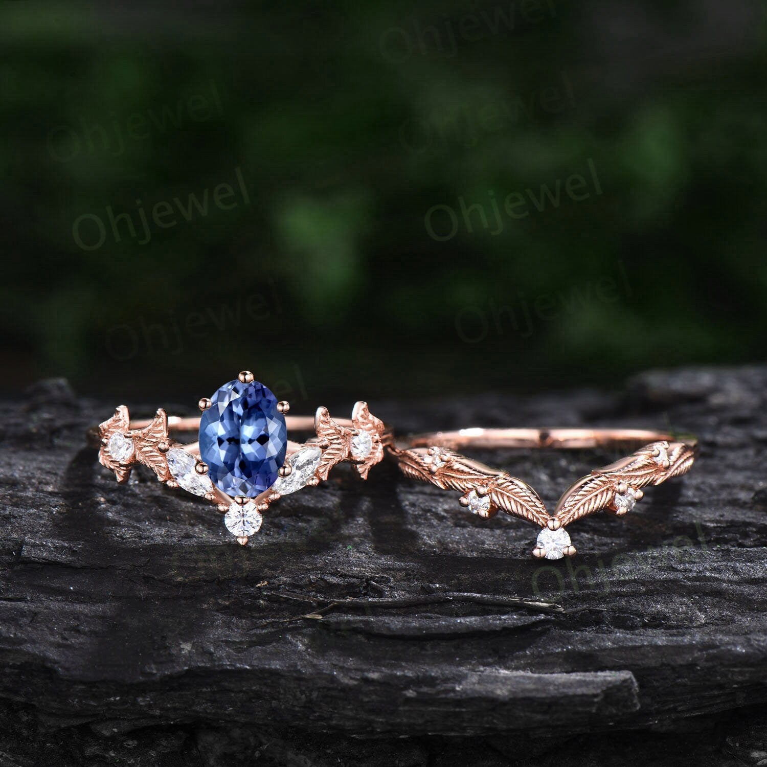 Twig oval cut natural Tanzanite engagement ring set rose gold branch leaf diamond ring art deco unique promise wedding ring set for women