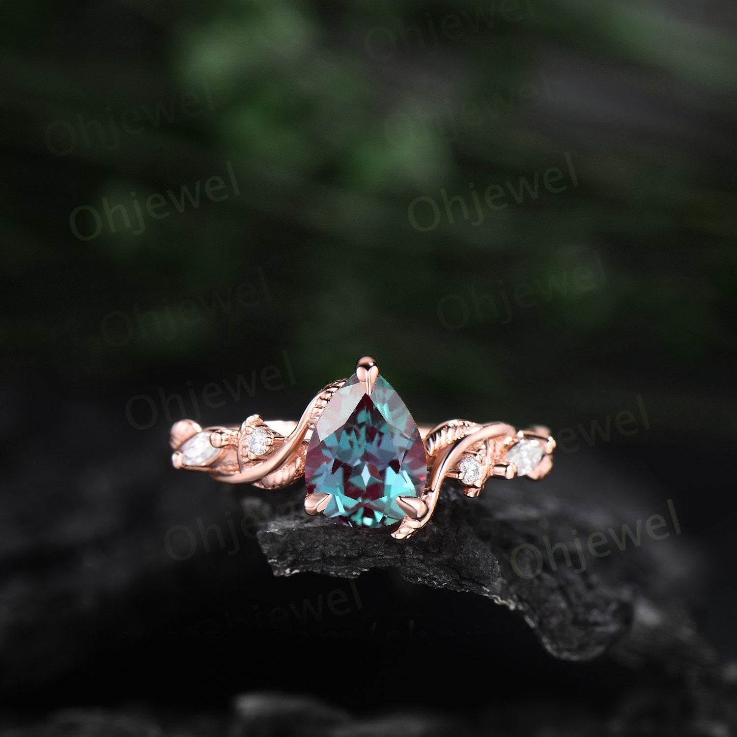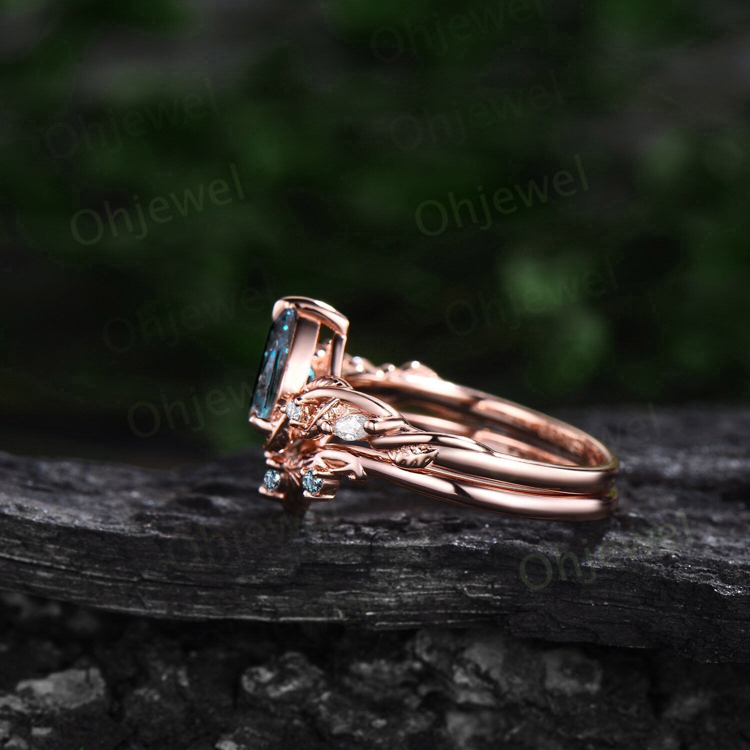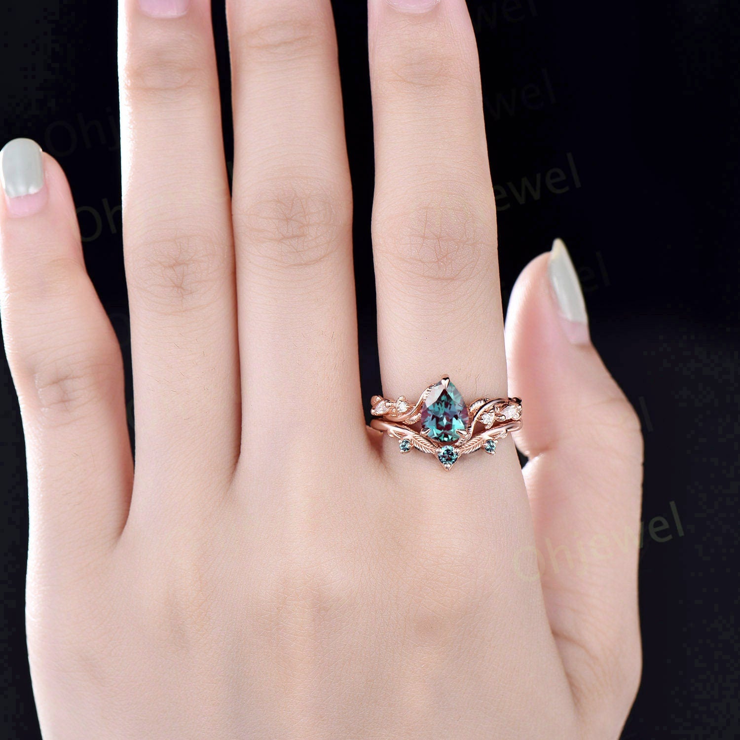 Twig pear shaped Alexandrite engagement ring five stone vintage branch leaf wedding ring set rose gold nature inspired diamond ring women