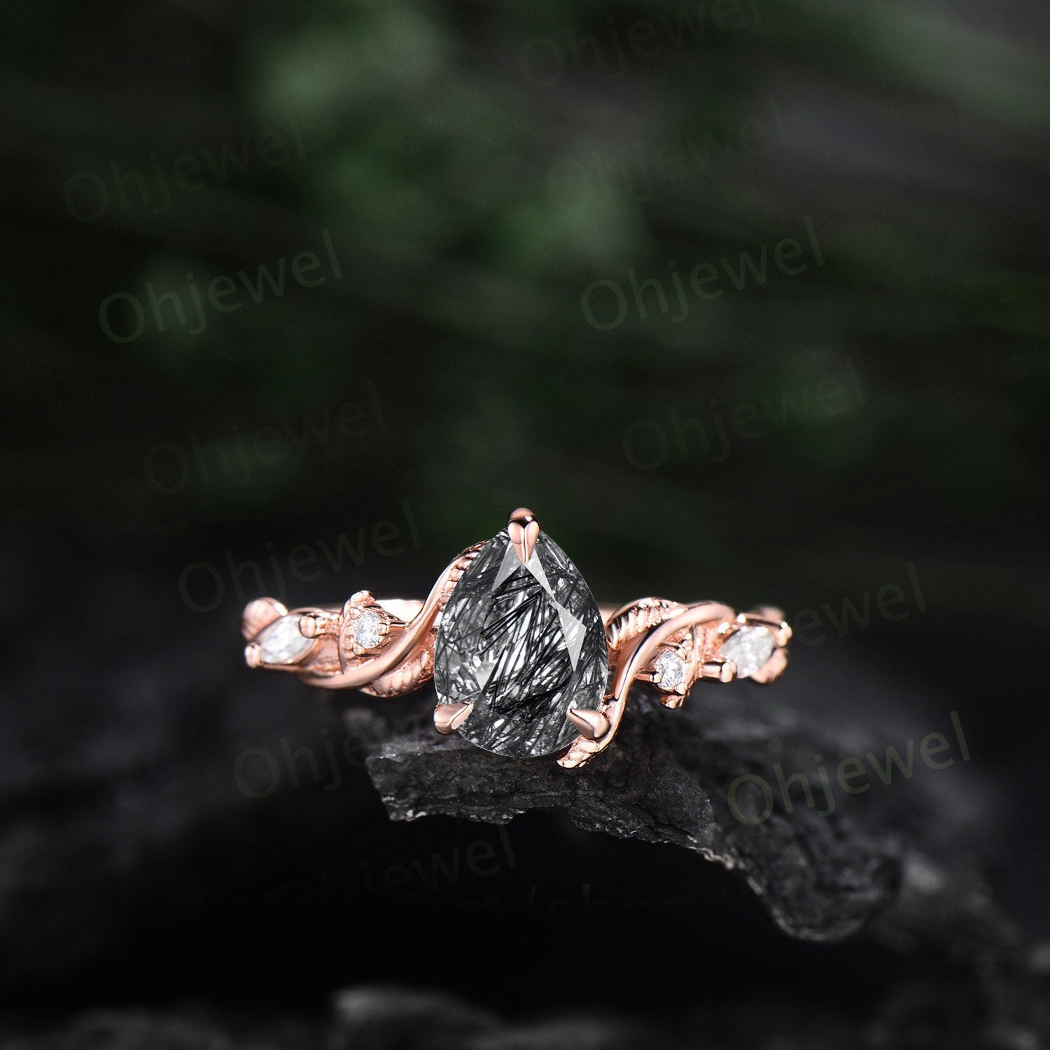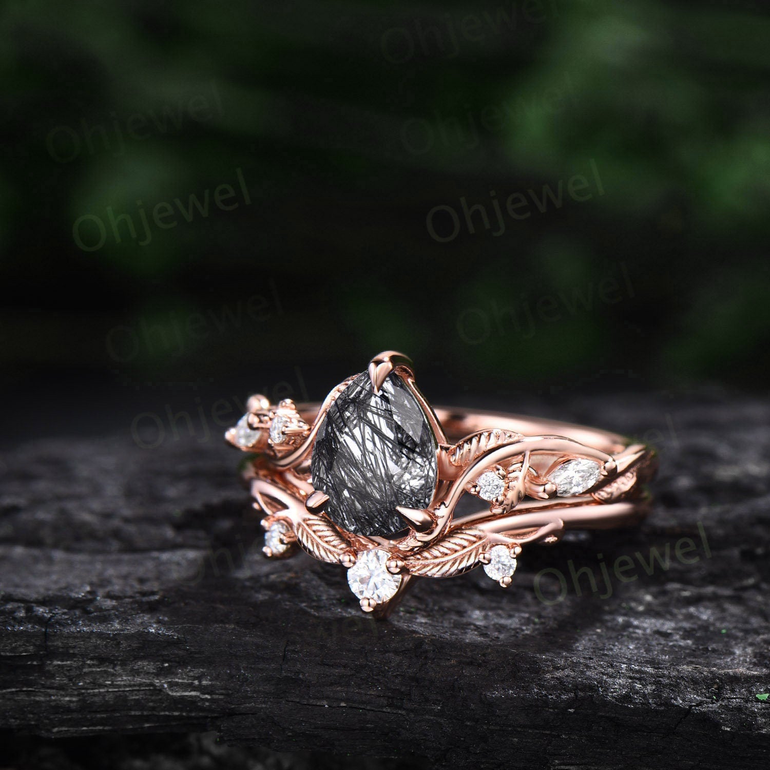 Twig pear shaped black rutilated quartz engagement ring vintage branch leaf rose gold nature inspired diamond bridal wedding ring set women