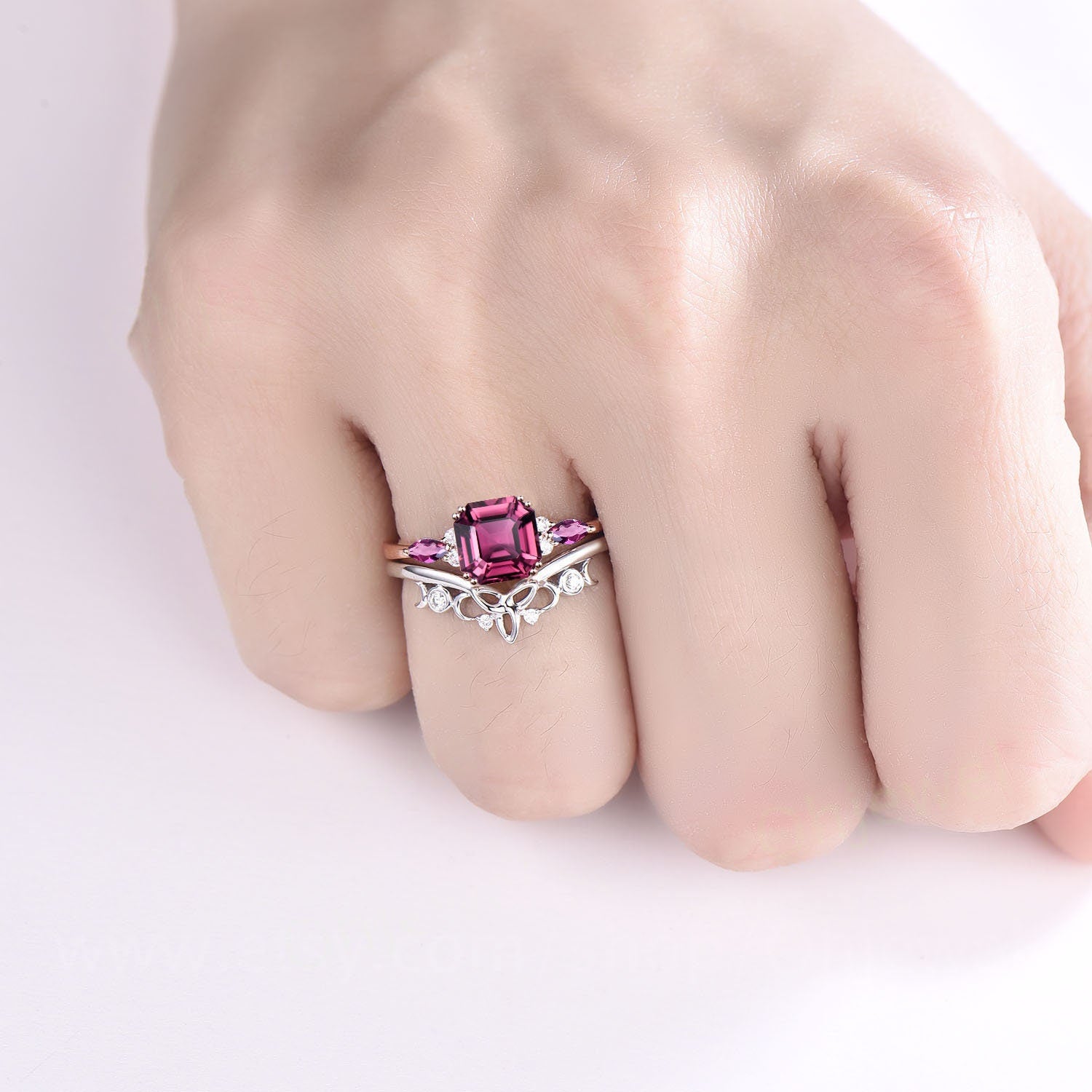 Unique Asscher cut Pink Tourmaline engagement ring set solid 14k rose gold art deco diamond wedding bridal ring set for women fine jewelry