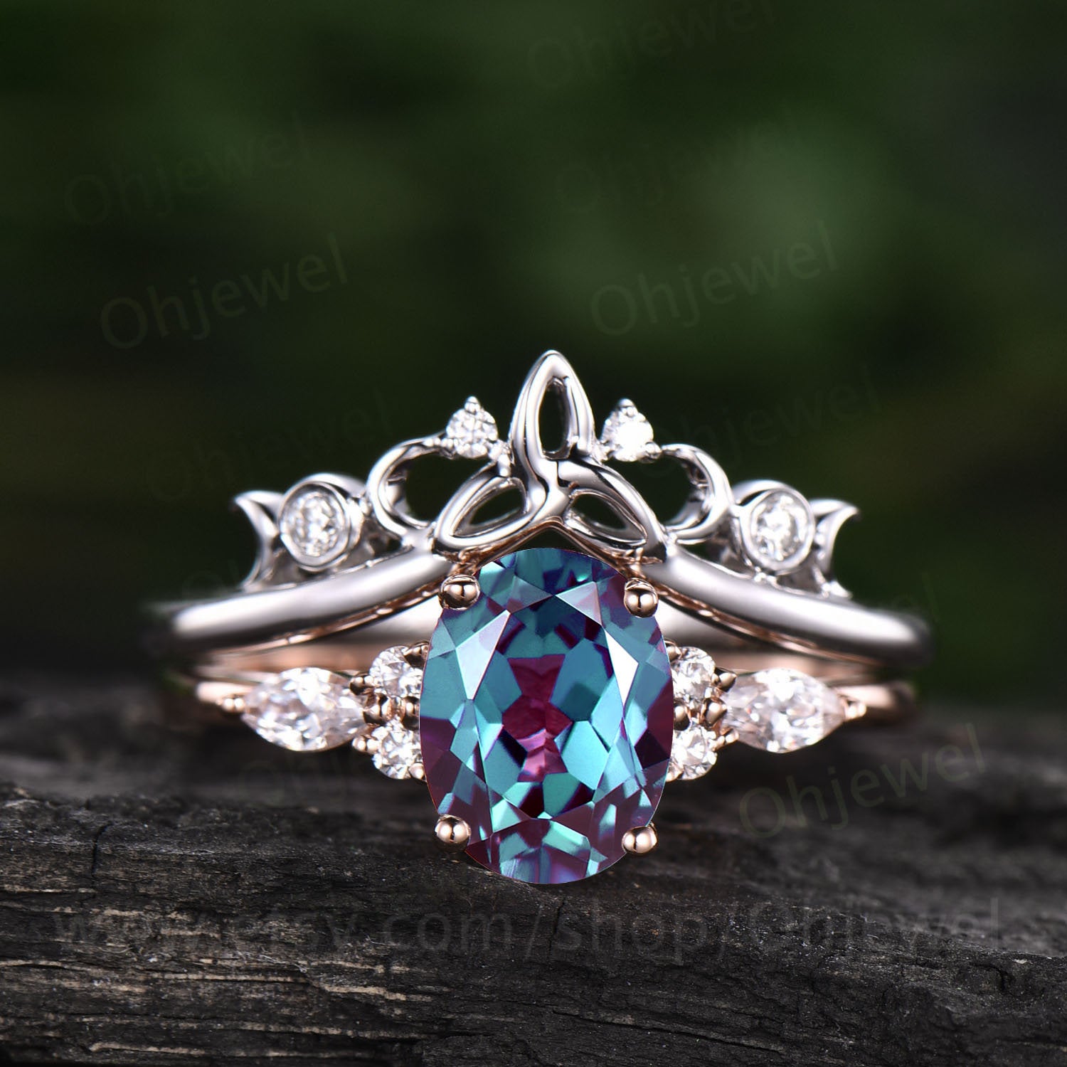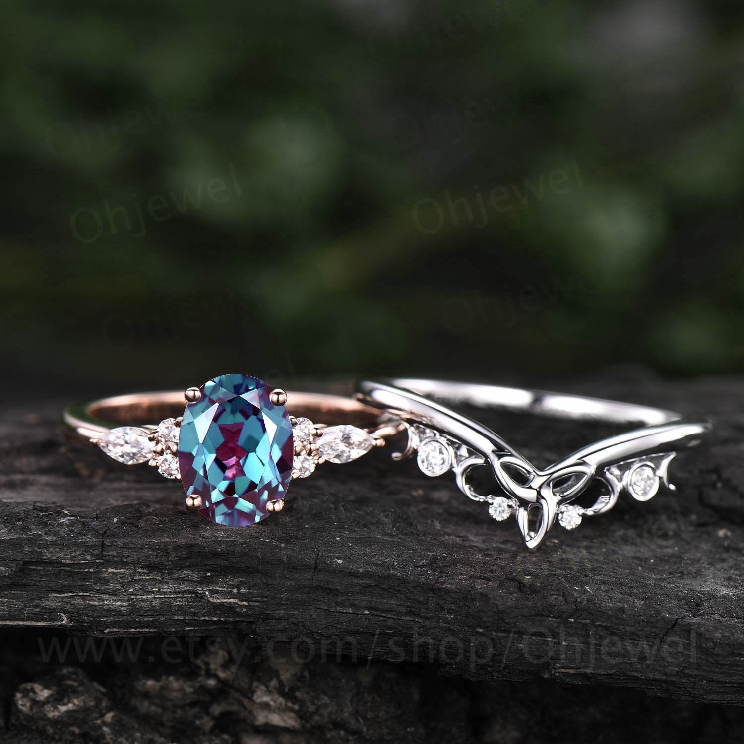 Unique bridal ring set oval cut Alexandrite engagement ring set vintage moissanite ring set rose gold women cluster marquise ring jewelry