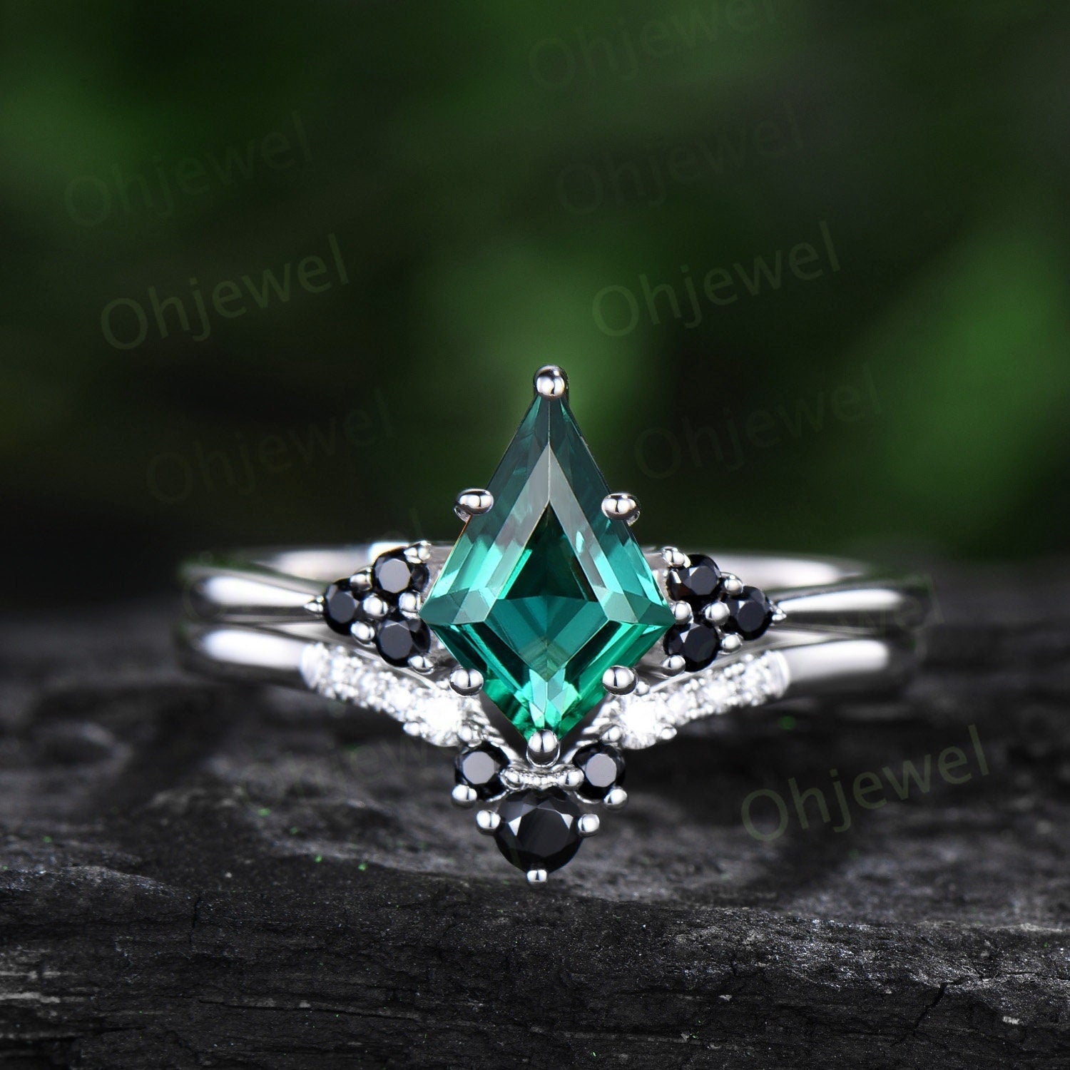Unique kite cut green emerald engagement ring solid 14k white gold black spinel moissanite Personalized promise anniversary ring women her