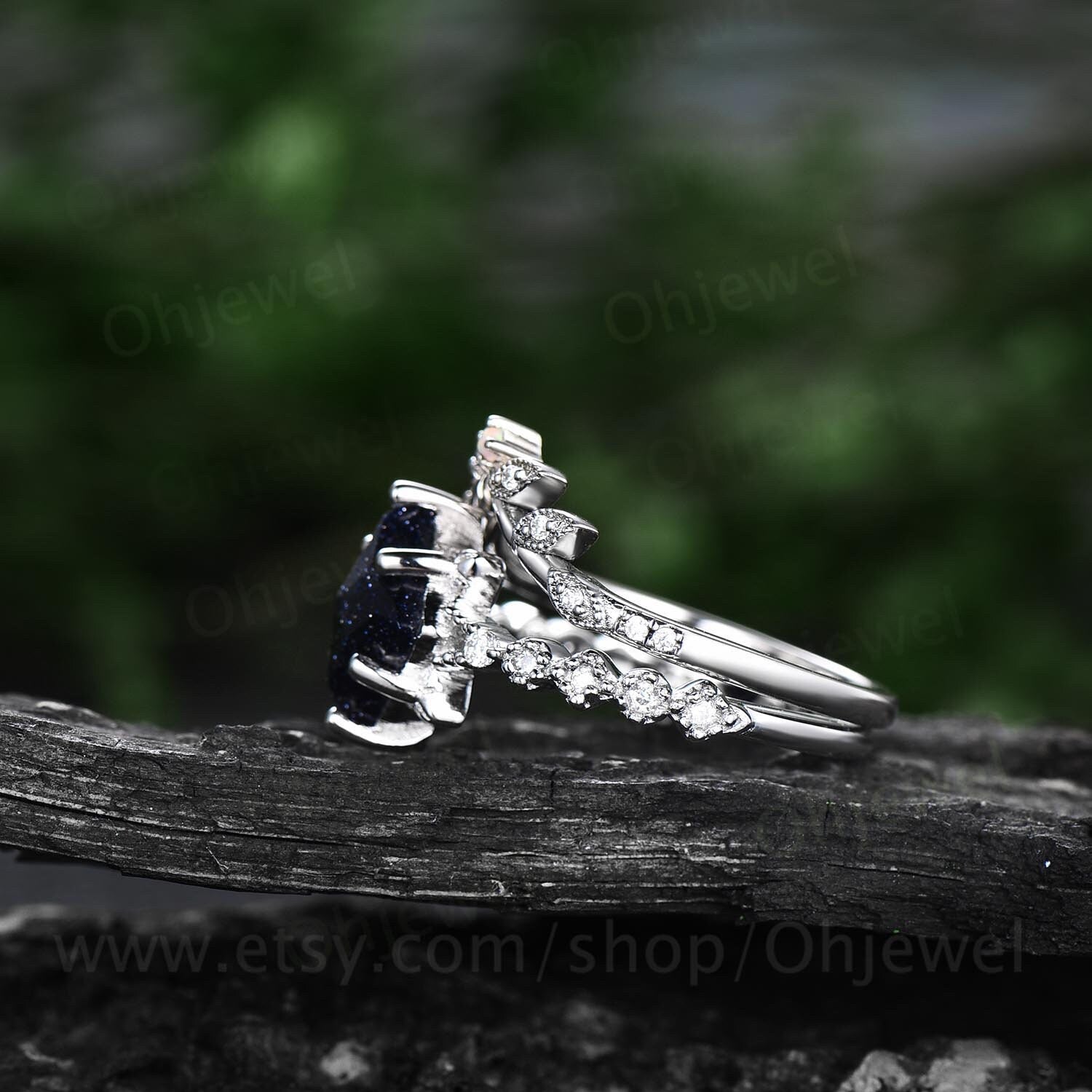 The matching band stones are moissanites and opal.
