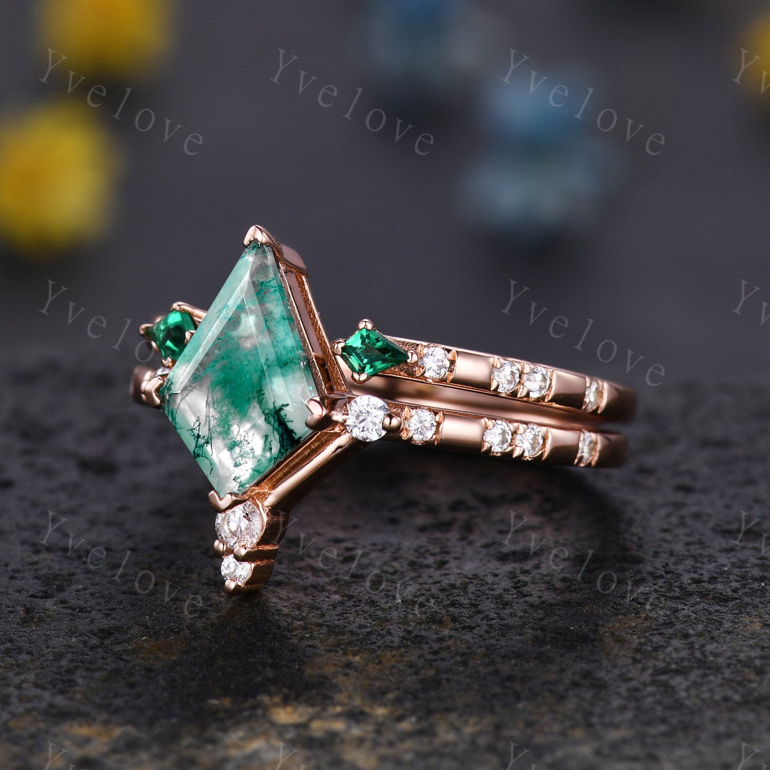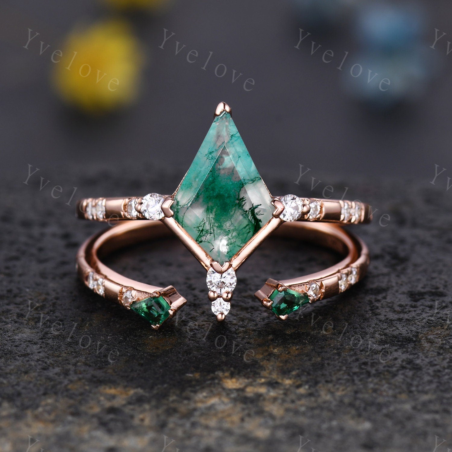 Unique Kite Shaped Moss Agate Engagement Ring,Vintage Natural Agate Ring,Emerald Open wedding Band Bridal set Anniversary Promise Ring