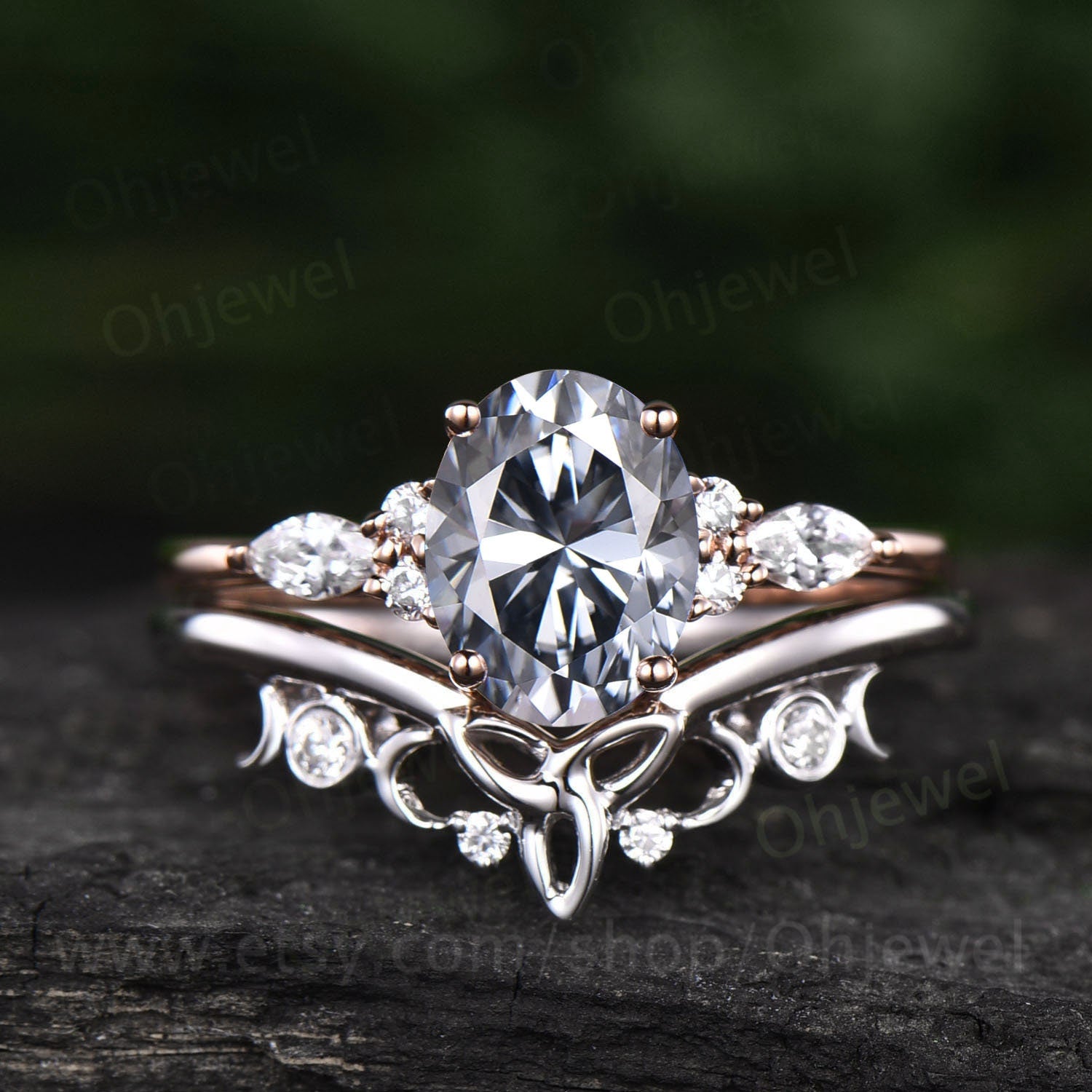 Unique oval cut gray moissanite engagement ring set rose gold vintage cluster marquise cut diamond promise wedding ring set for women gift