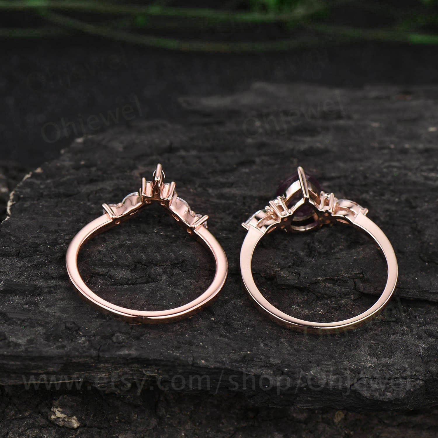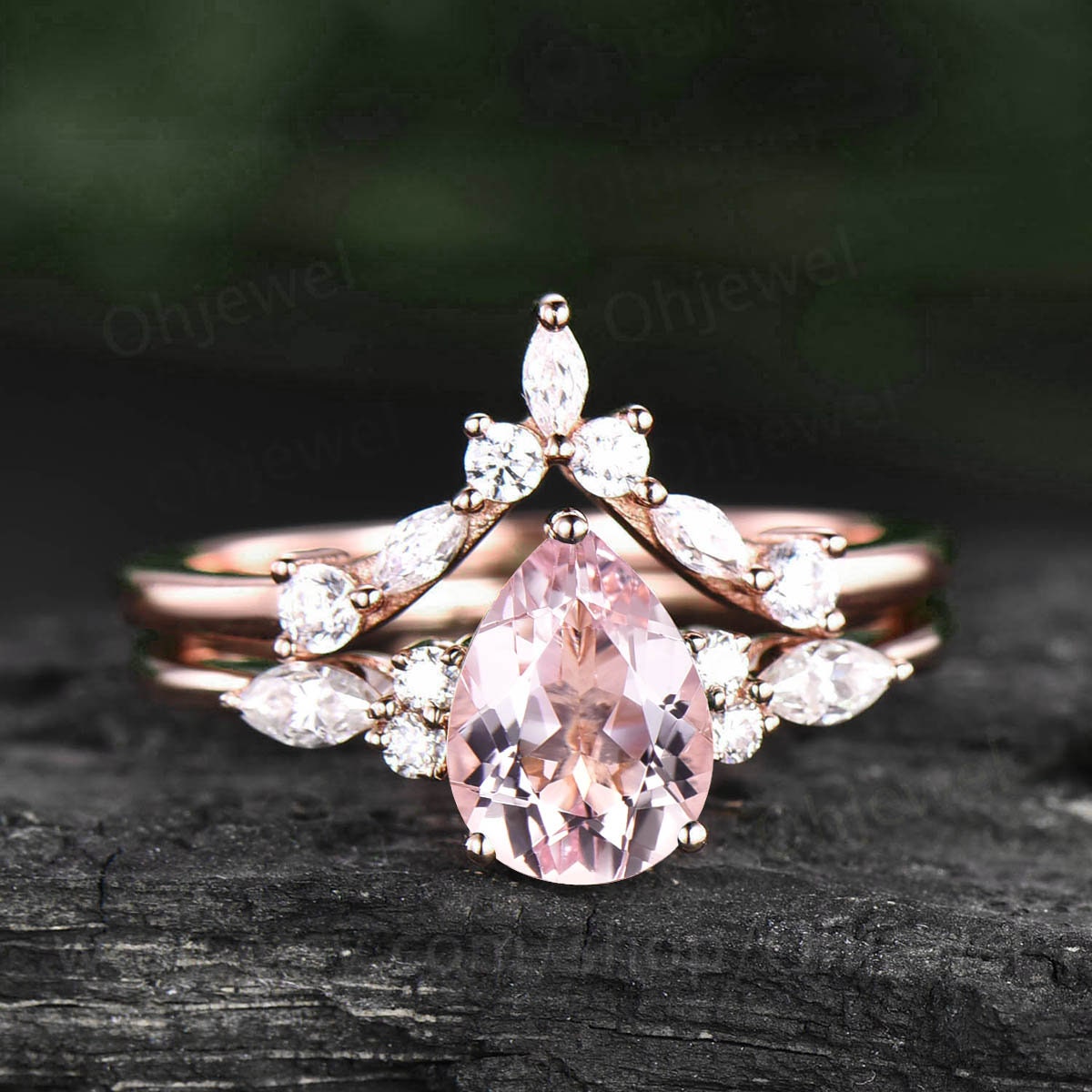 Unique pear shaped morganite engagement ring set rose gold art deco marquise moissanite ring Pink morganite ring for women bridal ring set