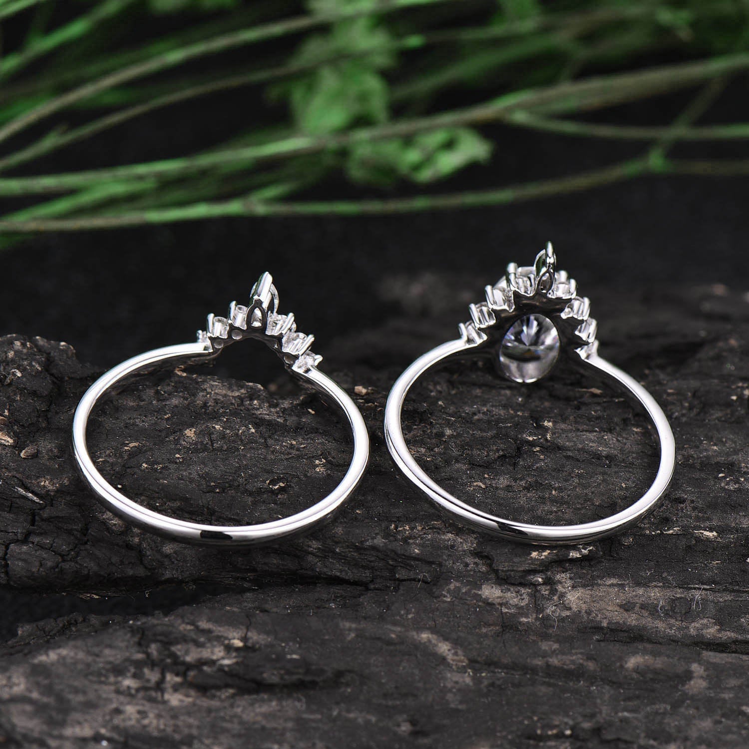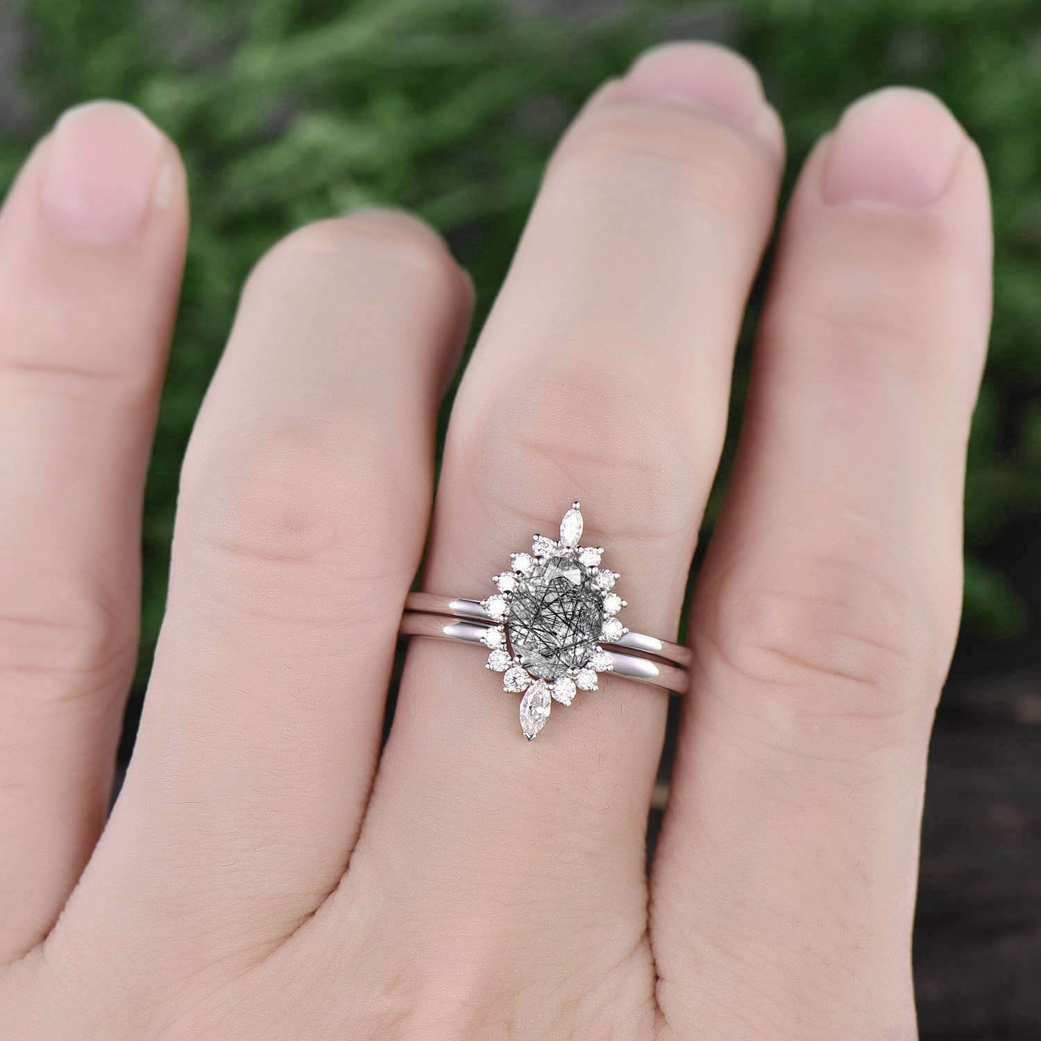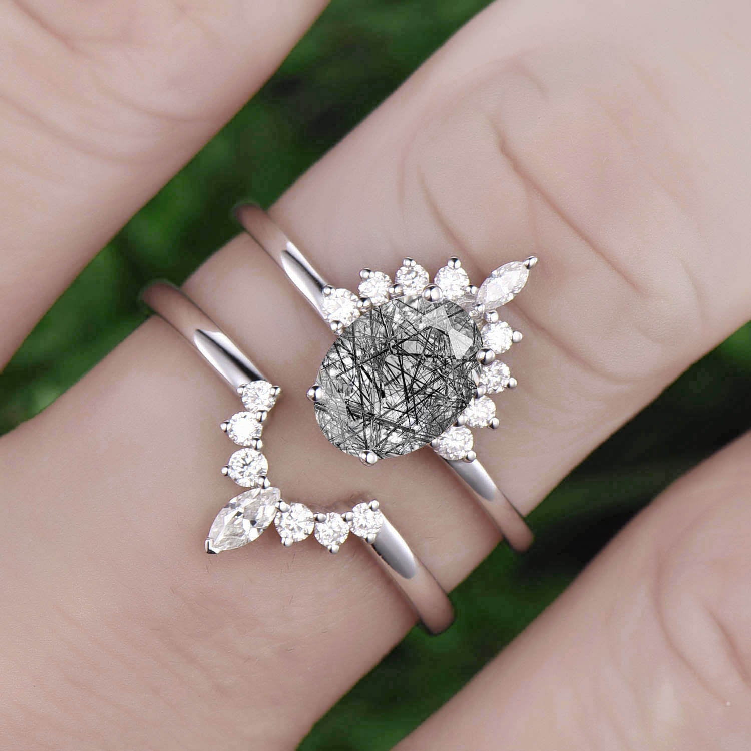 Unique vintage engagement ring set oval black rutilated quartz engagement ring set art deco halo ring set promise ring set wedding ring set