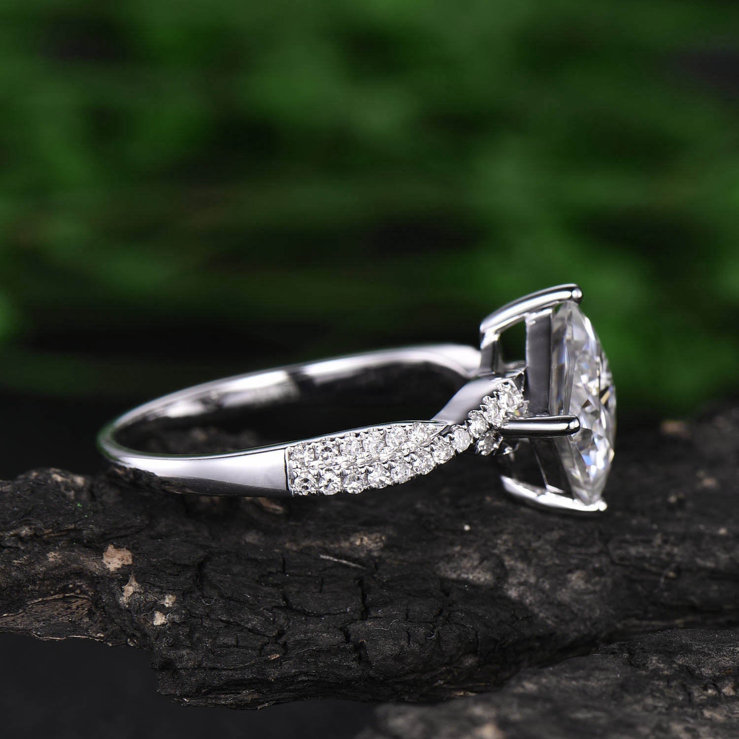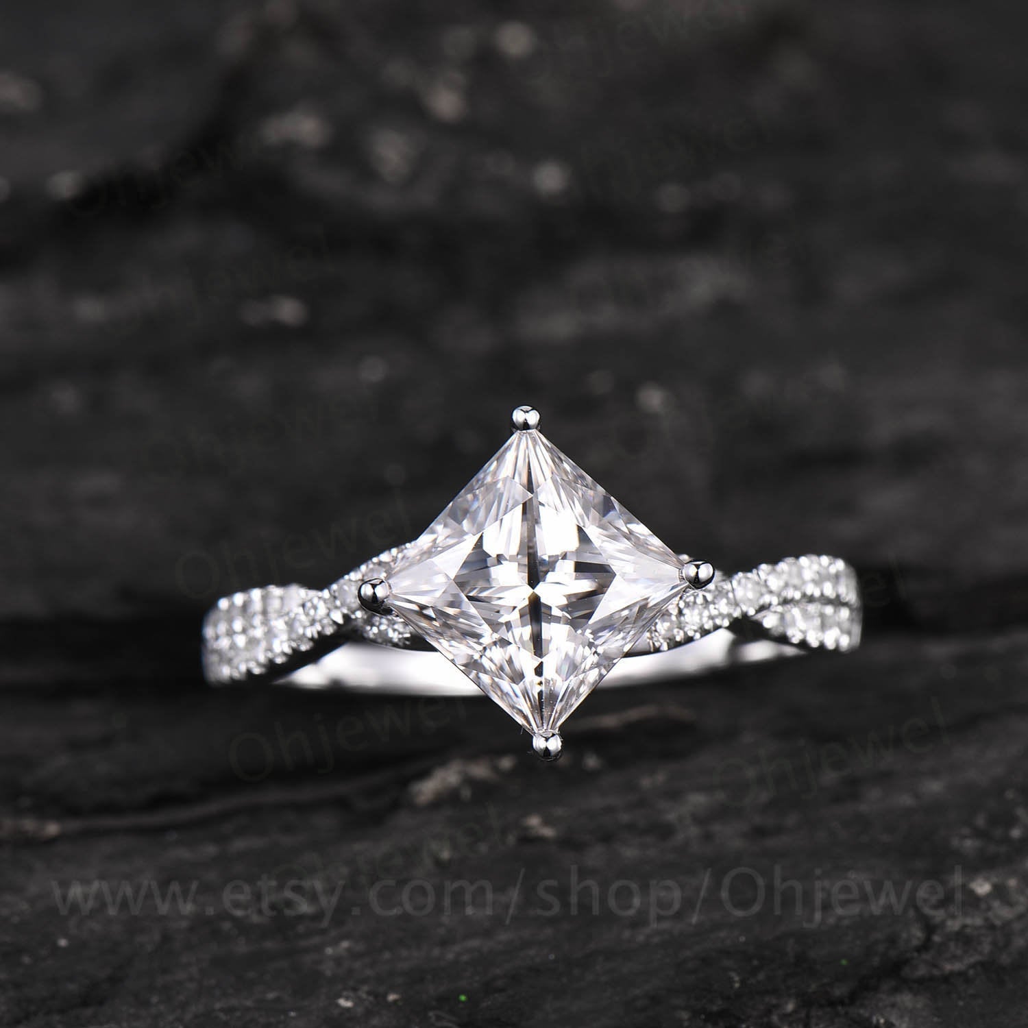This is a 2 carat moissanite engagement ring in solid gold,about 7mm princess cut. The accent stones are moissanties.