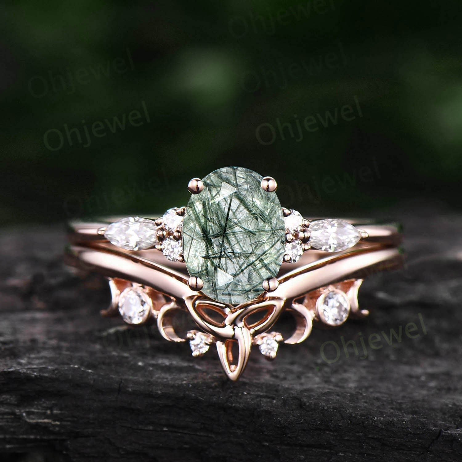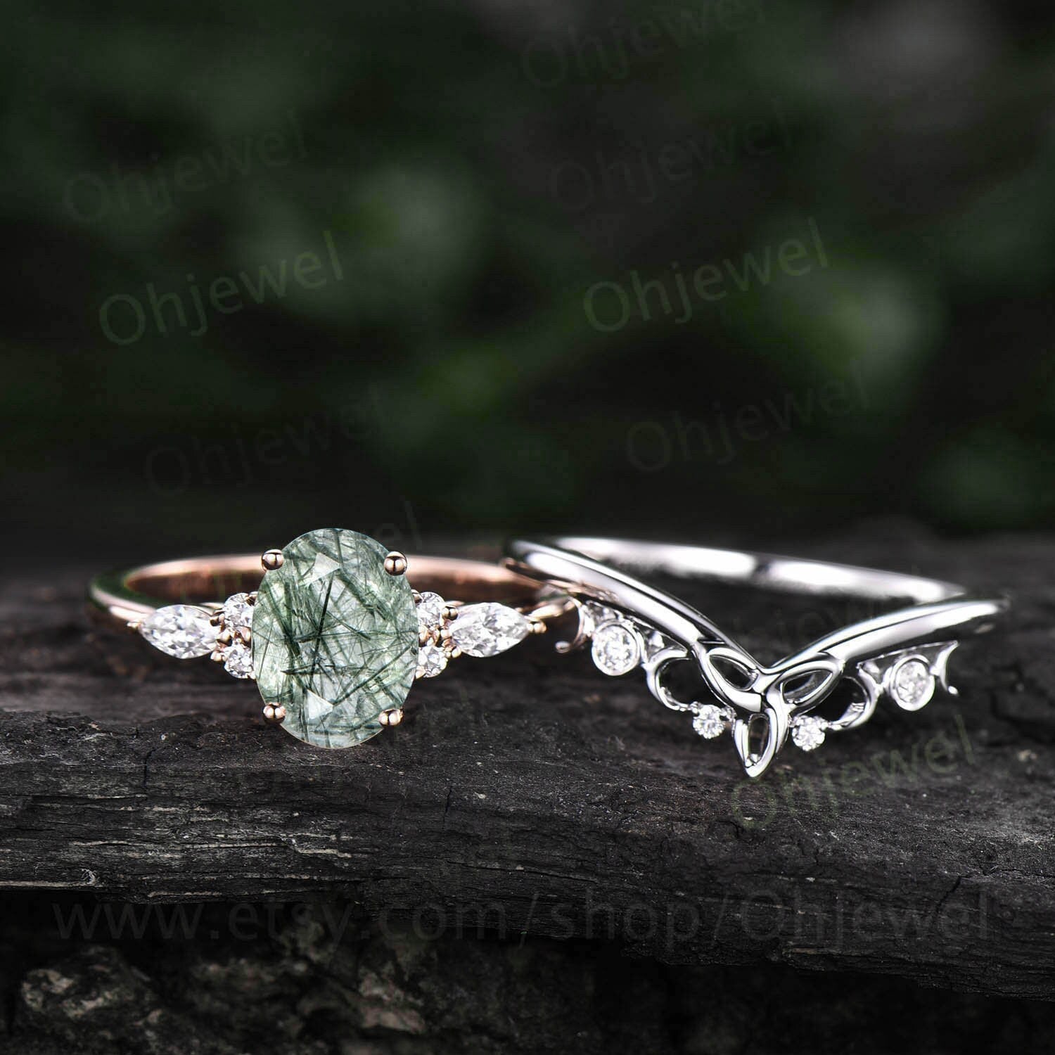 Unique wedding ring set oval cut green Rutilated Quartz engagement ring set women marquise diamond ring 14k rose gold promise ring gifts