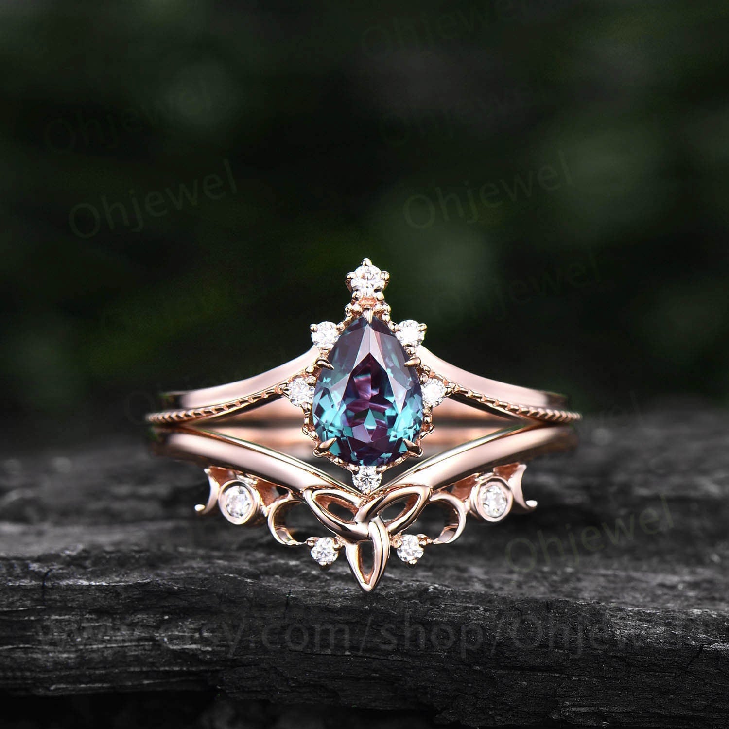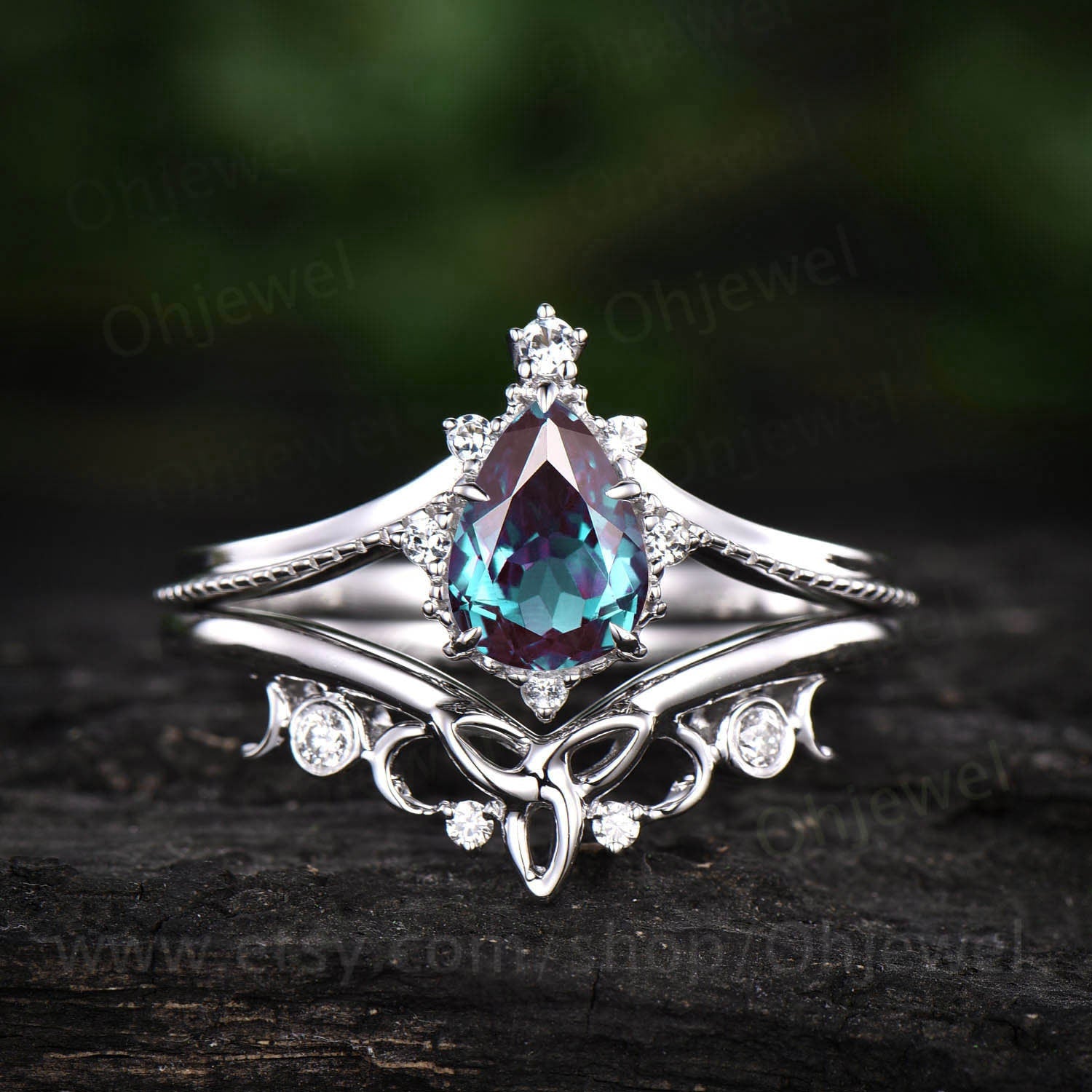 Unique wedding ring set Pear shaped alexandrite engagement ring set white gold vintage moissanite ring for women norse viking ring Jewelry