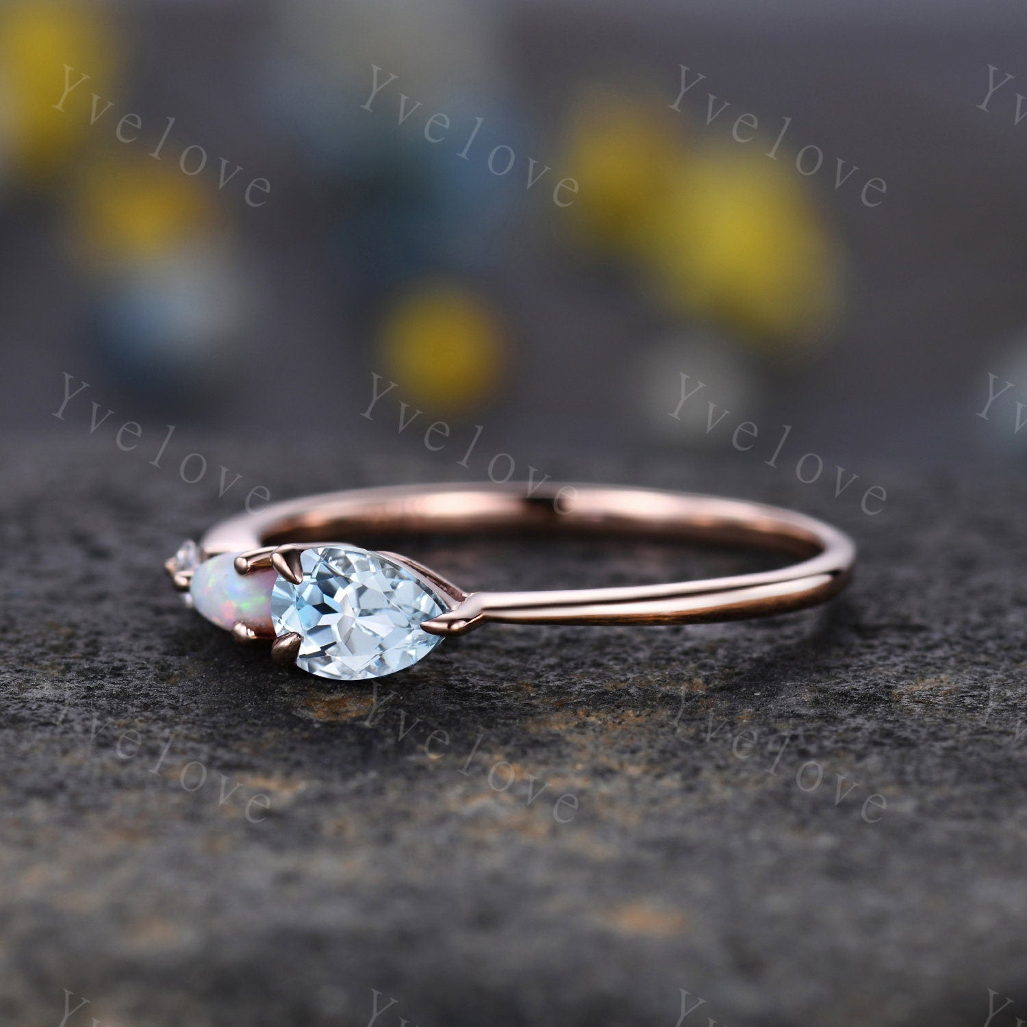 Vintage Aquamarine Opal Engagement Ring,Pear Cut Gems,Art Deco Moissanite Wedding Band,3 Stone Unique Women Bridal Promise Ring,Customized Ring gift