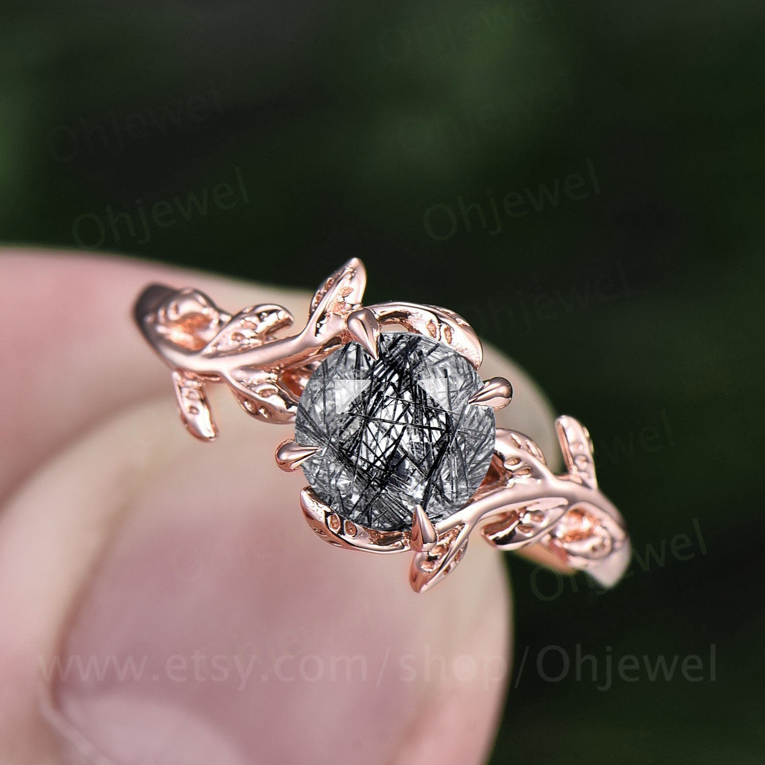 This is a black rutilated quartz engagement ring in solid gold,about 6.5mm round cut.